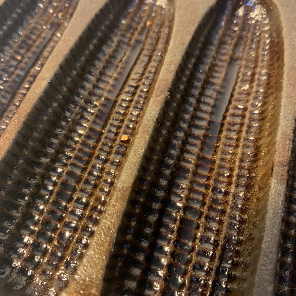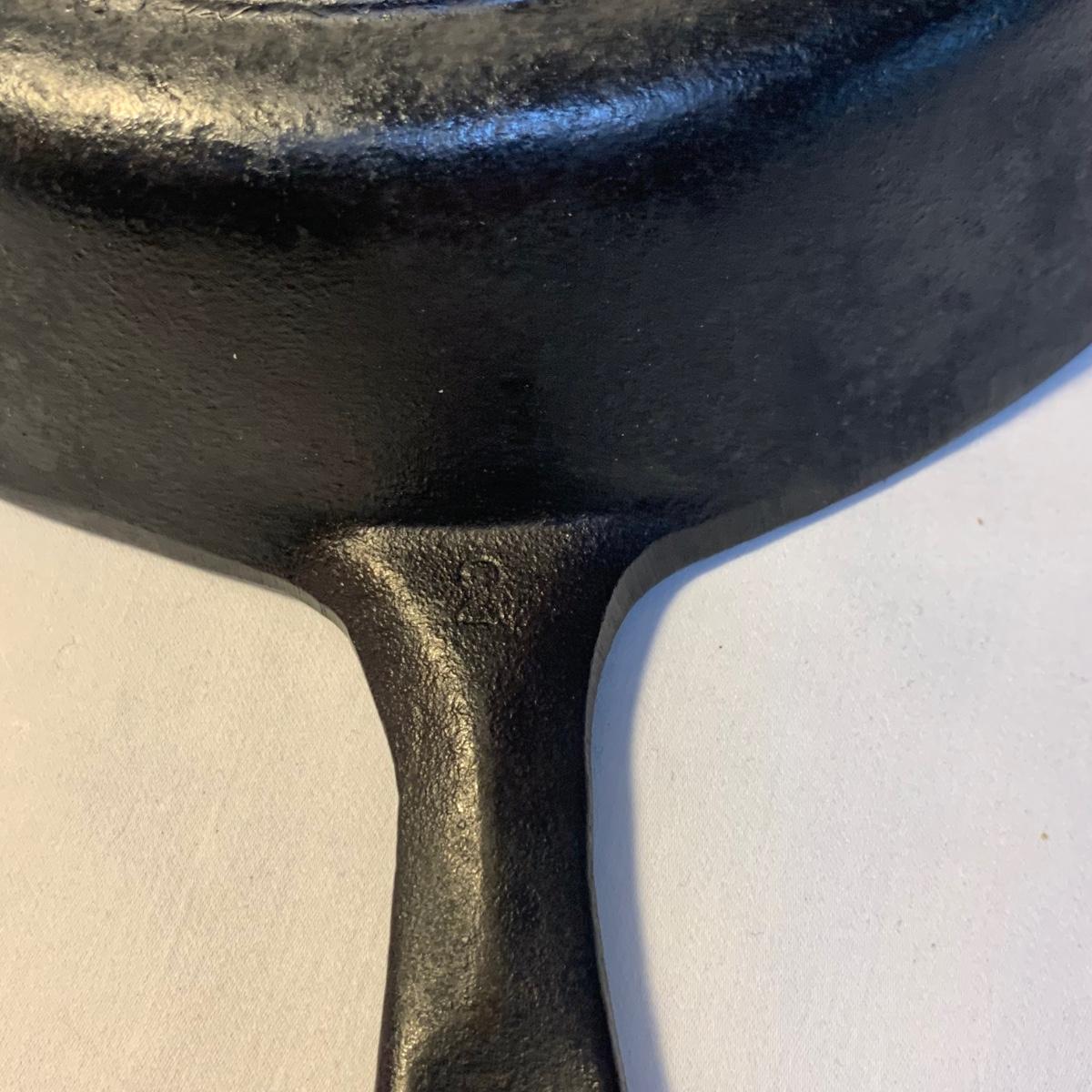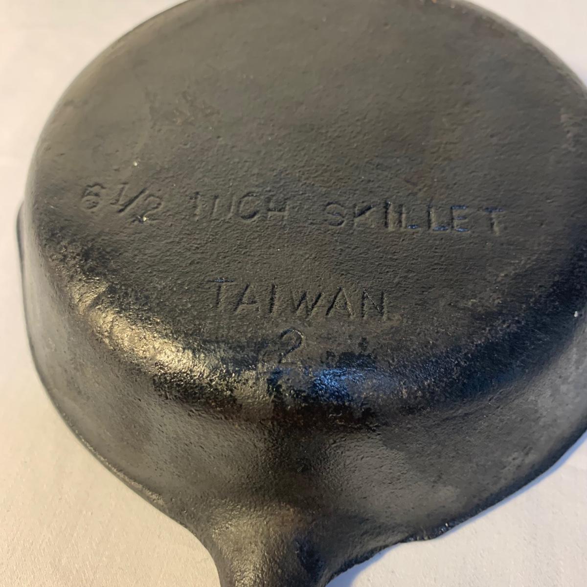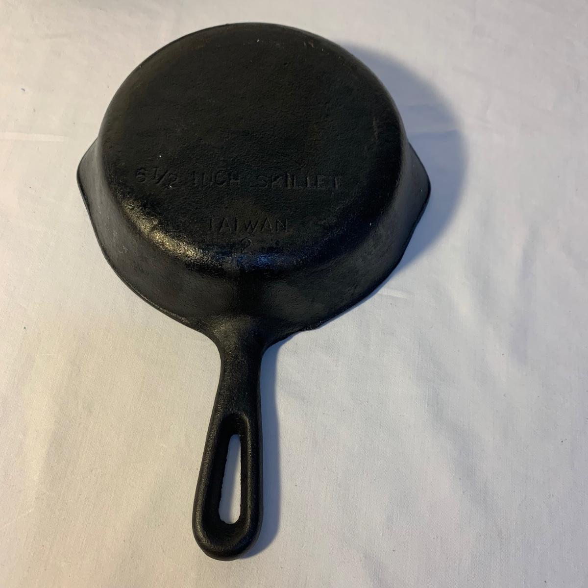 Three cast iron skillets and two cast iron corn molds. The largest skillet is 8”D. The smallest is 6”D. One of the corn molds is quite sticky inside, likely from oil. All will need cleaning and conditioning before use.