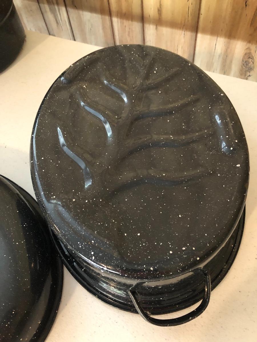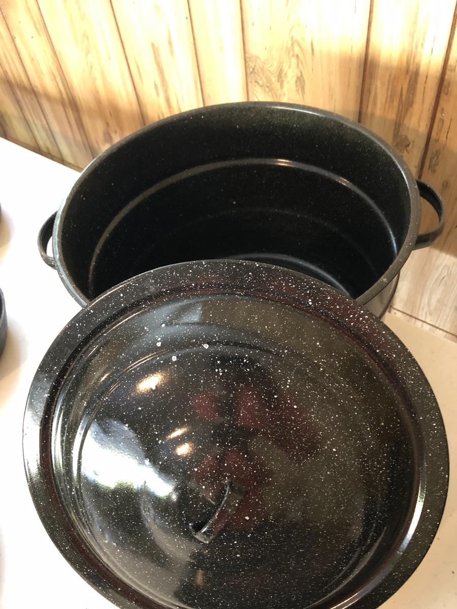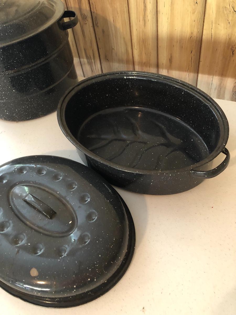 This lot includes three cast iron skillets (10.5”, 10” and 6.5”), a griddle (17.5” x 9”) and two enamel pots. The tall pot is 14” in diameter and is 9.5” tall. The oblong pot is 12.5” x 16.5” and is 4.5” tall. Shipping Available.