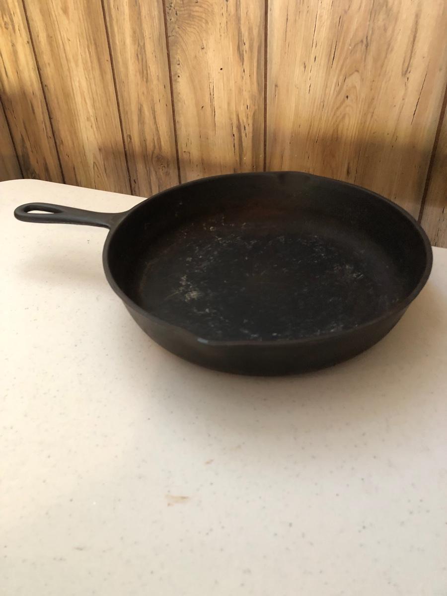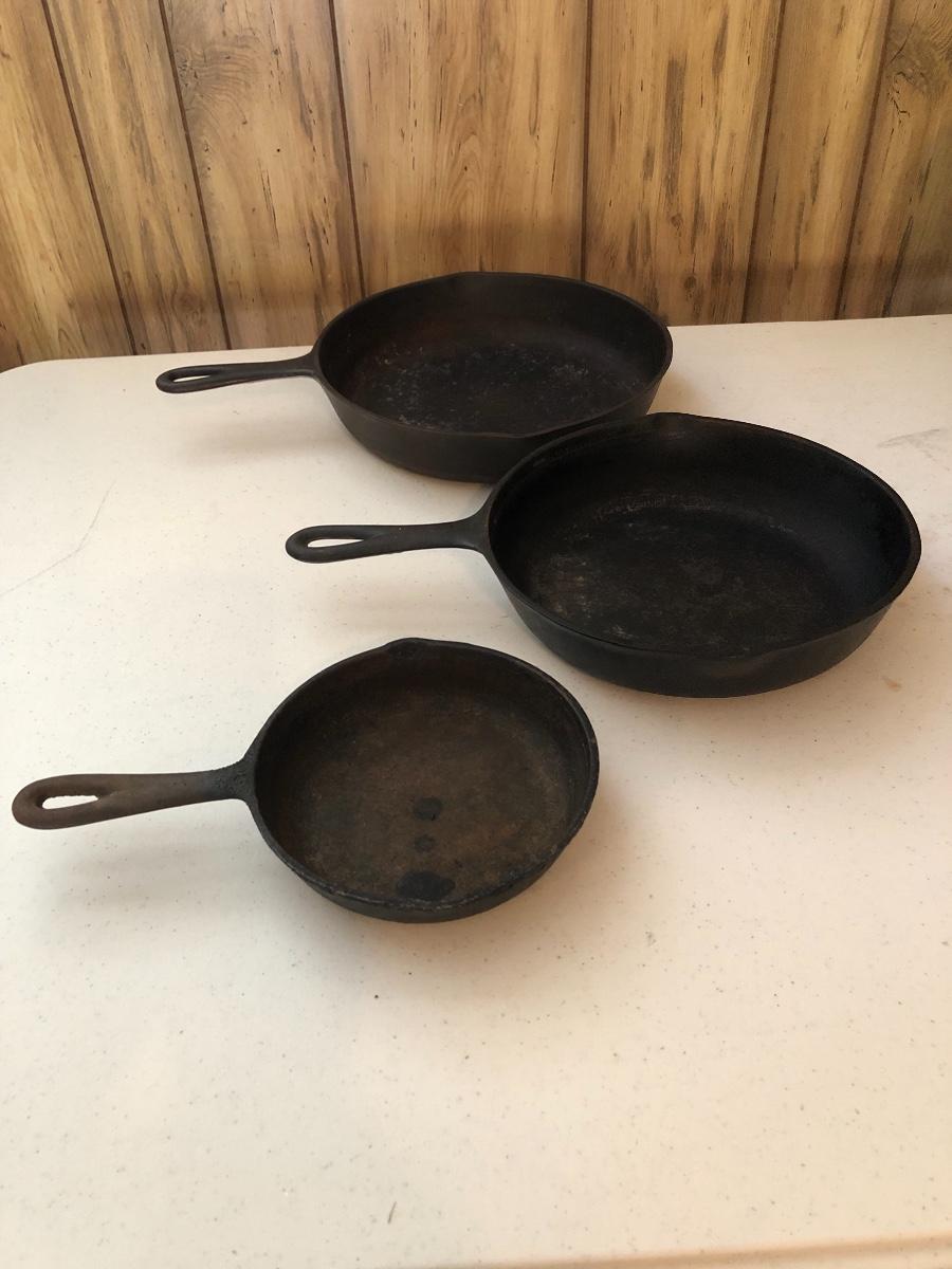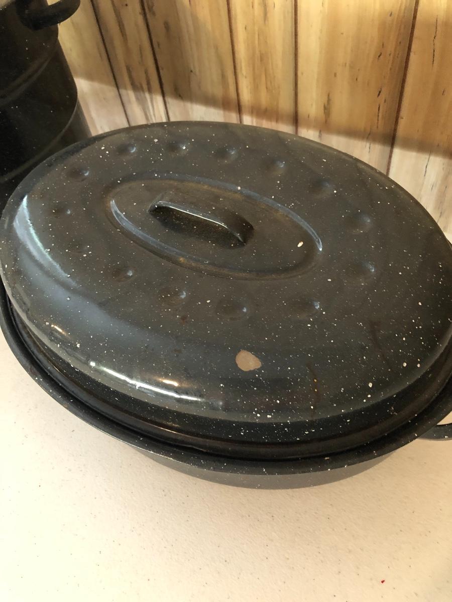 This lot includes three cast iron skillets (10.5”, 10” and 6.5”), a griddle (17.5” x 9”) and two enamel pots. The tall pot is 14” in diameter and is 9.5” tall. The oblong pot is 12.5” x 16.5” and is 4.5” tall. Shipping Available.