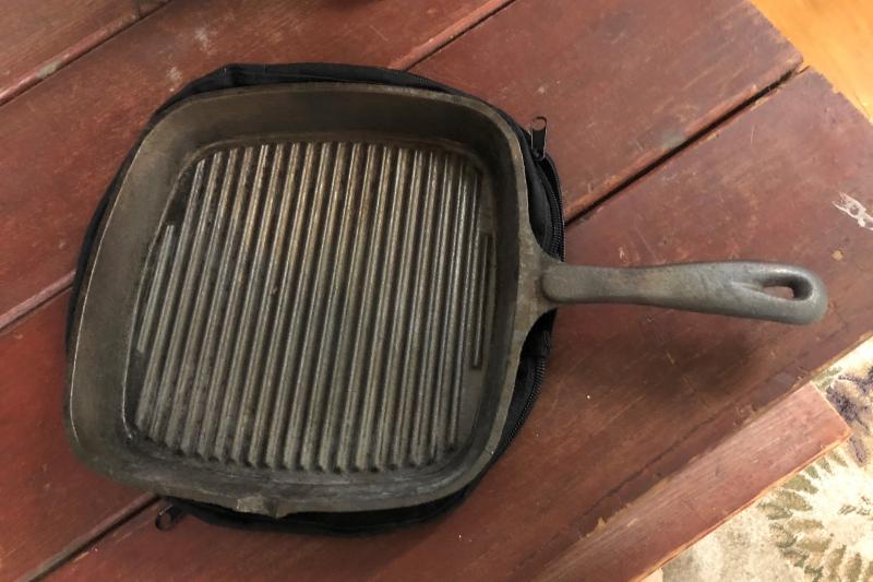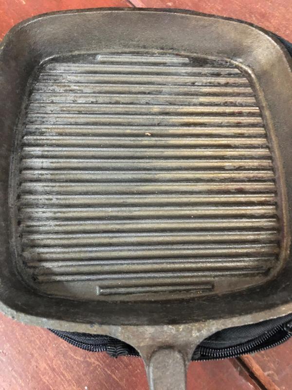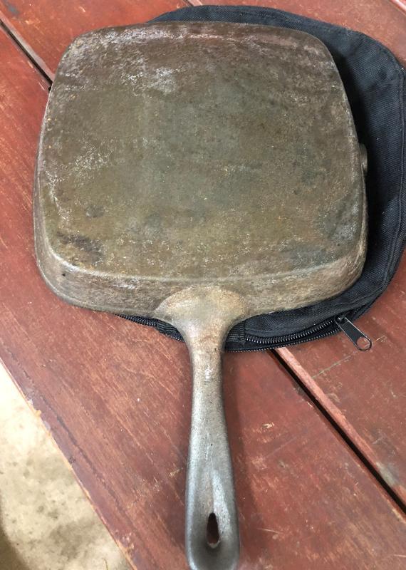 Good condition on this square cast iron pan with ridges..9" with soft cover...