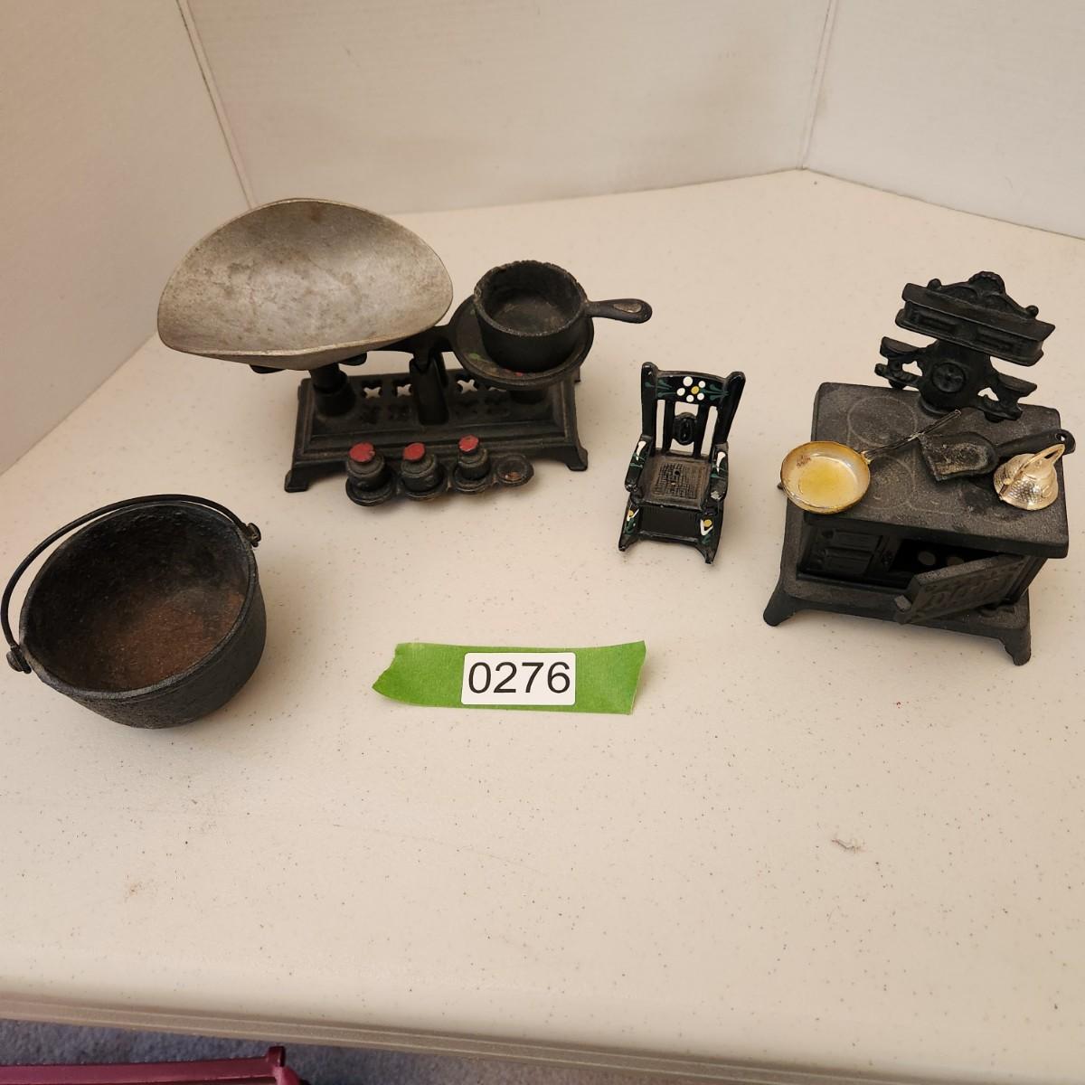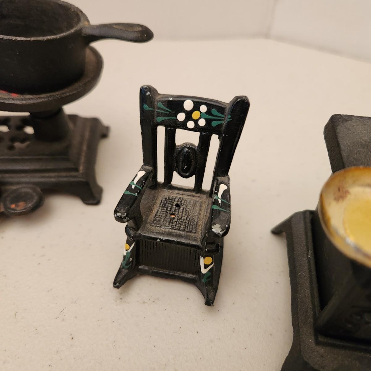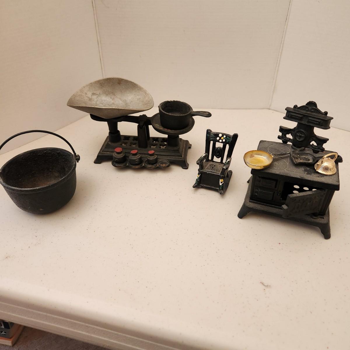 Cast Iron Toys Scale, Stove, Rocking Chair, Pot