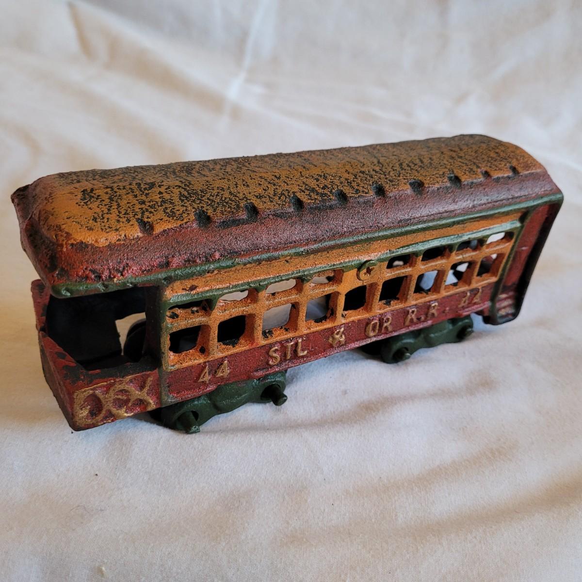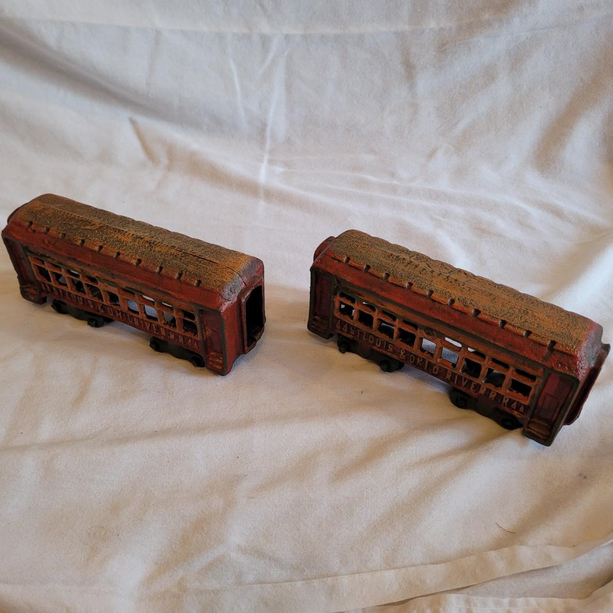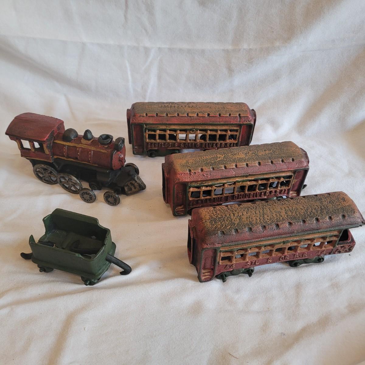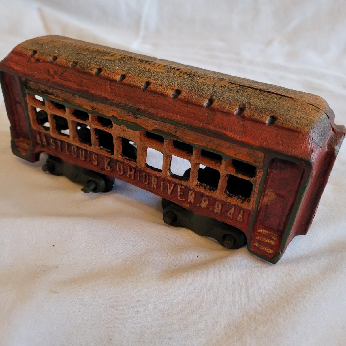 Set of five vintage cast iron toy train cars, specifically cars from the St. Louis & Ohio River Railroad. The original manufacturer is not explicitly stated, but Wilkins is a known maker of cast iron trains from that era. set includes locomotive, coal car, passenger cars, and caboose. Individual cars connect with metal hooks to form full train. Passenger cars measure 8.5" x 3" x 3.5"H.