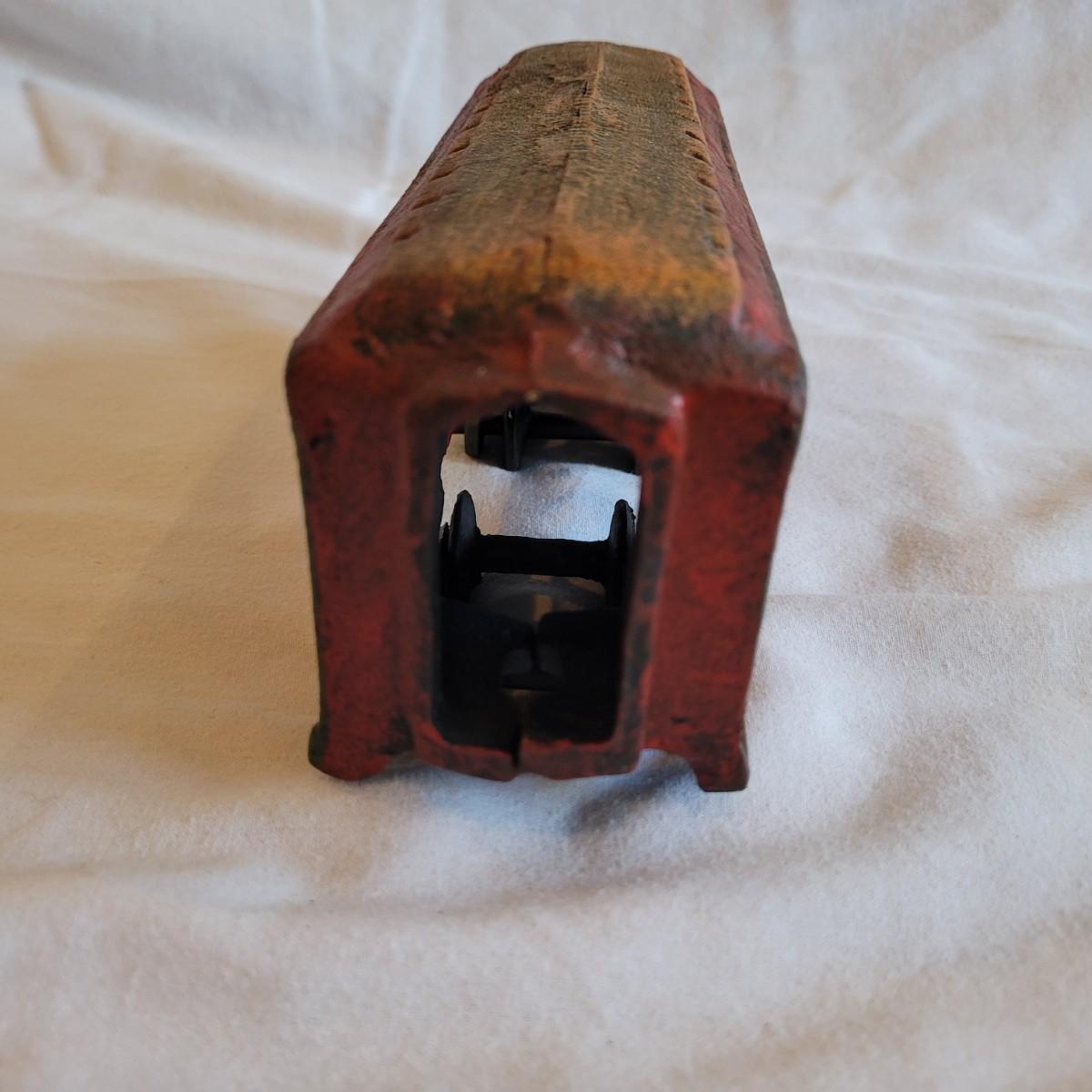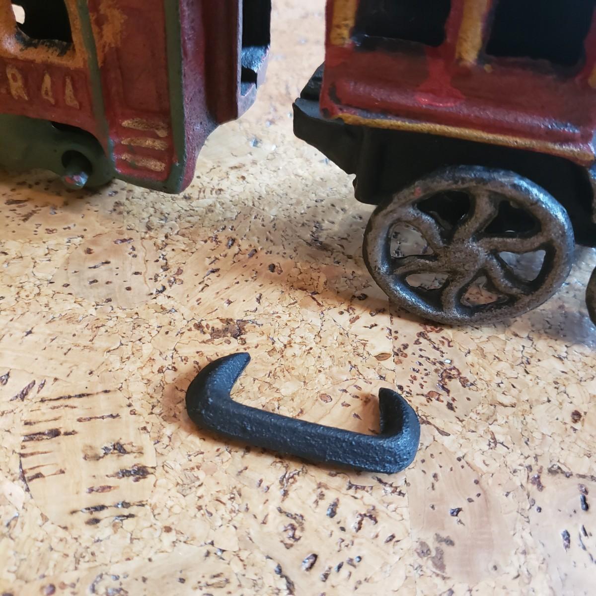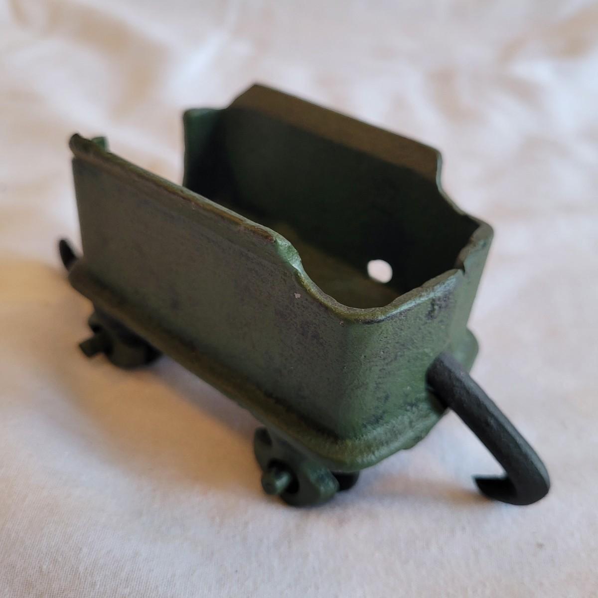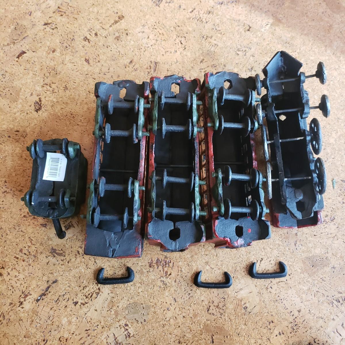 Set of five vintage cast iron toy train cars, specifically cars from the St. Louis & Ohio River Railroad. The original manufacturer is not explicitly stated, but Wilkins is a known maker of cast iron trains from that era. set includes locomotive, coal car, passenger cars, and caboose. Individual cars connect with metal hooks to form full train. Passenger cars measure 8.5" x 3" x 3.5"H.