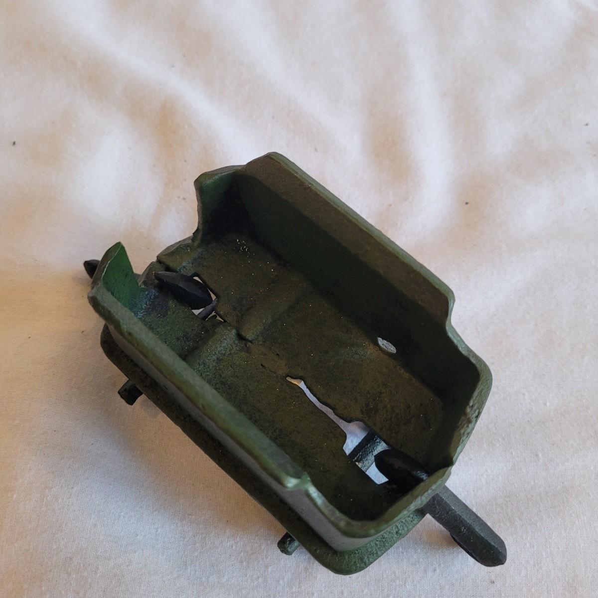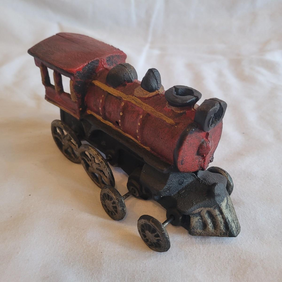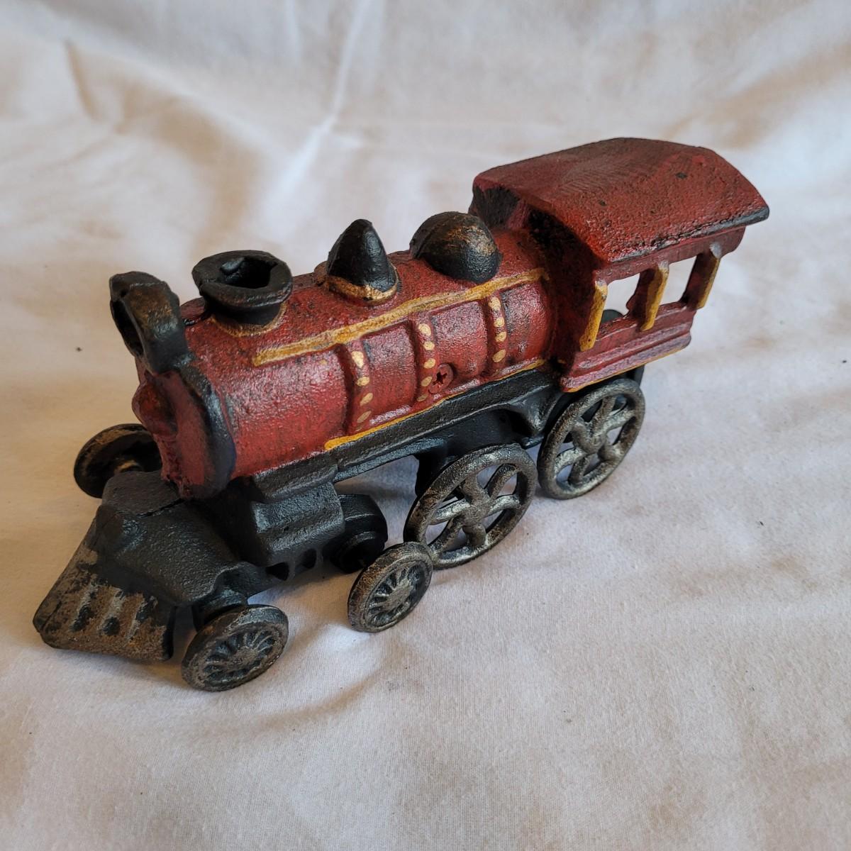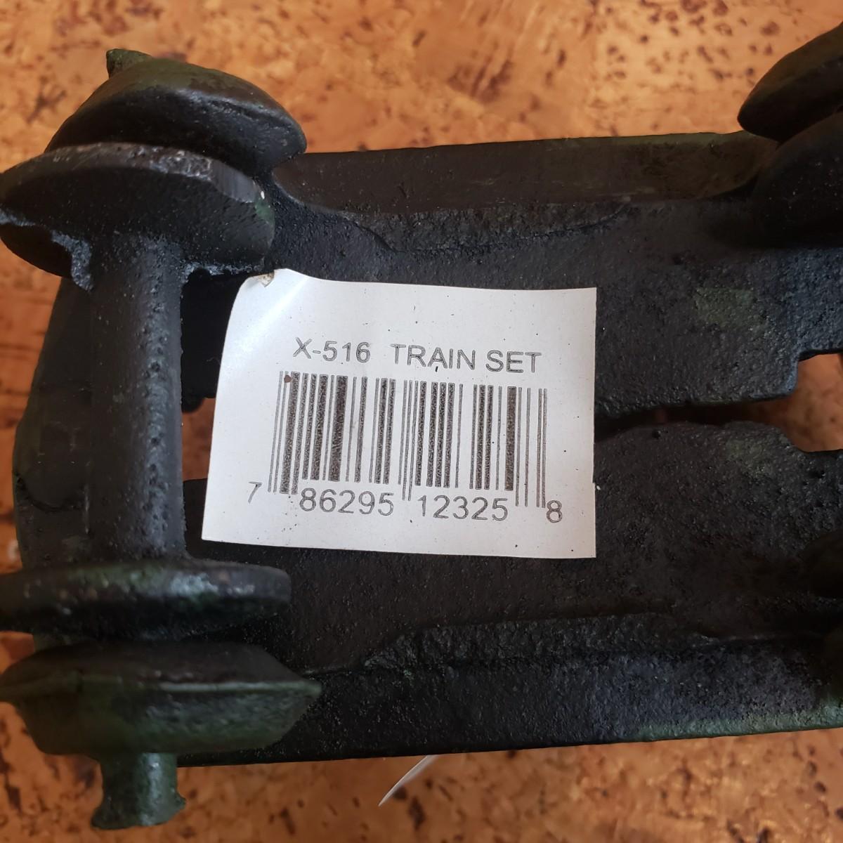 Set of five vintage cast iron toy train cars, specifically cars from the St. Louis & Ohio River Railroad. The original manufacturer is not explicitly stated, but Wilkins is a known maker of cast iron trains from that era. set includes locomotive, coal car, passenger cars, and caboose. Individual cars connect with metal hooks to form full train. Passenger cars measure 8.5" x 3" x 3.5"H.