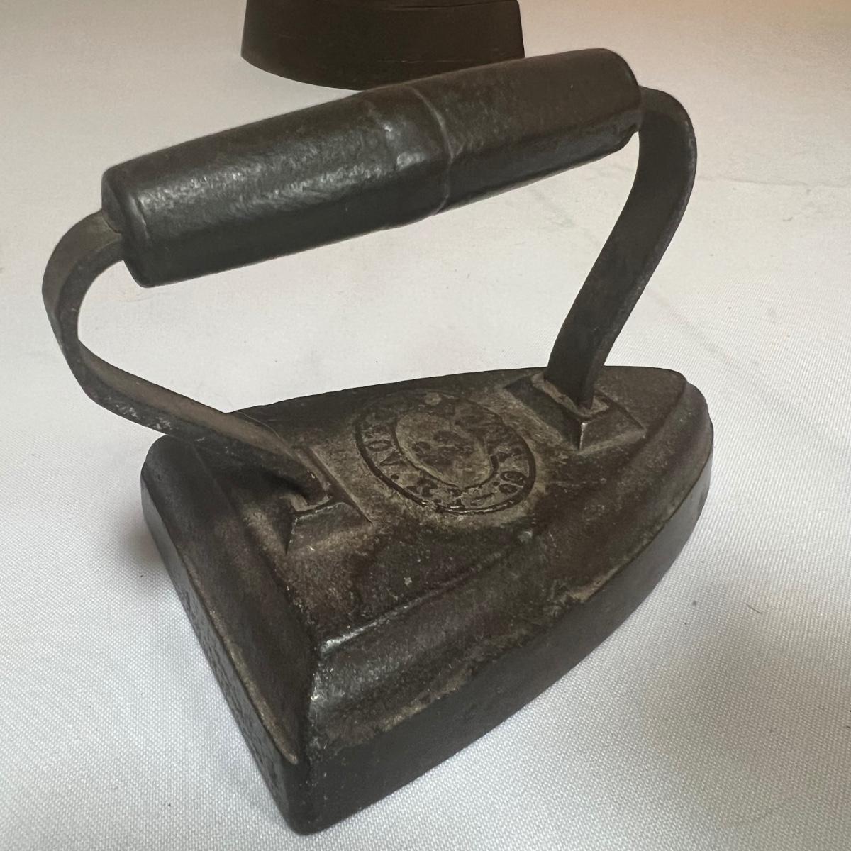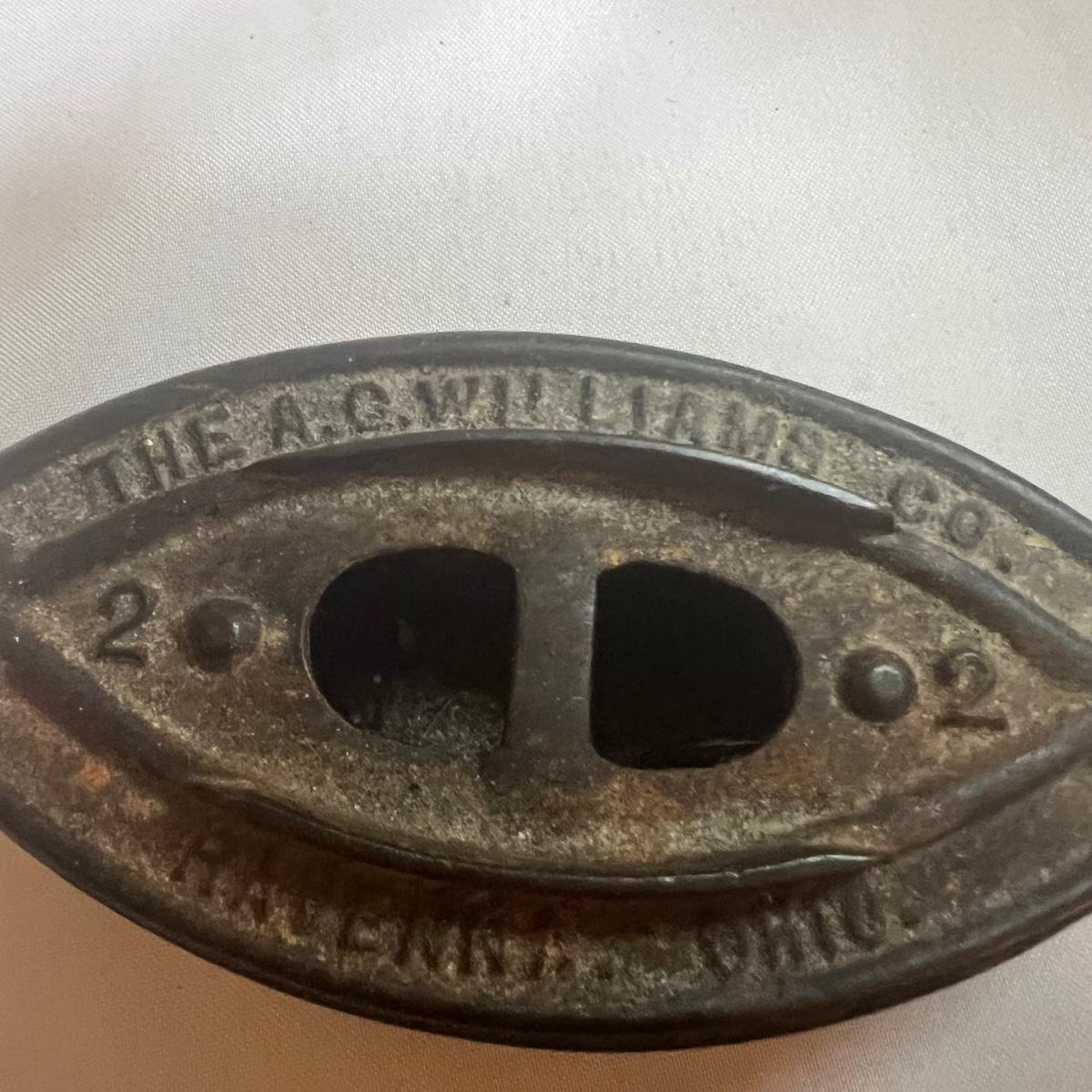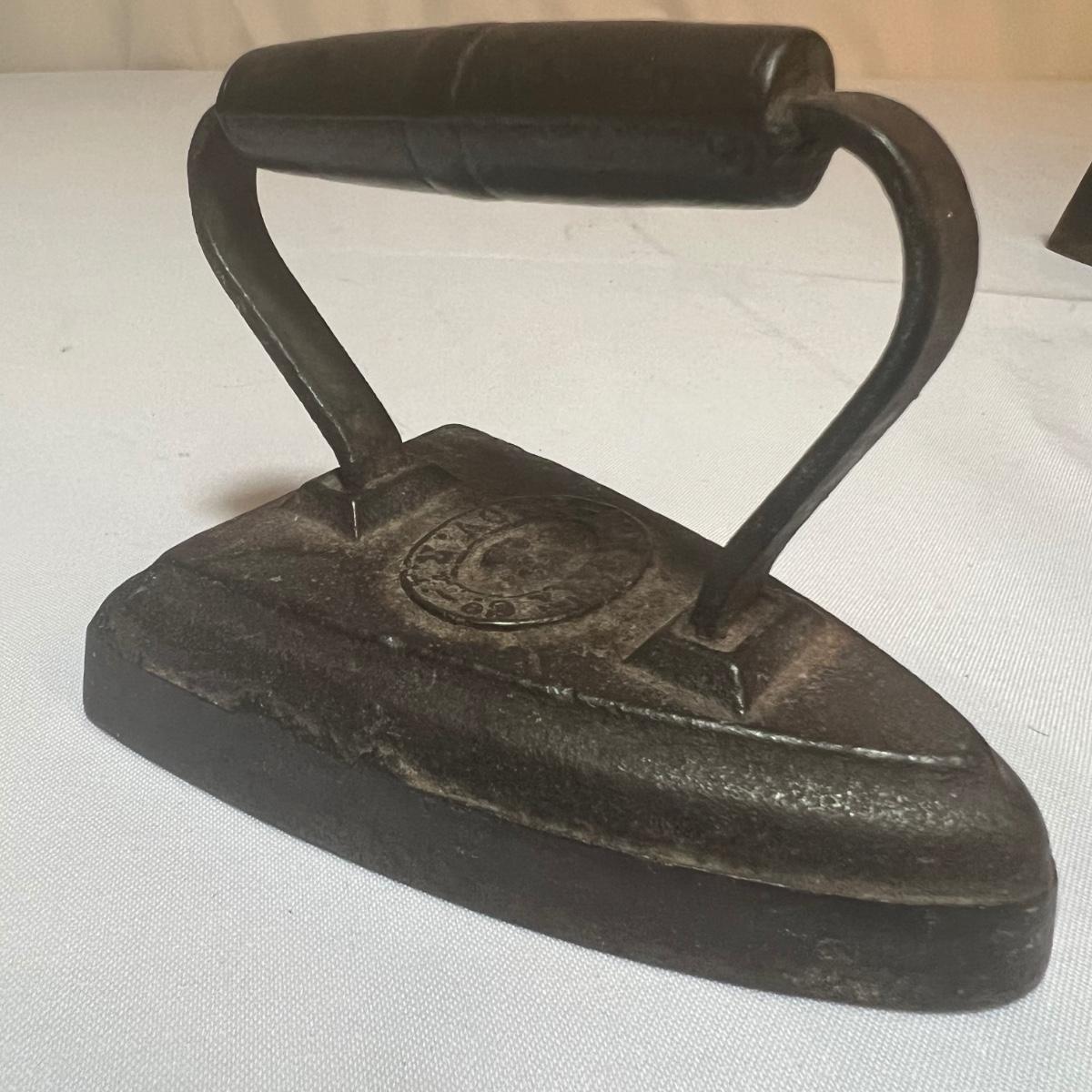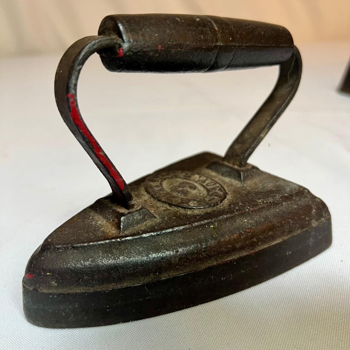 This cast iron assortment includes three trivets and two irons; one is marked A.C Williams #2, it measures 6” x 3” x 2”H. Note the small-handled iron has a company name which is worn and hard to decipher and it has some red paint marks, see image.