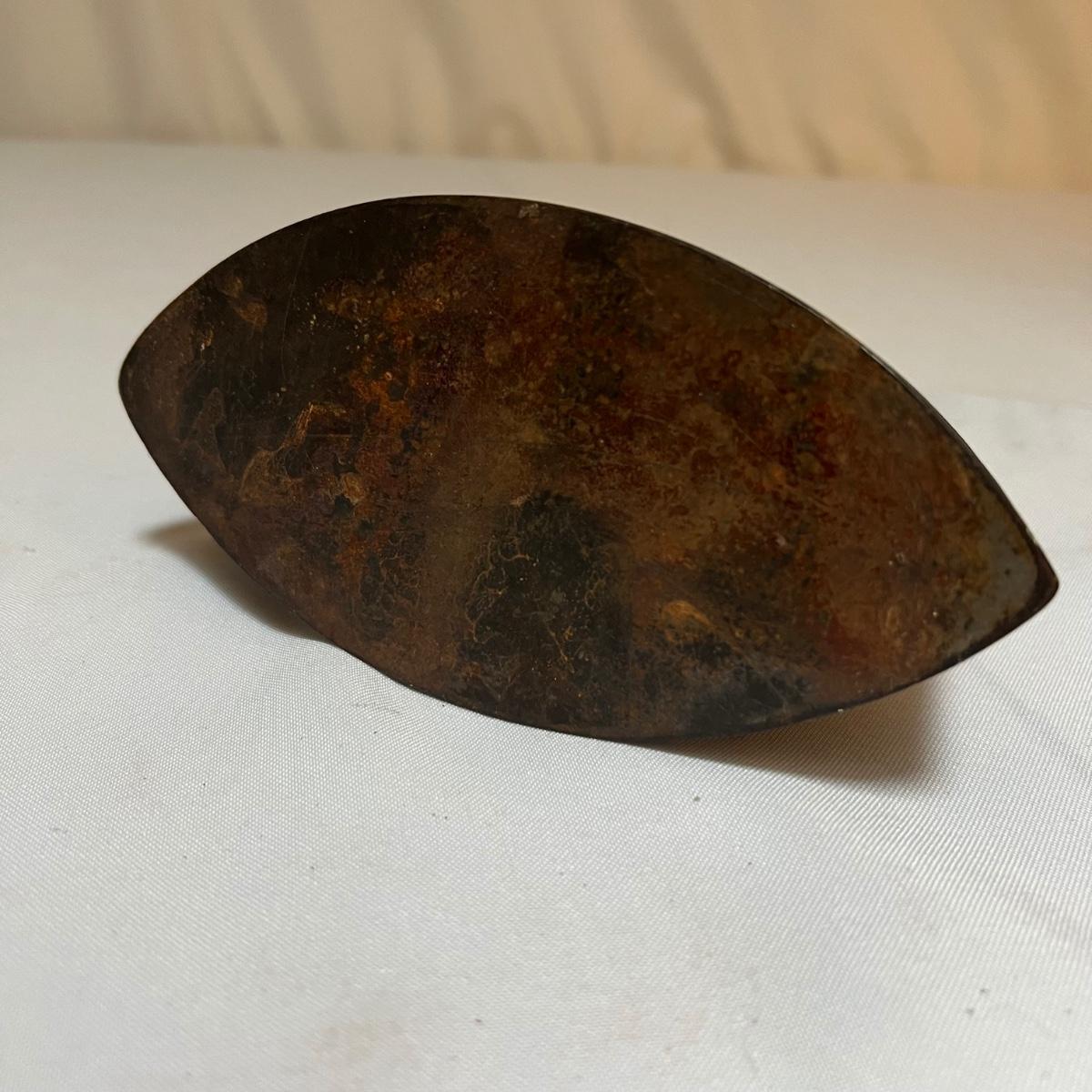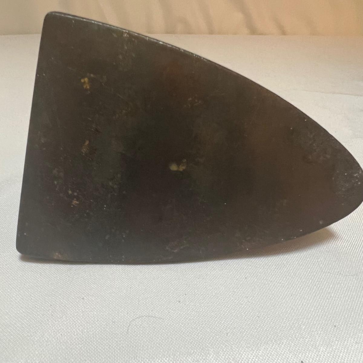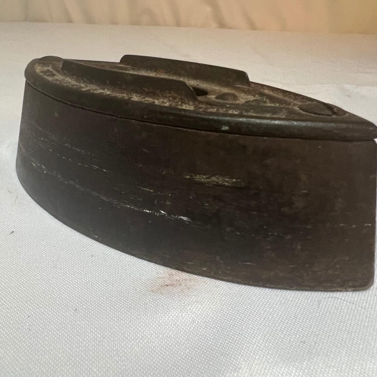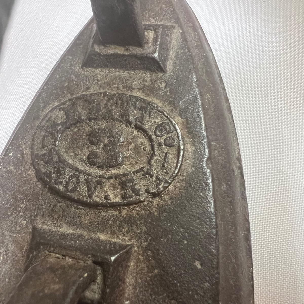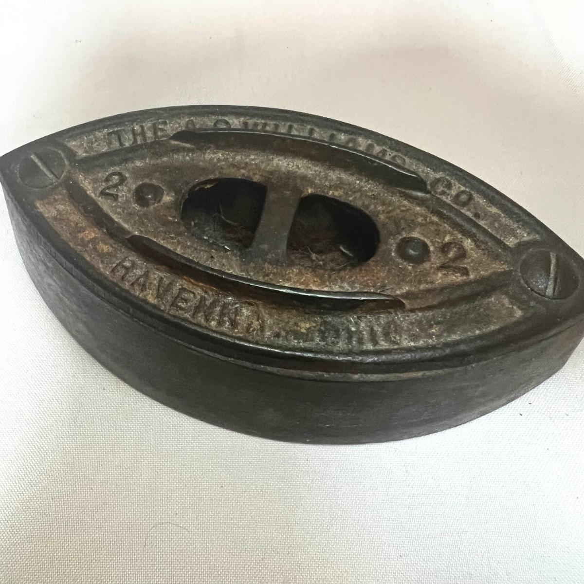 This cast iron assortment includes three trivets and two irons; one is marked A.C Williams #2, it measures 6” x 3” x 2”H. Note the small-handled iron has a company name which is worn and hard to decipher and it has some red paint marks, see image.