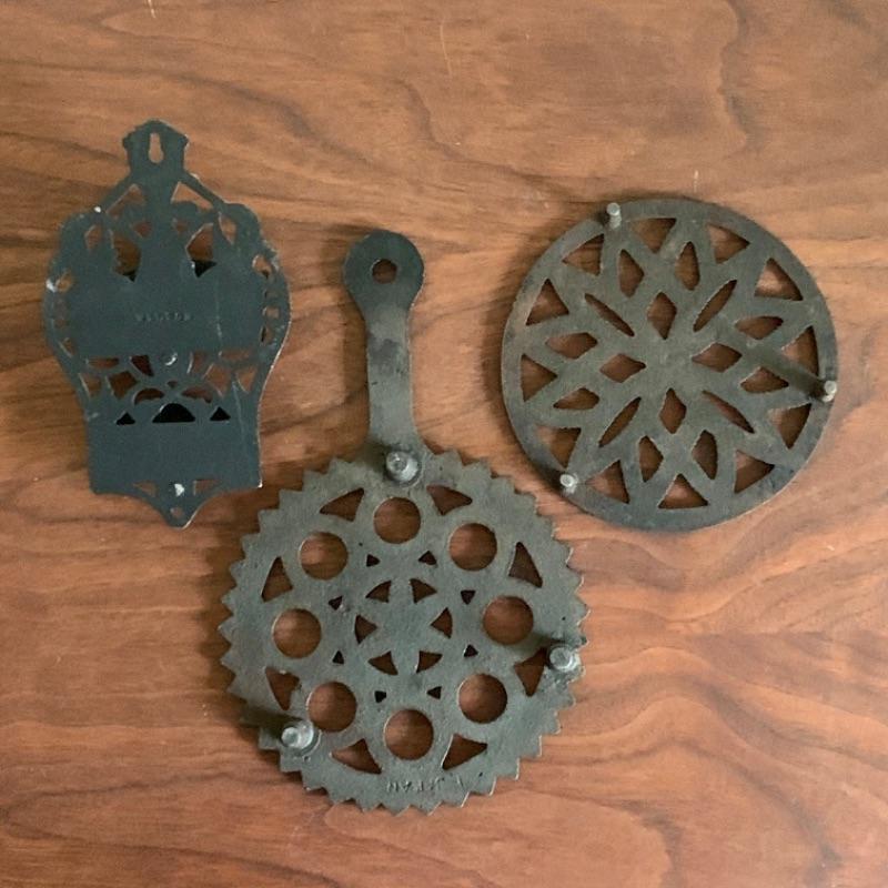 2 trivets (9” w /handle, 5 1/4” diameter) made in Japan and 1 Wilton double match safe /holder 6 1/4”)