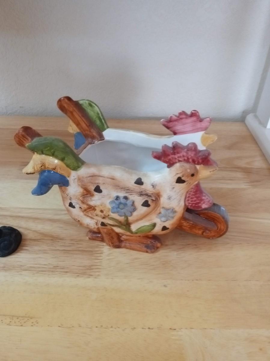 CAST IRON WEATHER VANE, ROOSTER PLANTER AND ONE PLUSH