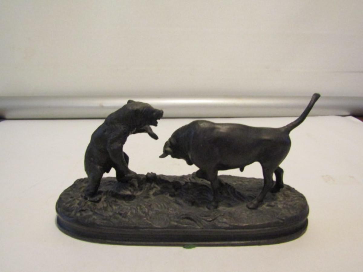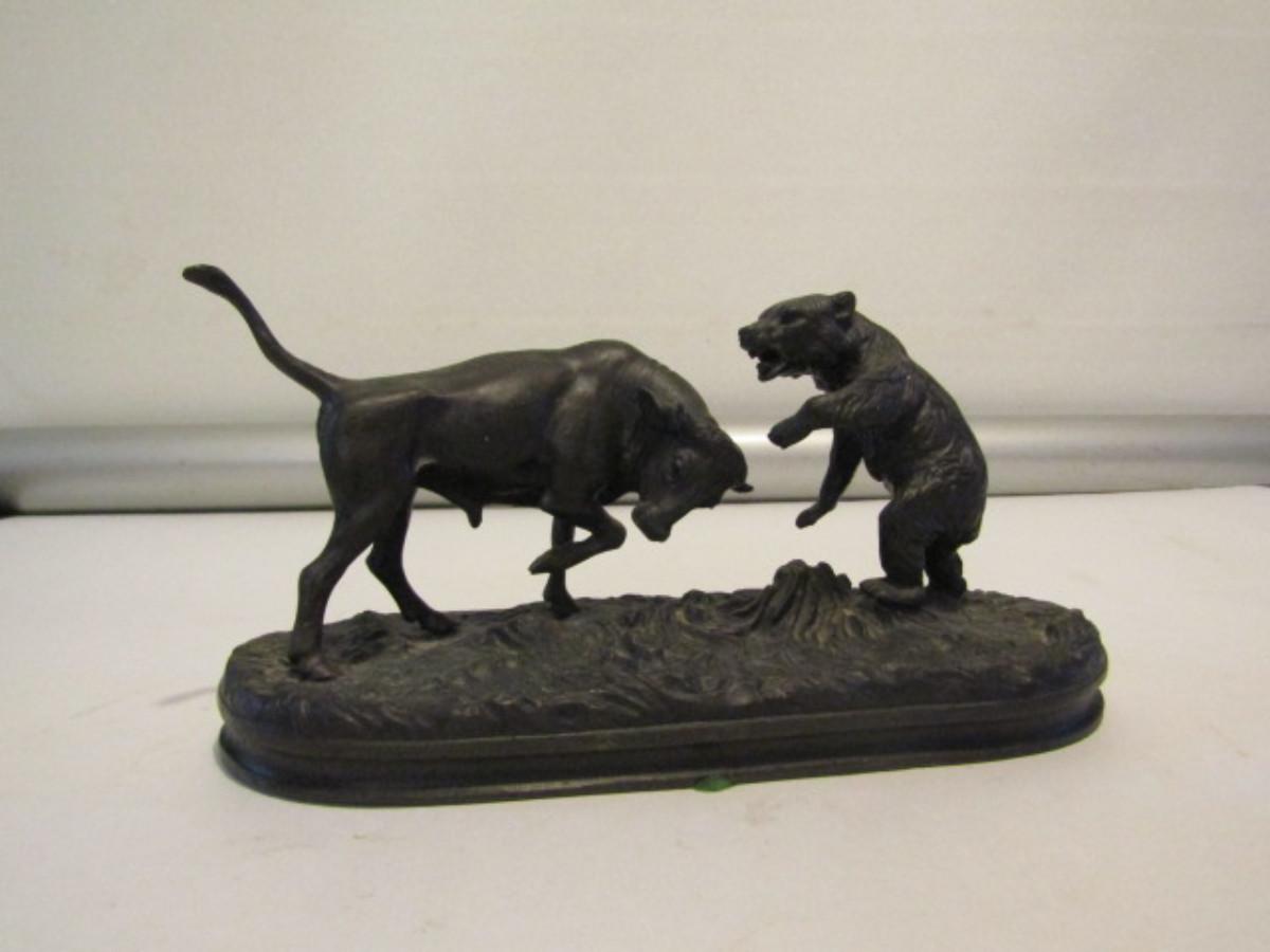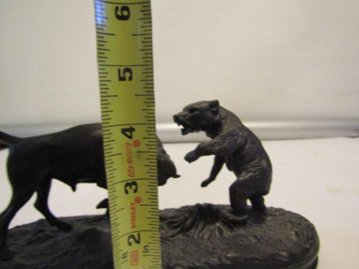 Cast Metal Bear and Bull Statuette- Approx 4" Tall, 9" Wide