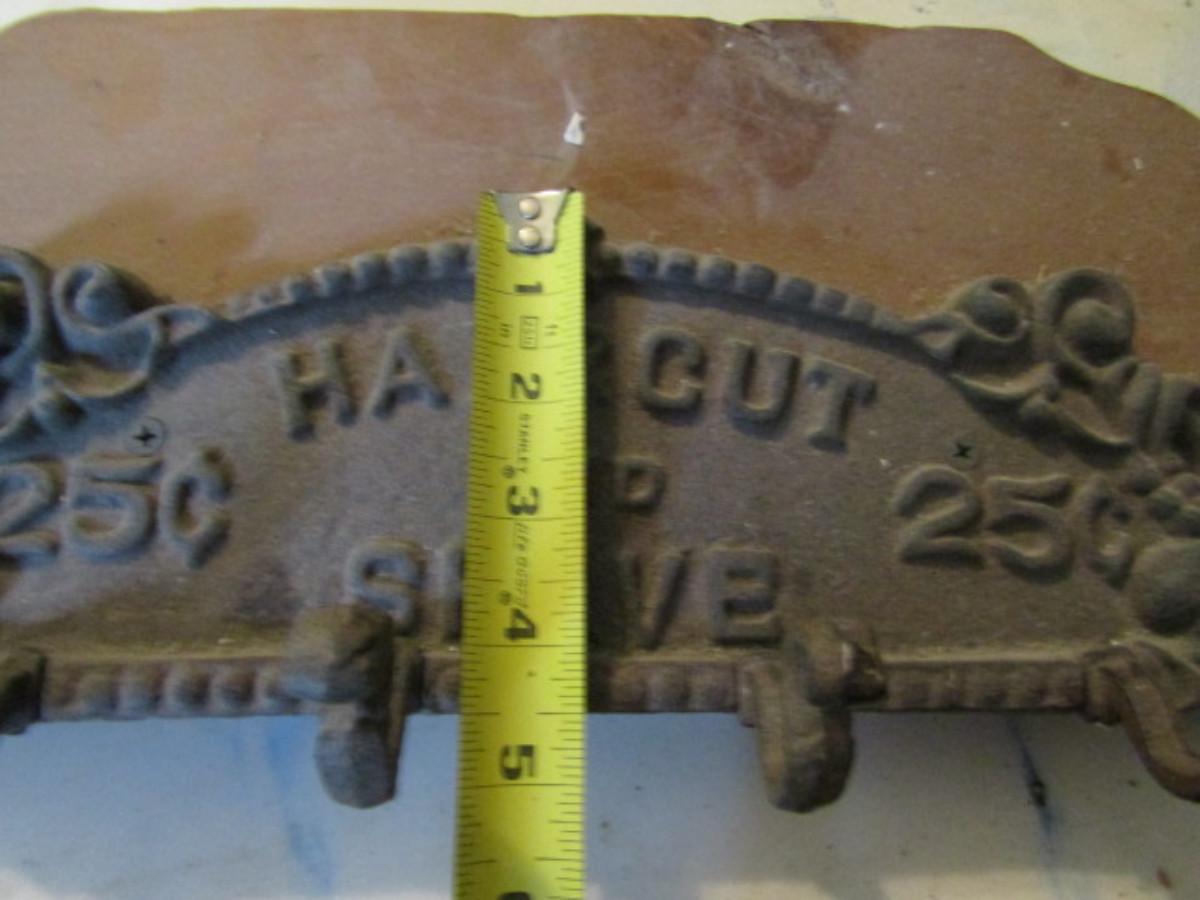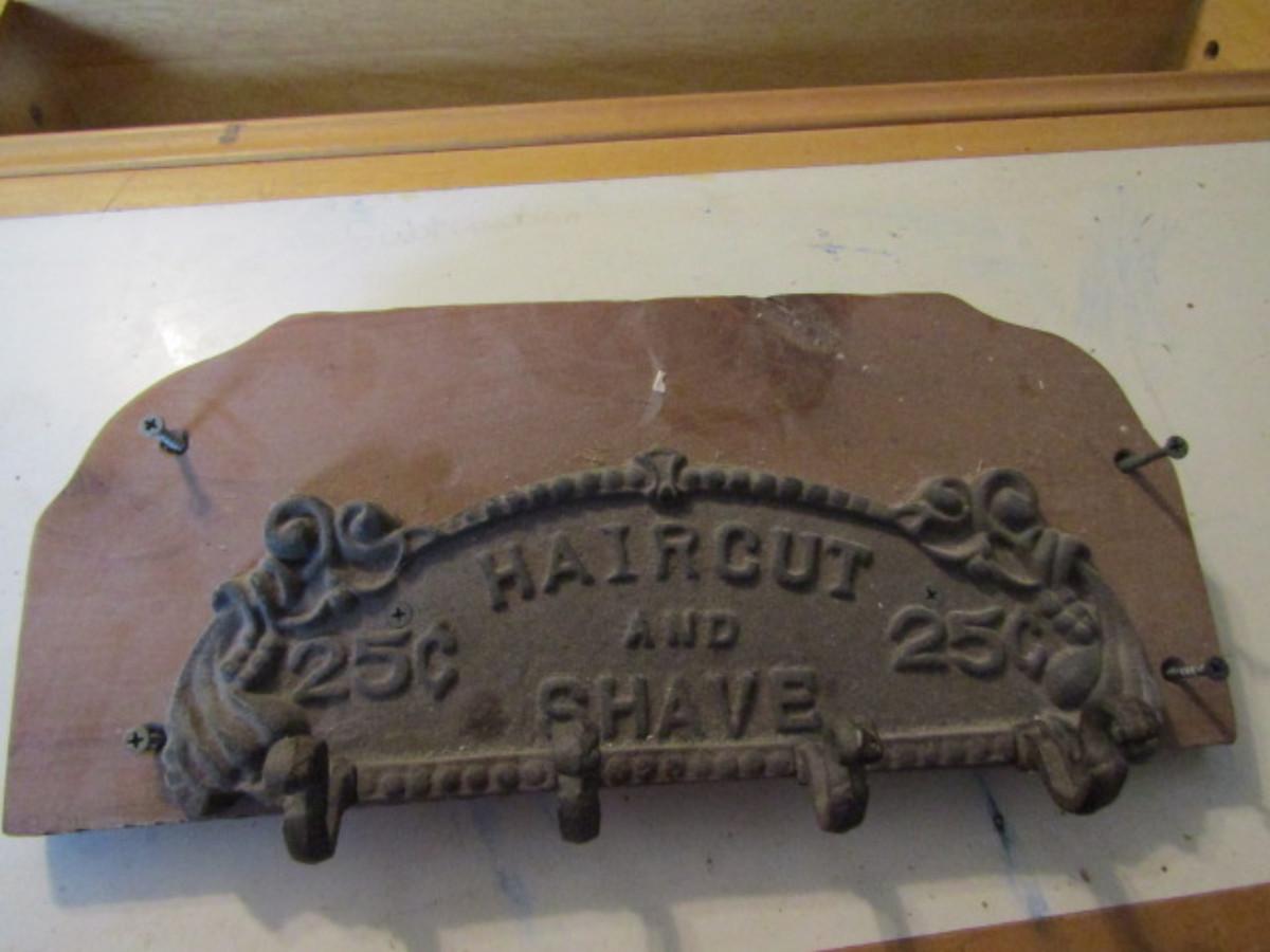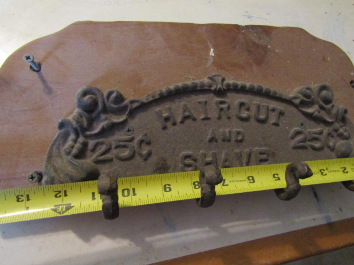 Cast Metal Haircut and Shave Sign Attached to Wood Backer