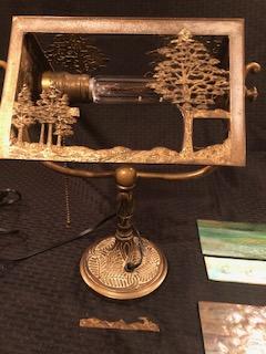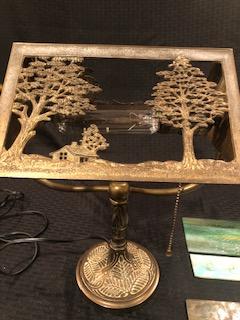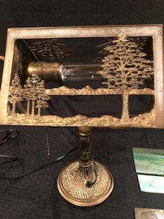 Cast metal lamp. As is. Small piece of metal broke out but can easily be repaired. Has original glass but one piece is broken but can still be used with broken piece set in place.