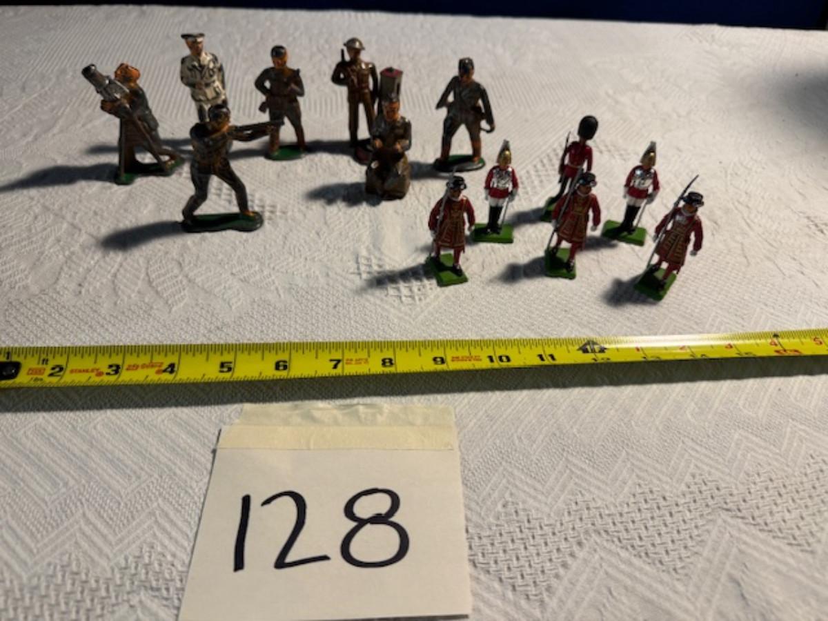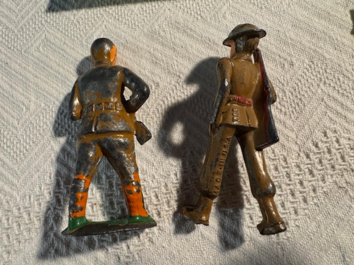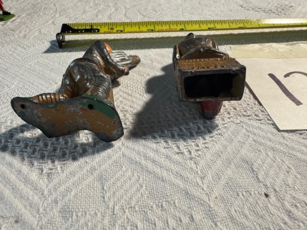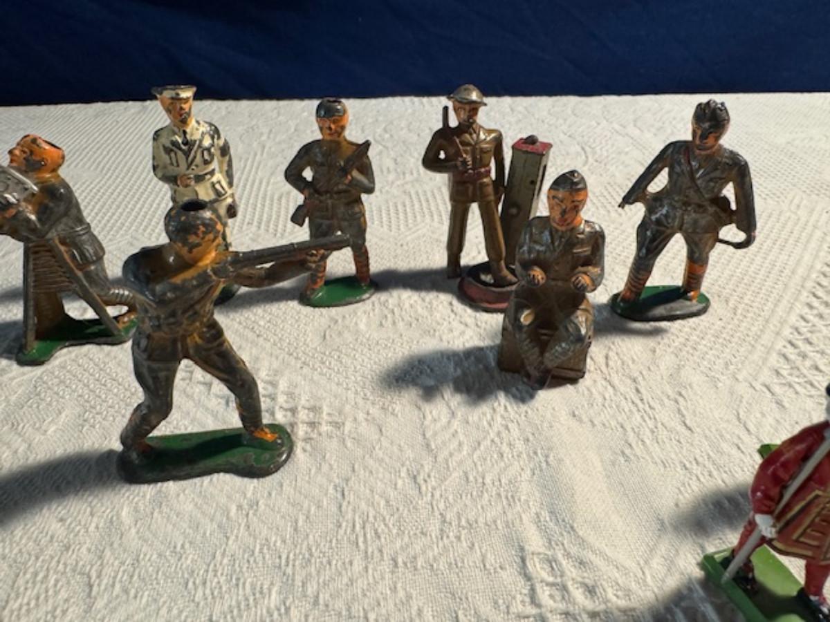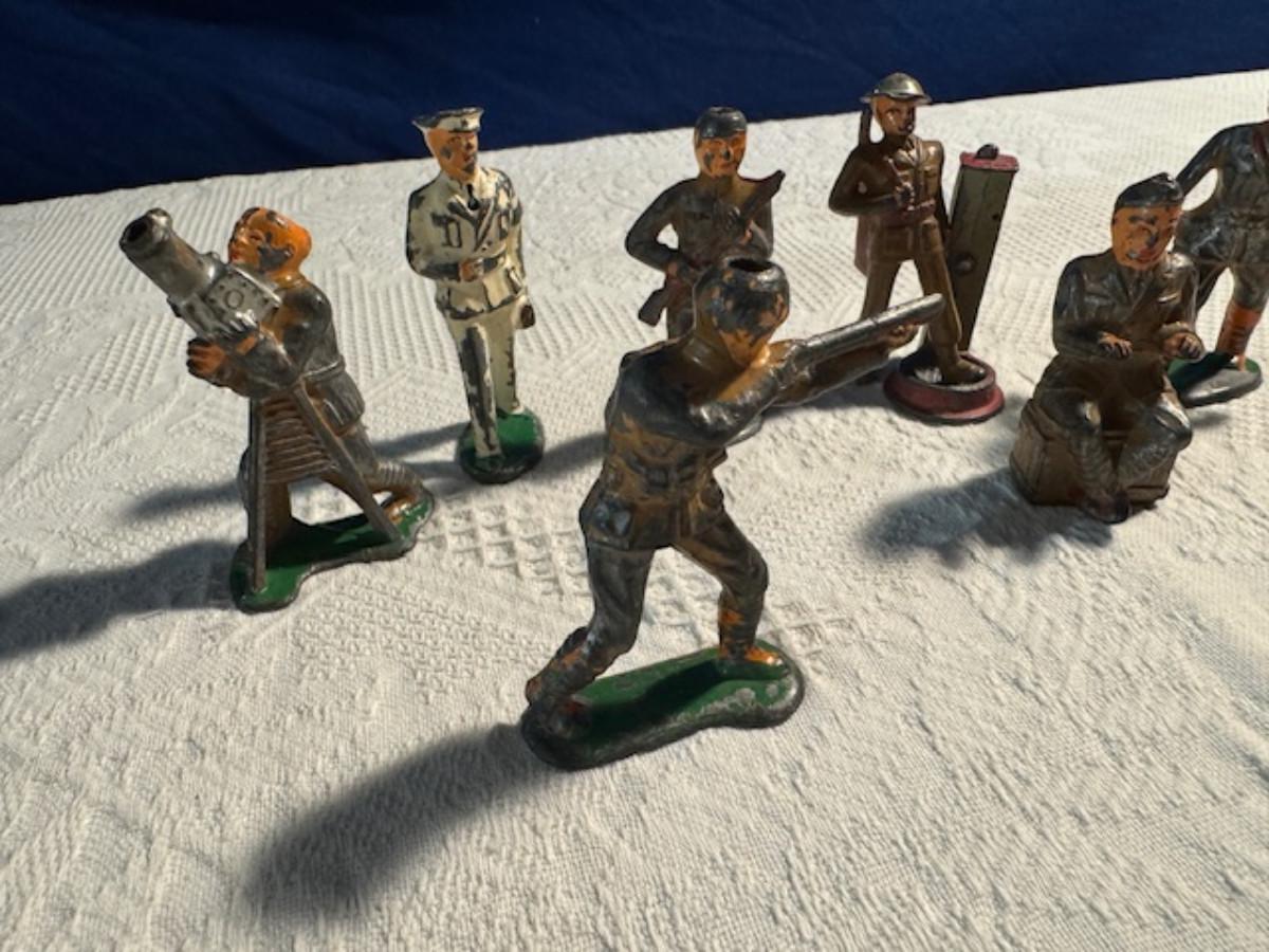 6 Britain's LTD 1973 England military, 7 Barclay vintage cast metal men made in USA (some have holes in the top of the head - missing hats. These are as is condition - one will not stand on his own, and one unknown piece is included. See pictures.