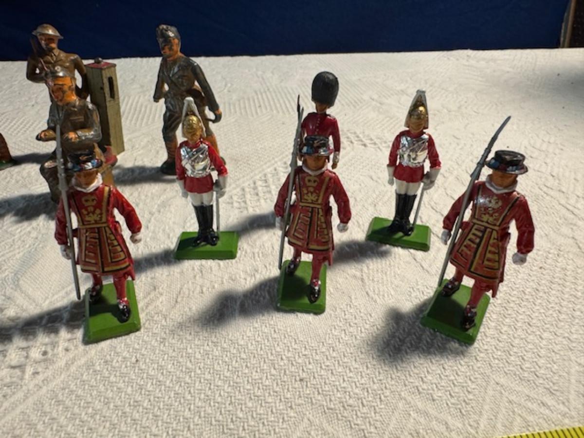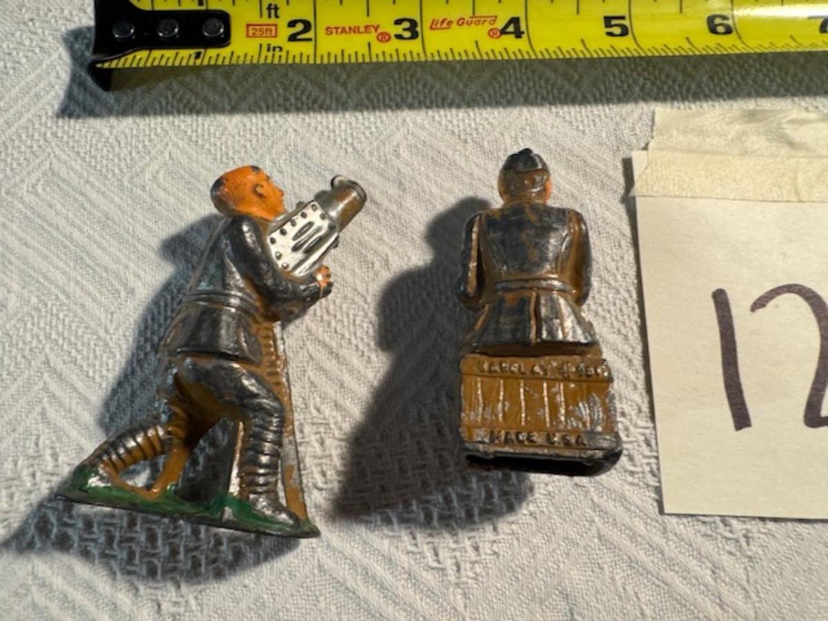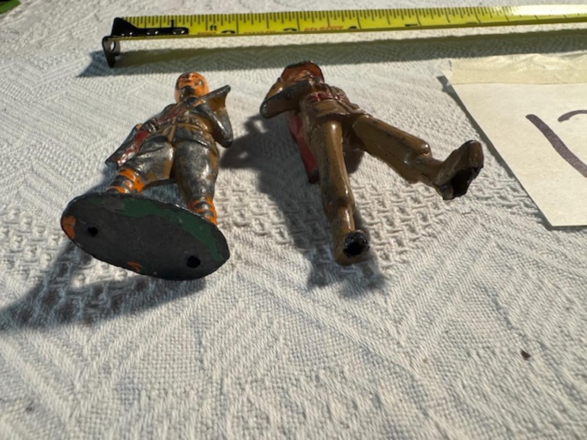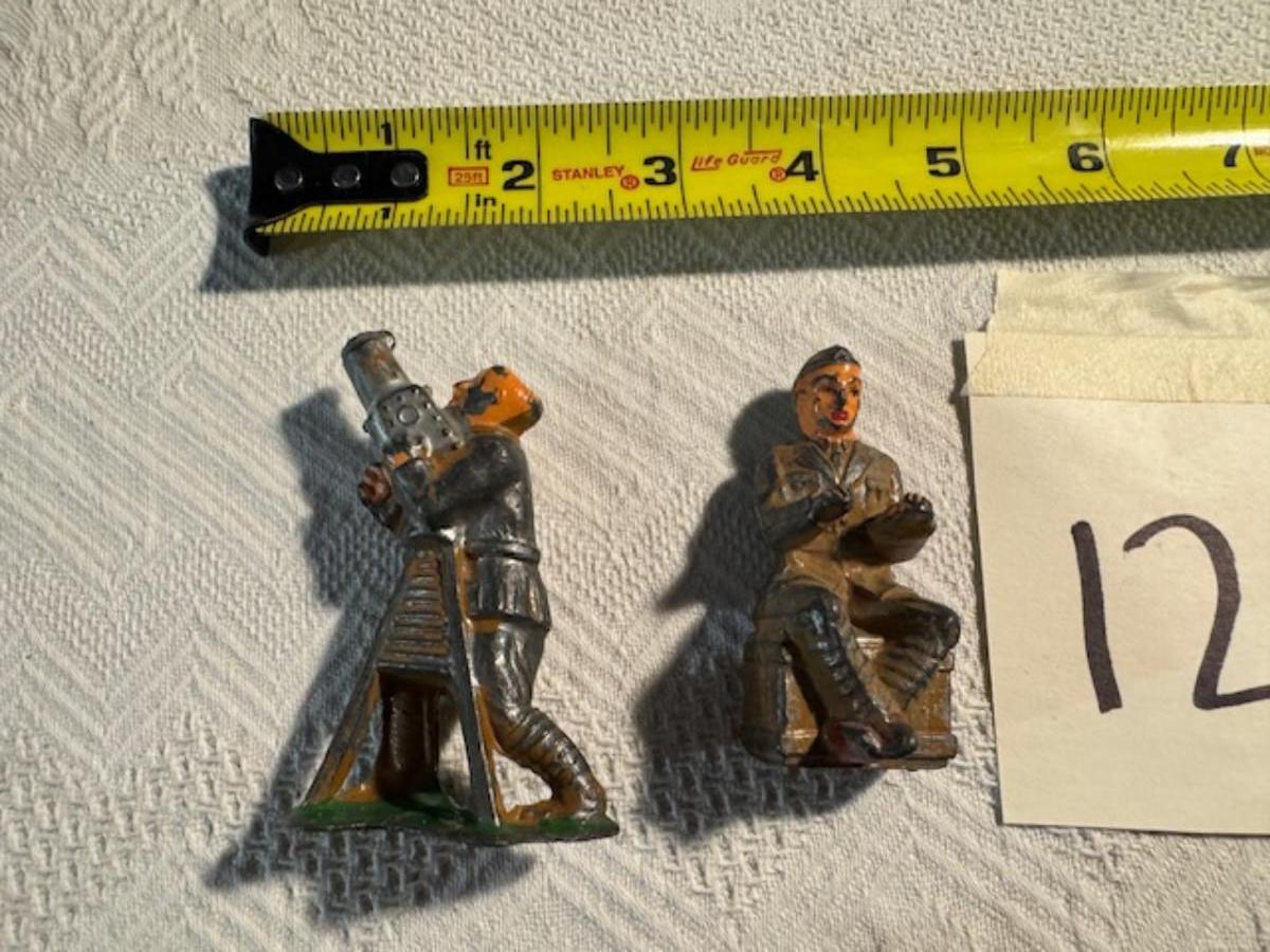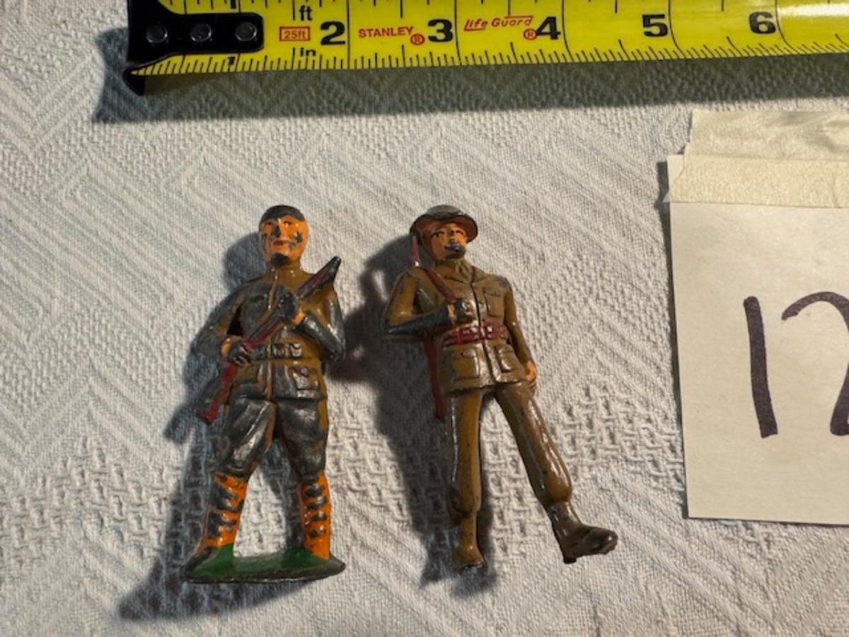 6 Britain's LTD 1973 England military, 7 Barclay vintage cast metal men made in USA (some have holes in the top of the head - missing hats. These are as is condition - one will not stand on his own, and one unknown piece is included. See pictures.