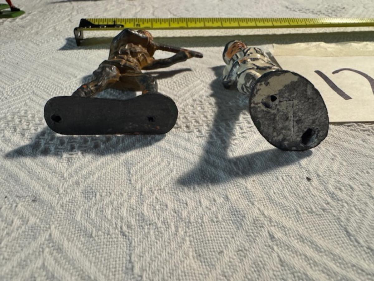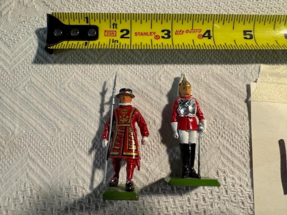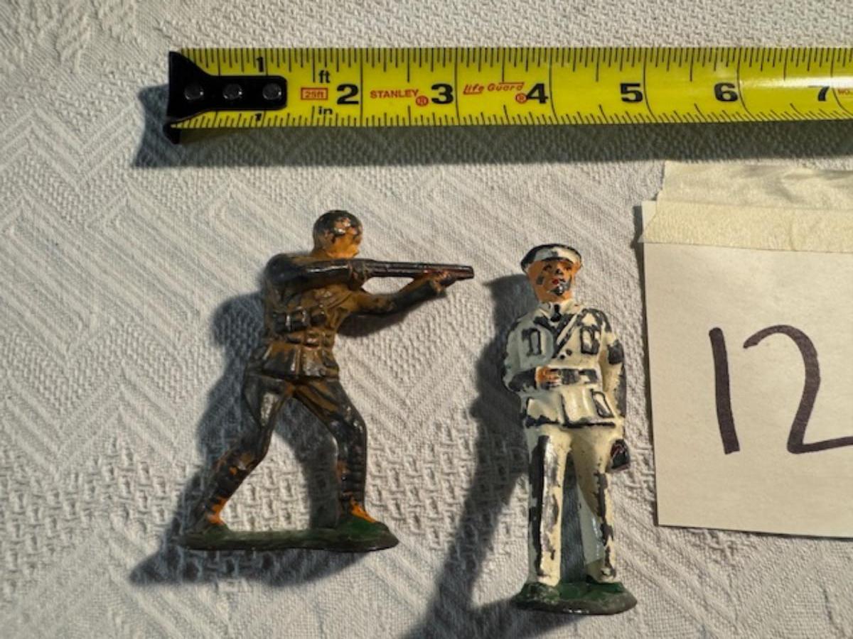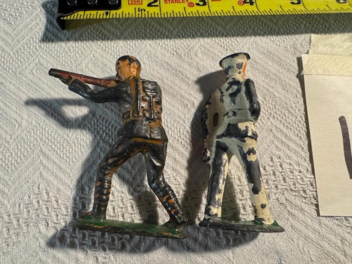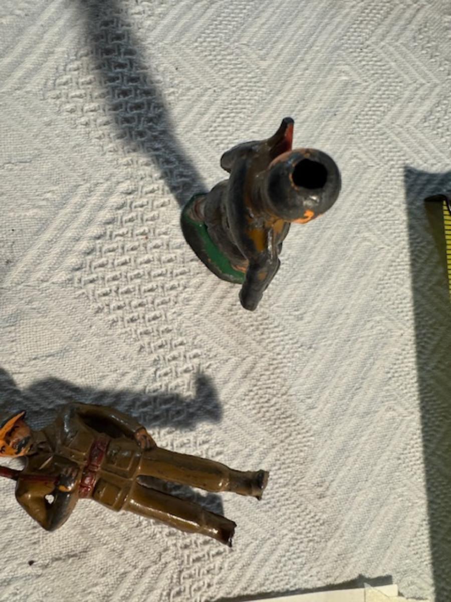 6 Britain's LTD 1973 England military, 7 Barclay vintage cast metal men made in USA (some have holes in the top of the head - missing hats. These are as is condition - one will not stand on his own, and one unknown piece is included. See pictures.