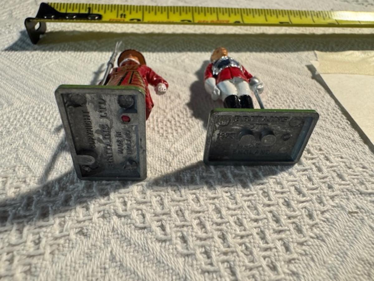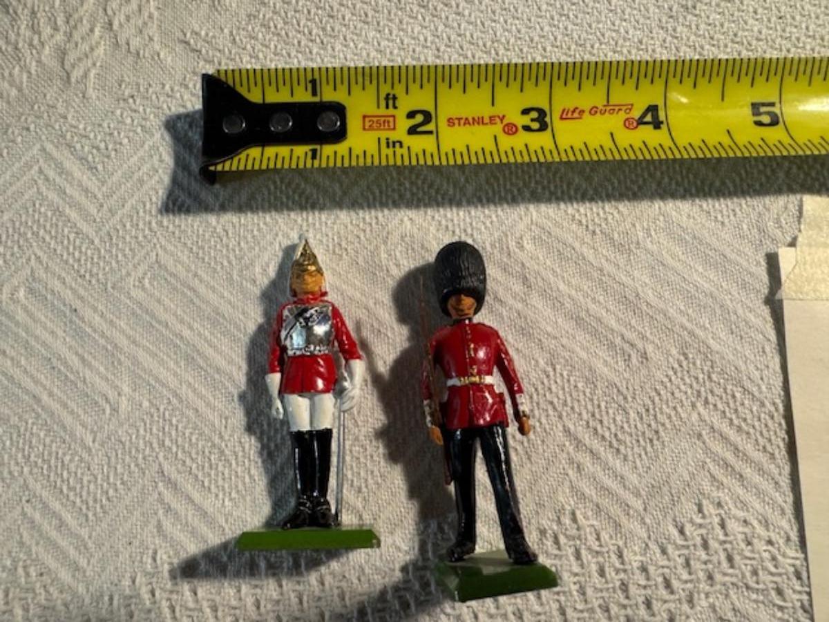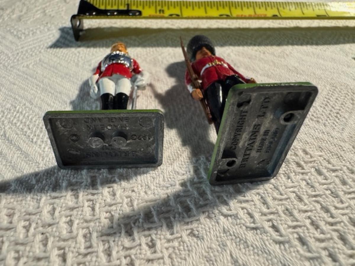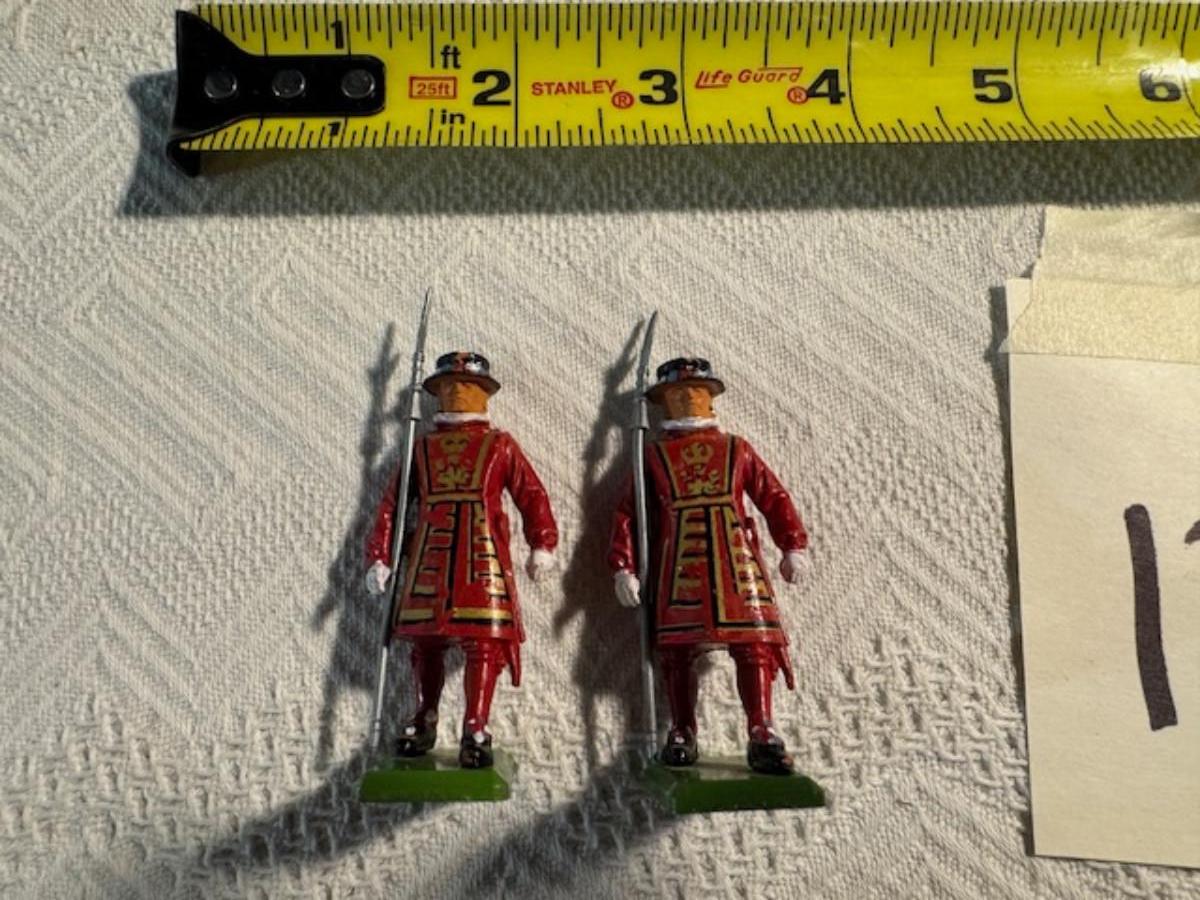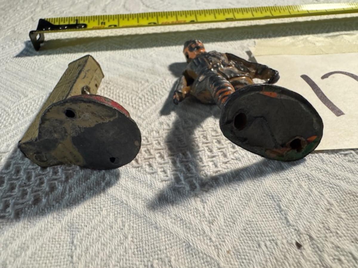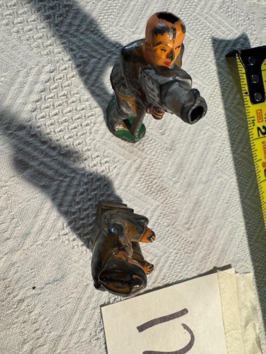 6 Britain's LTD 1973 England military, 7 Barclay vintage cast metal men made in USA (some have holes in the top of the head - missing hats. These are as is condition - one will not stand on his own, and one unknown piece is included. See pictures.