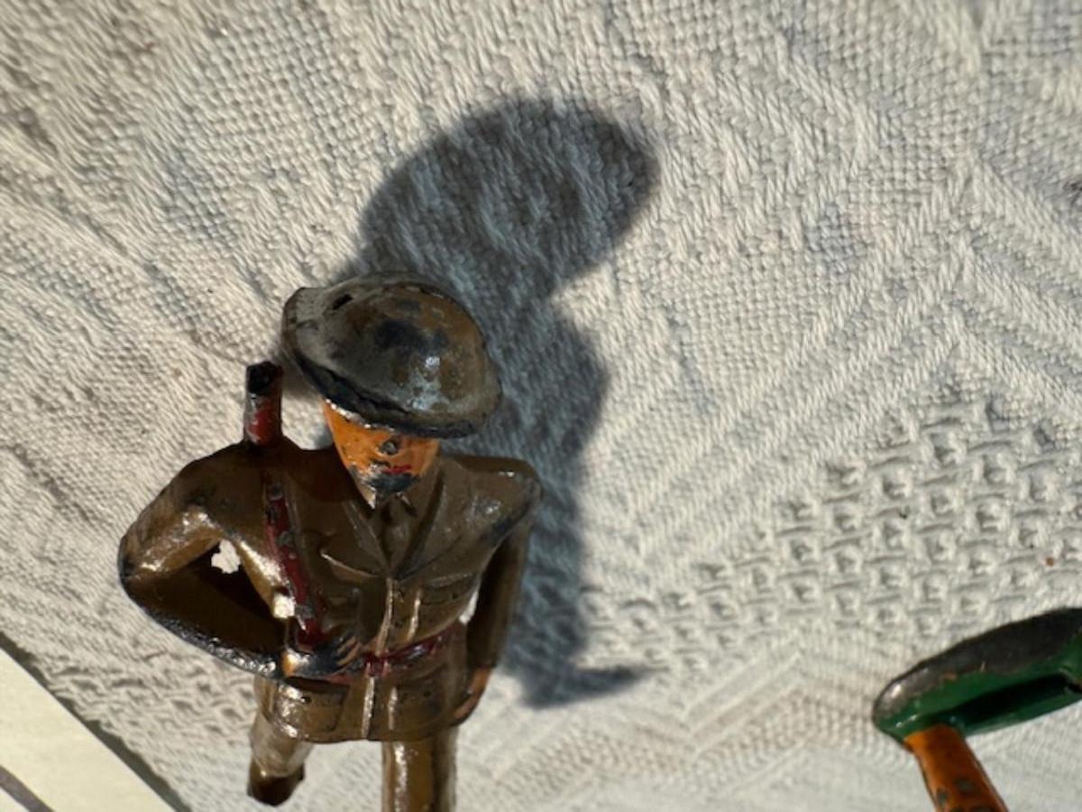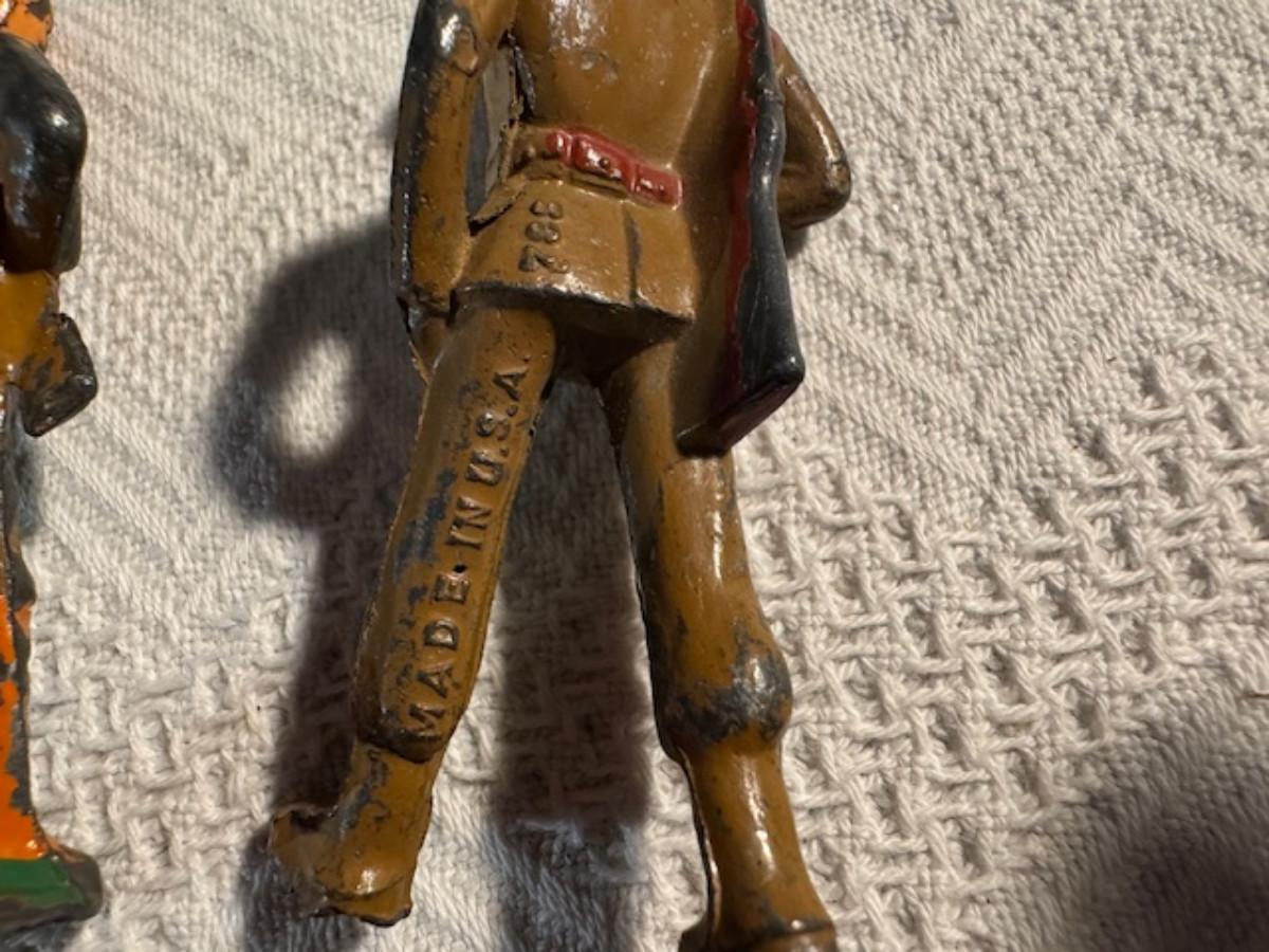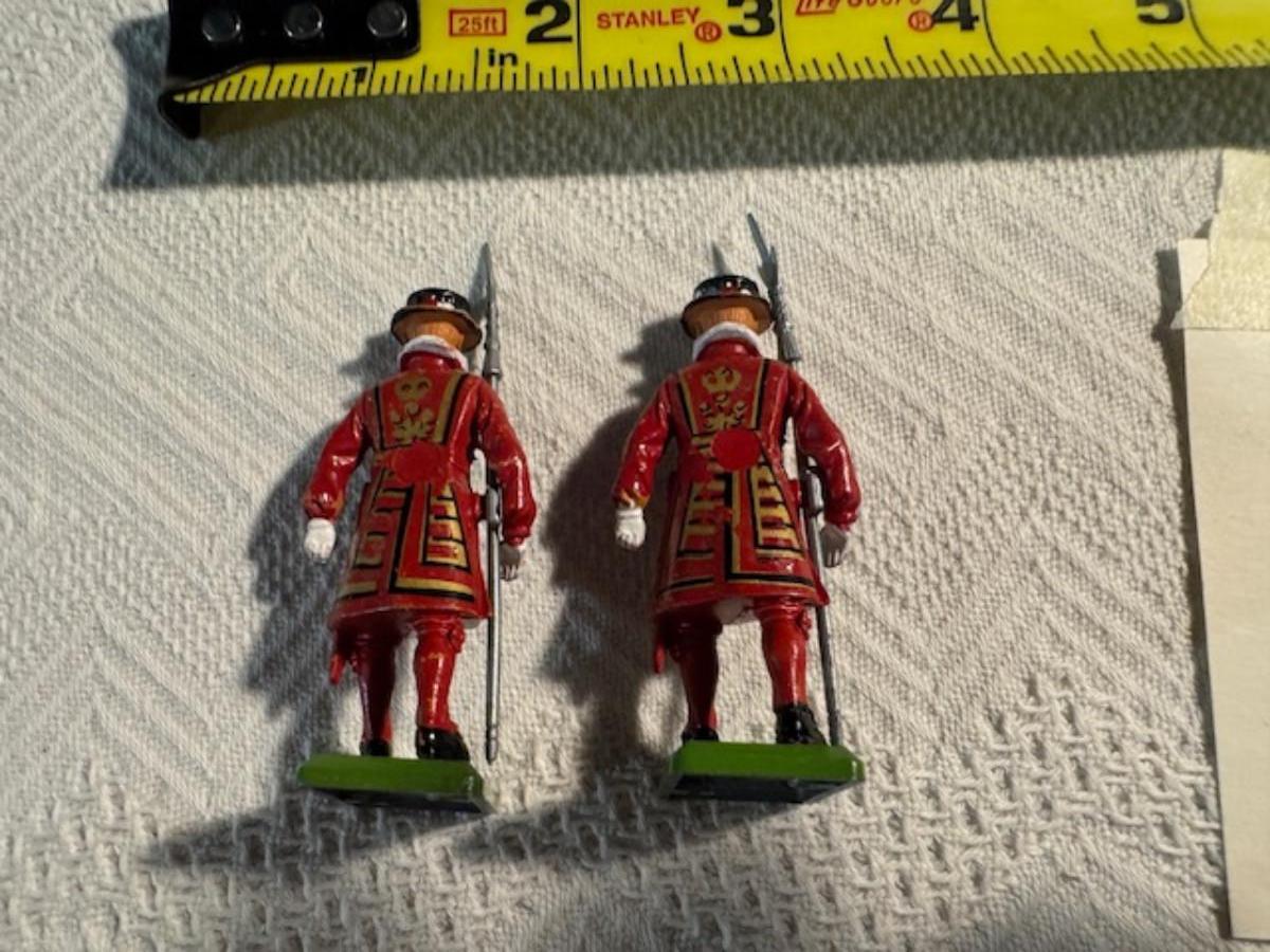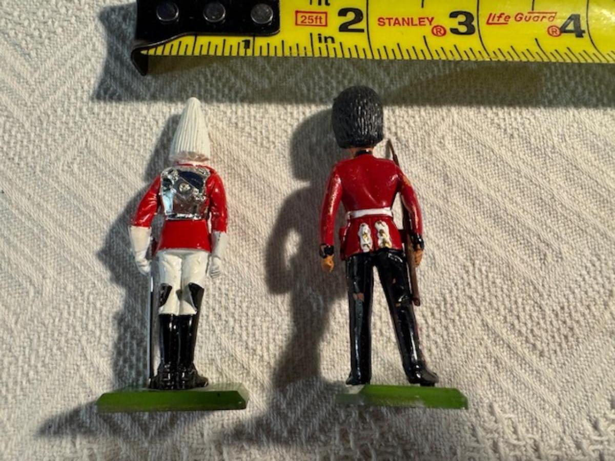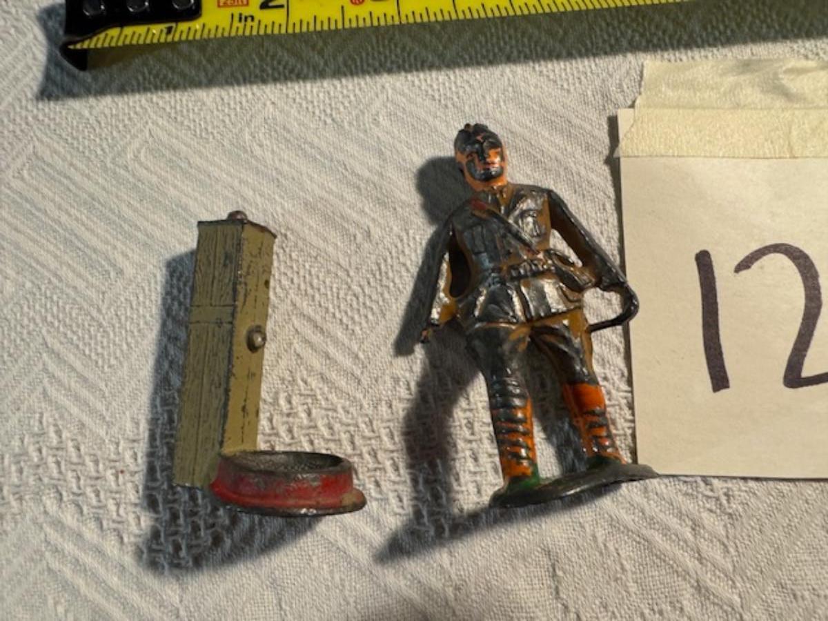 6 Britain's LTD 1973 England military, 7 Barclay vintage cast metal men made in USA (some have holes in the top of the head - missing hats. These are as is condition - one will not stand on his own, and one unknown piece is included. See pictures.