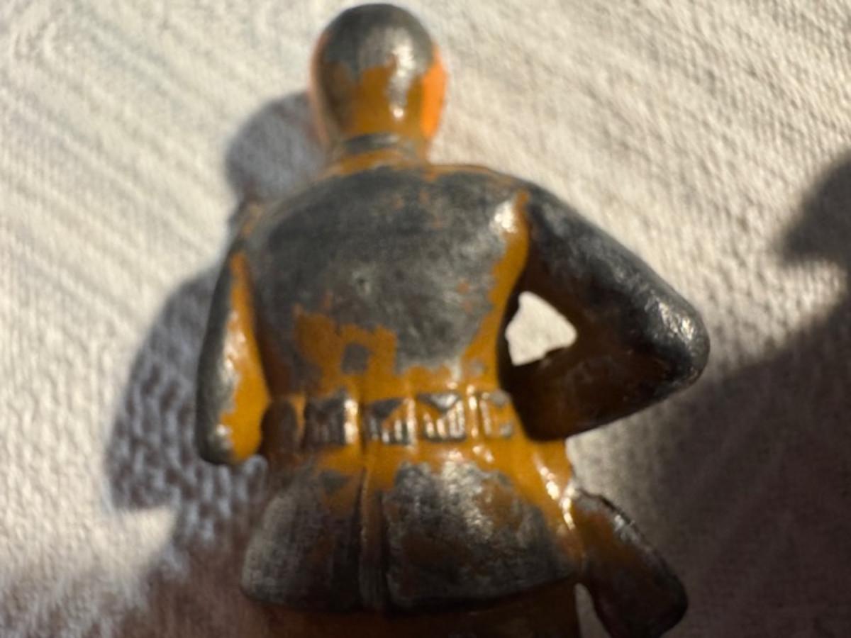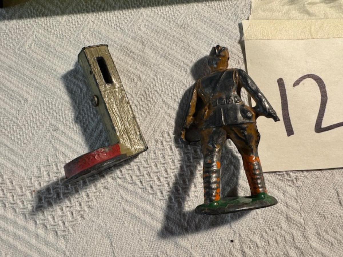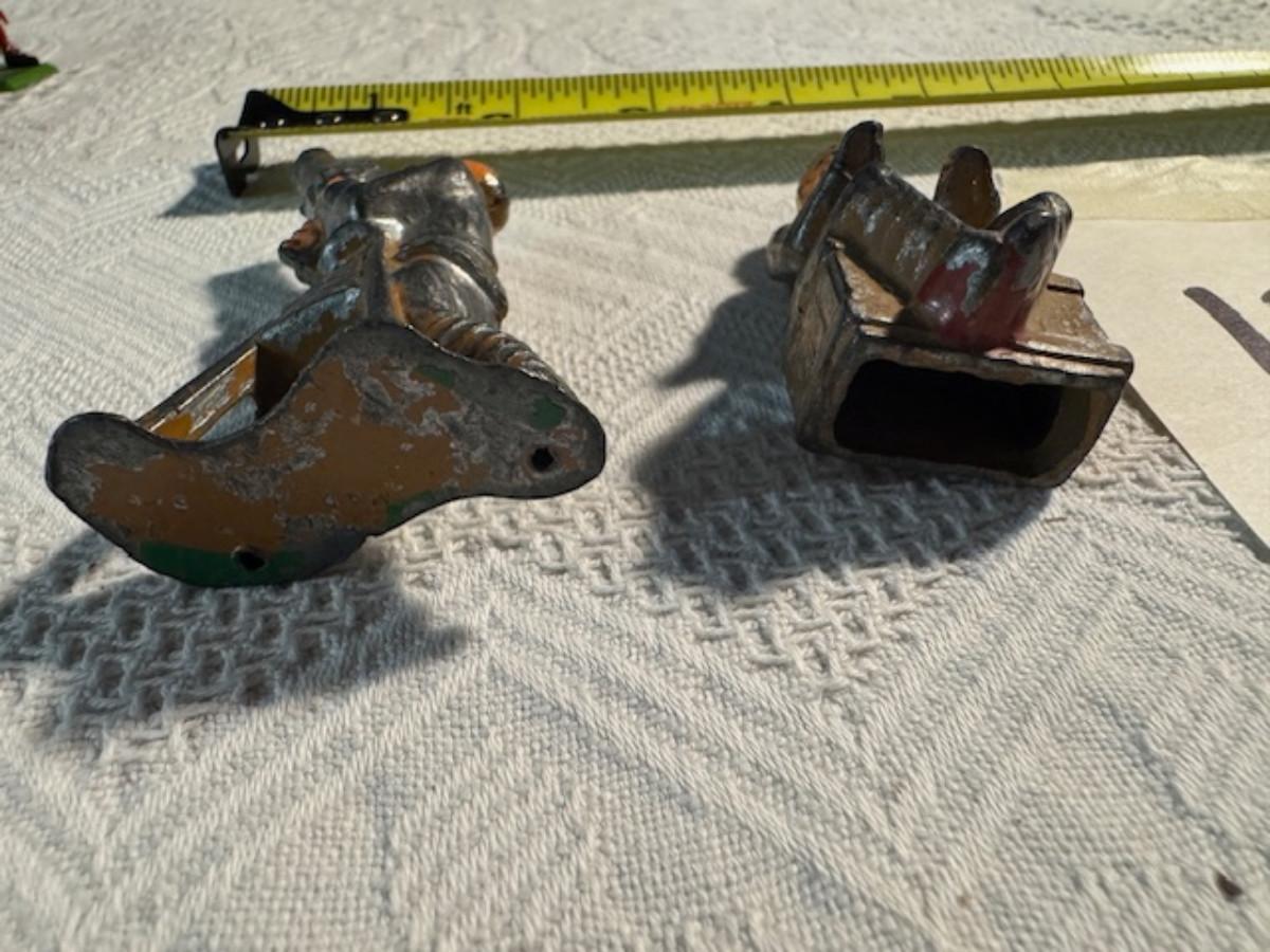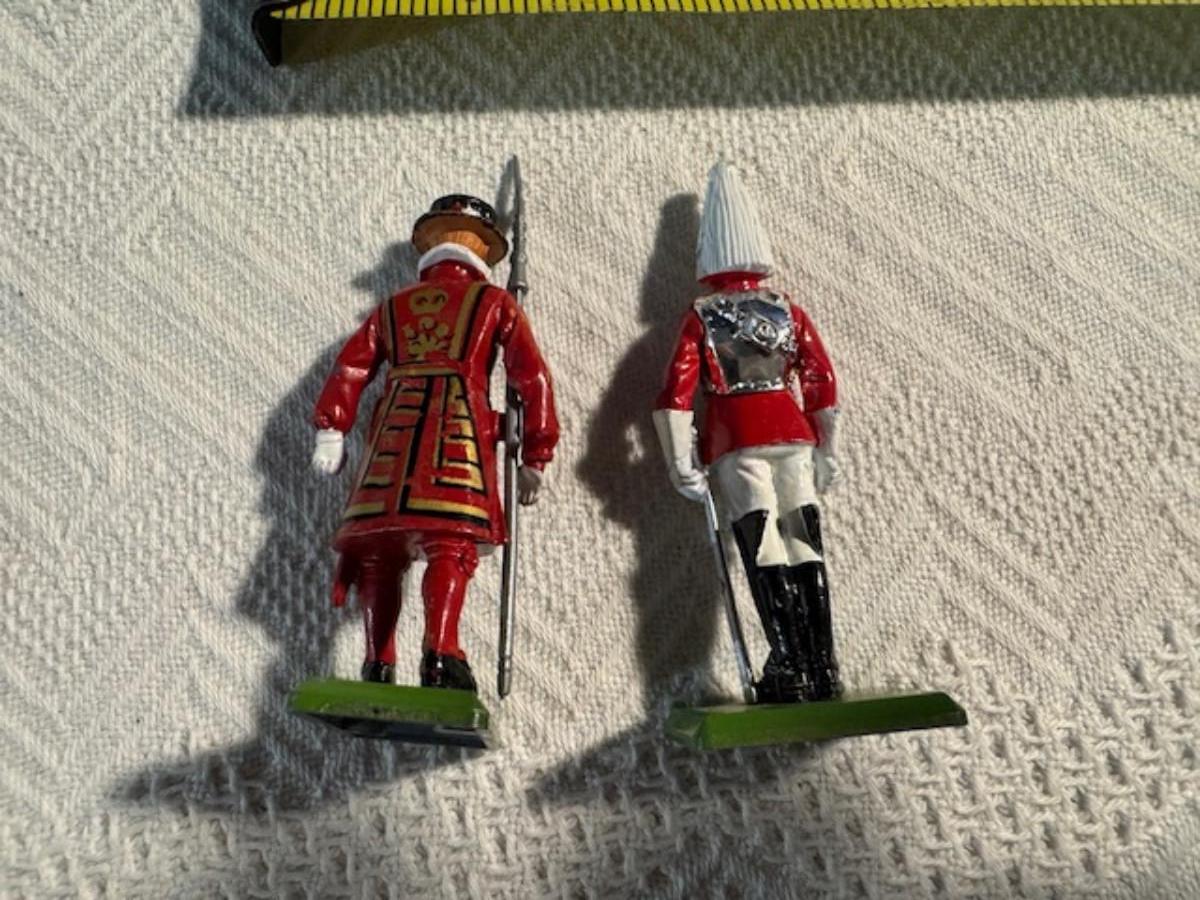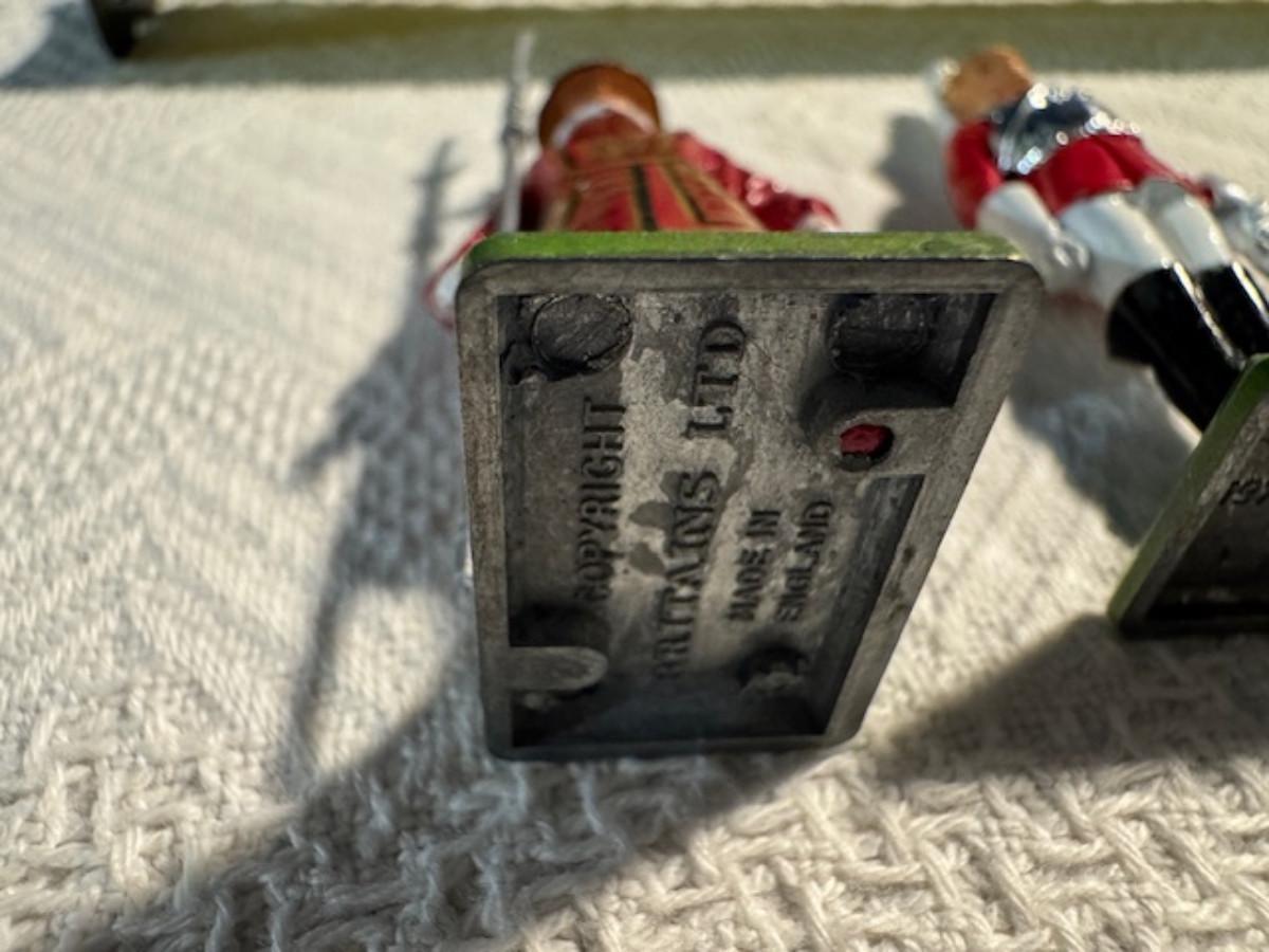 6 Britain's LTD 1973 England military, 7 Barclay vintage cast metal men made in USA (some have holes in the top of the head - missing hats. These are as is condition - one will not stand on his own, and one unknown piece is included. See pictures.