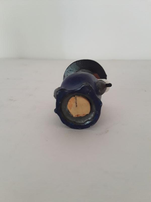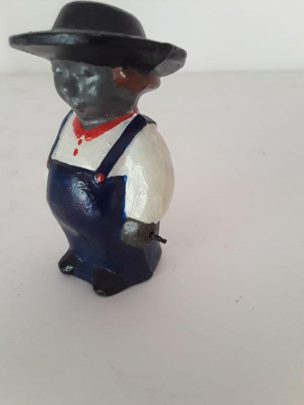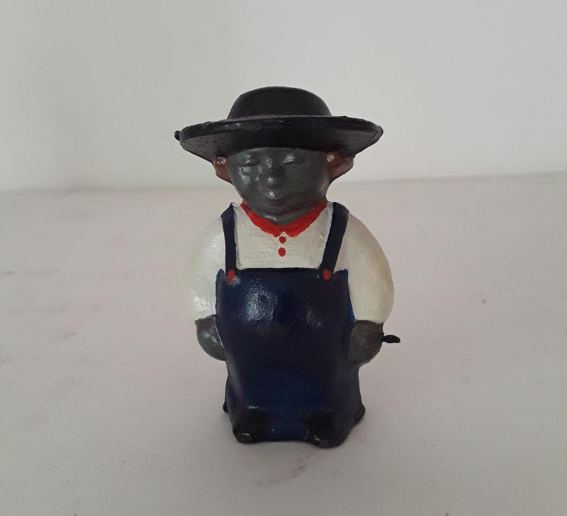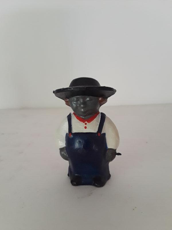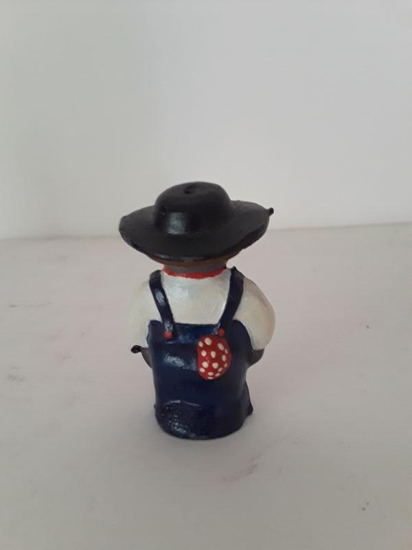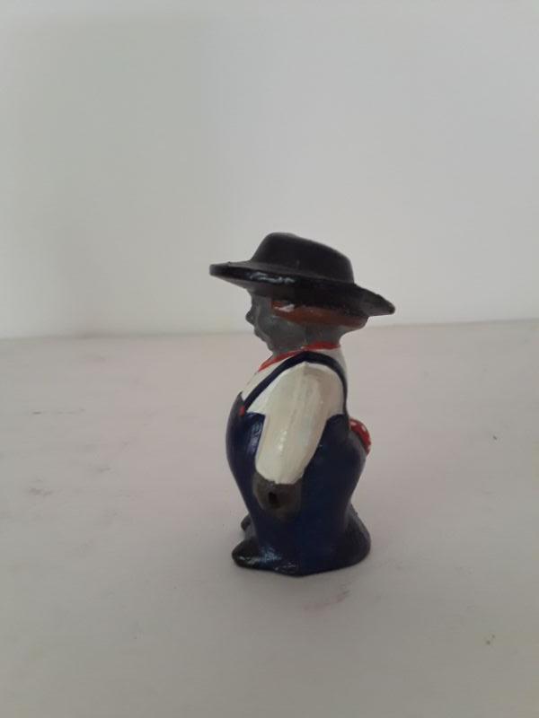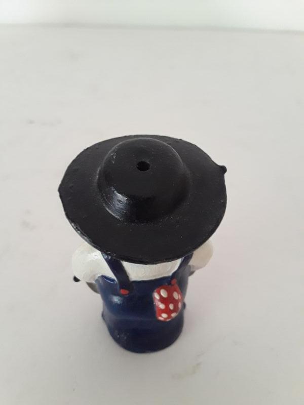 Small cast metal farmer pepper shaker. Interesting little shaker, has only one hole in the top and a small metal wire that goes inside through his hand. Corked bottom.