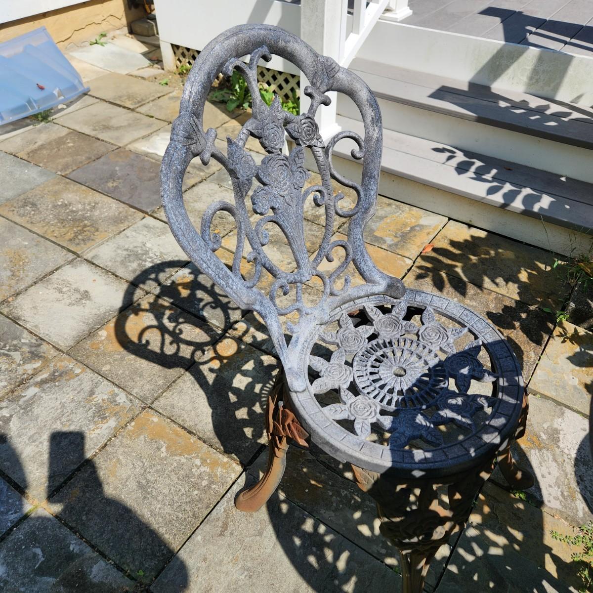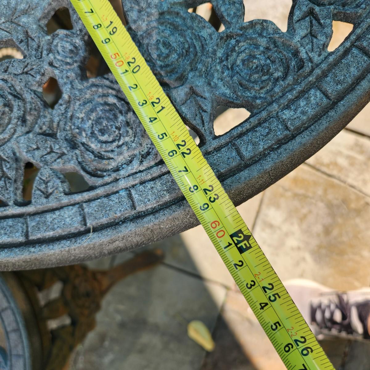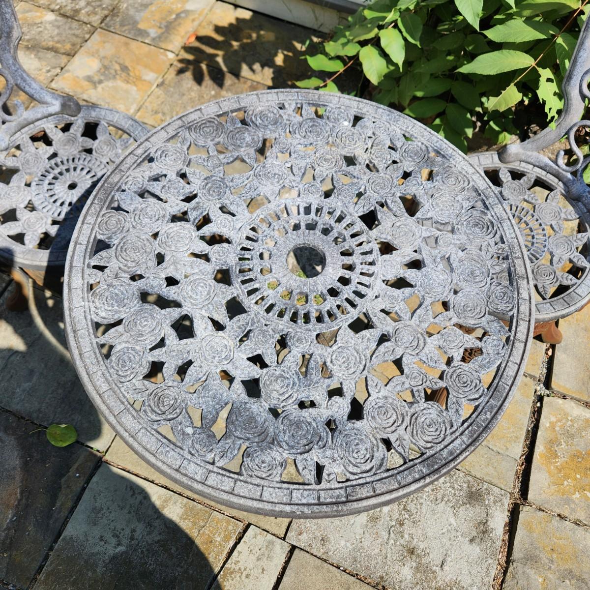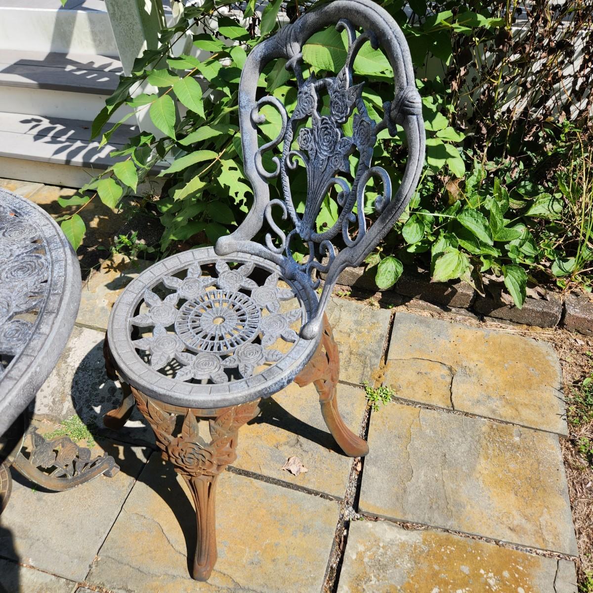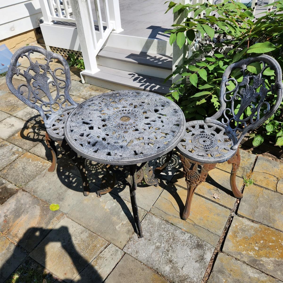 Cast Metal Patio table and 2 Chairs 23" dia table