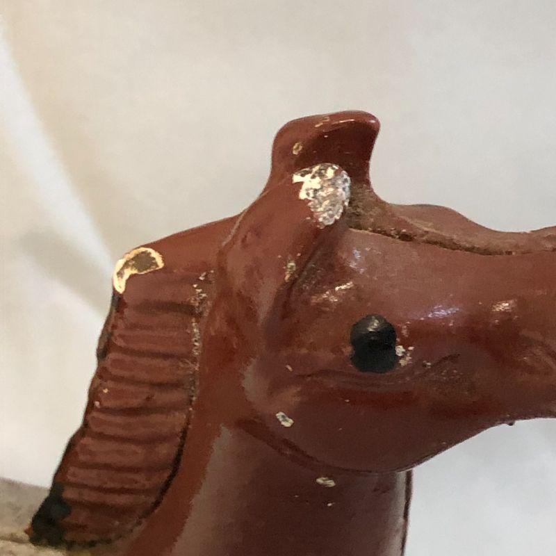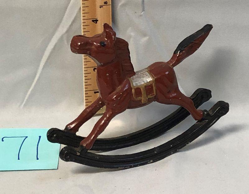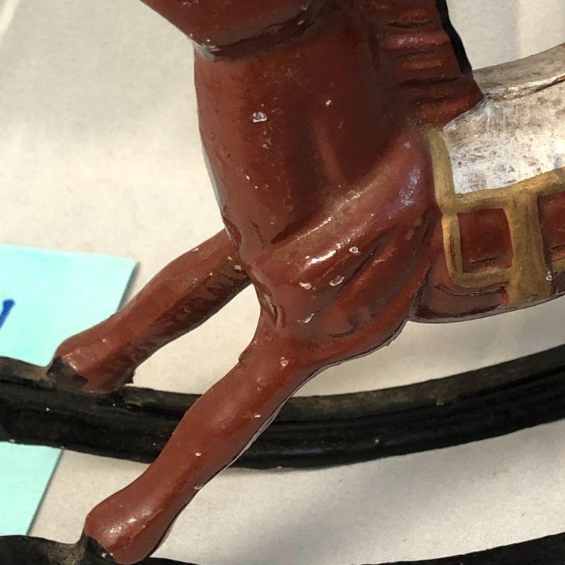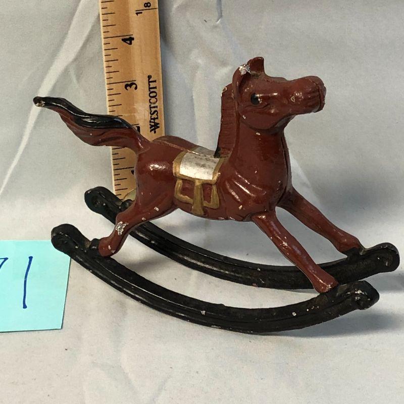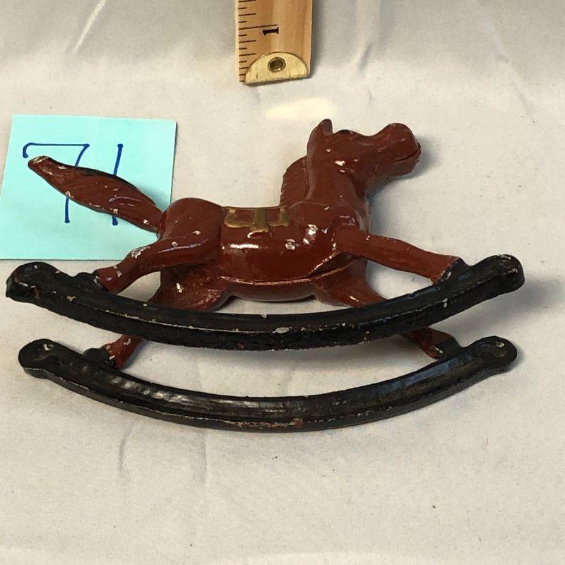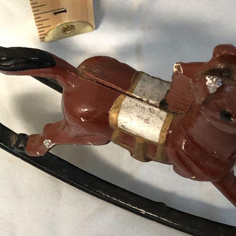 I'm not sure if this is cast iron, but it is heavy similar to cast iron. The only issue is that there is chipped enamel paint. It is 7.5" long and 5.5" tall.