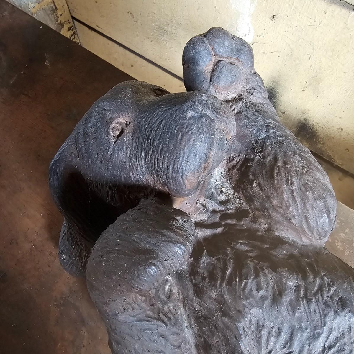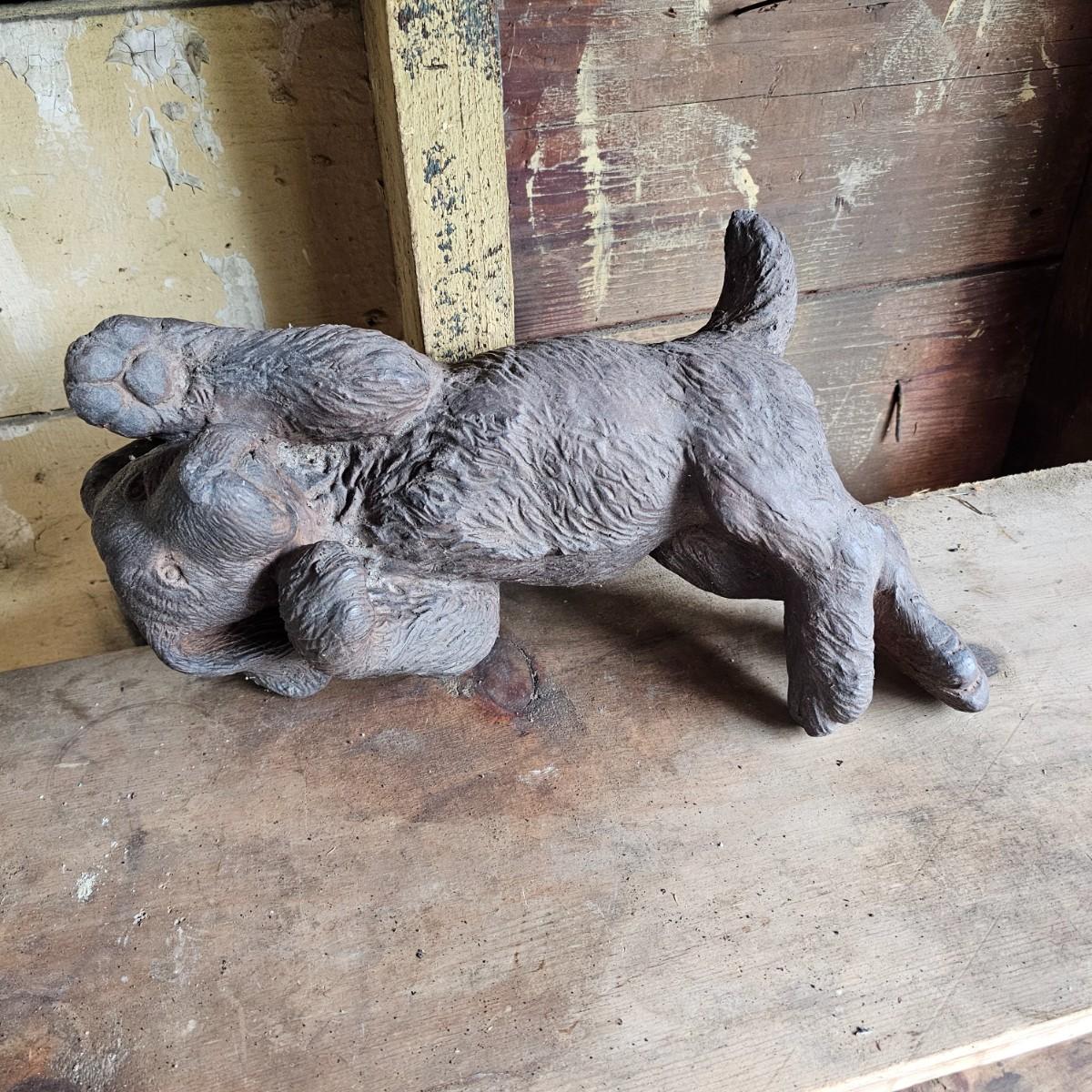 This one just begs to 'come rub my tummy'. Puppy has fun expression and paws all around. Sculpture measures 15" x 9" x 6"H, has small break/indent on back. See photos for details. Shipping available.