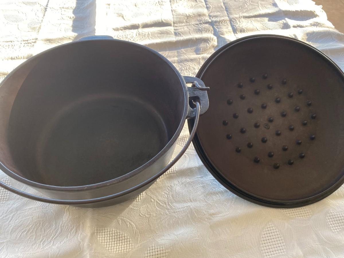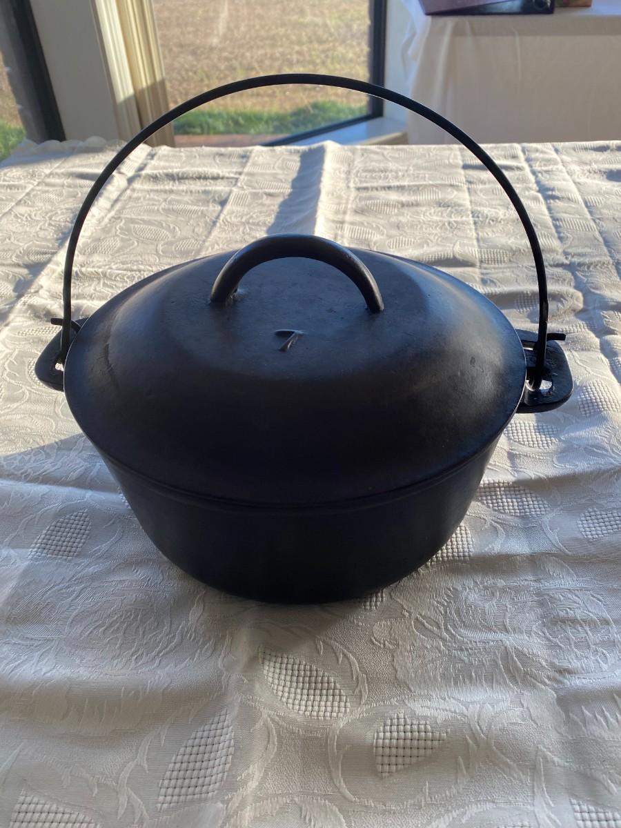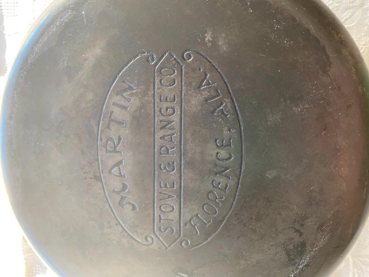 Cast-iron Dutch oven with lid & handle. Martin Stove & Range Co., Florence, AL. Excellent condition. Looks like it's never been used. Very smooth finish. Approx. 9-1/4" diameter