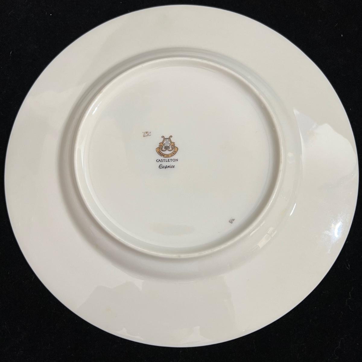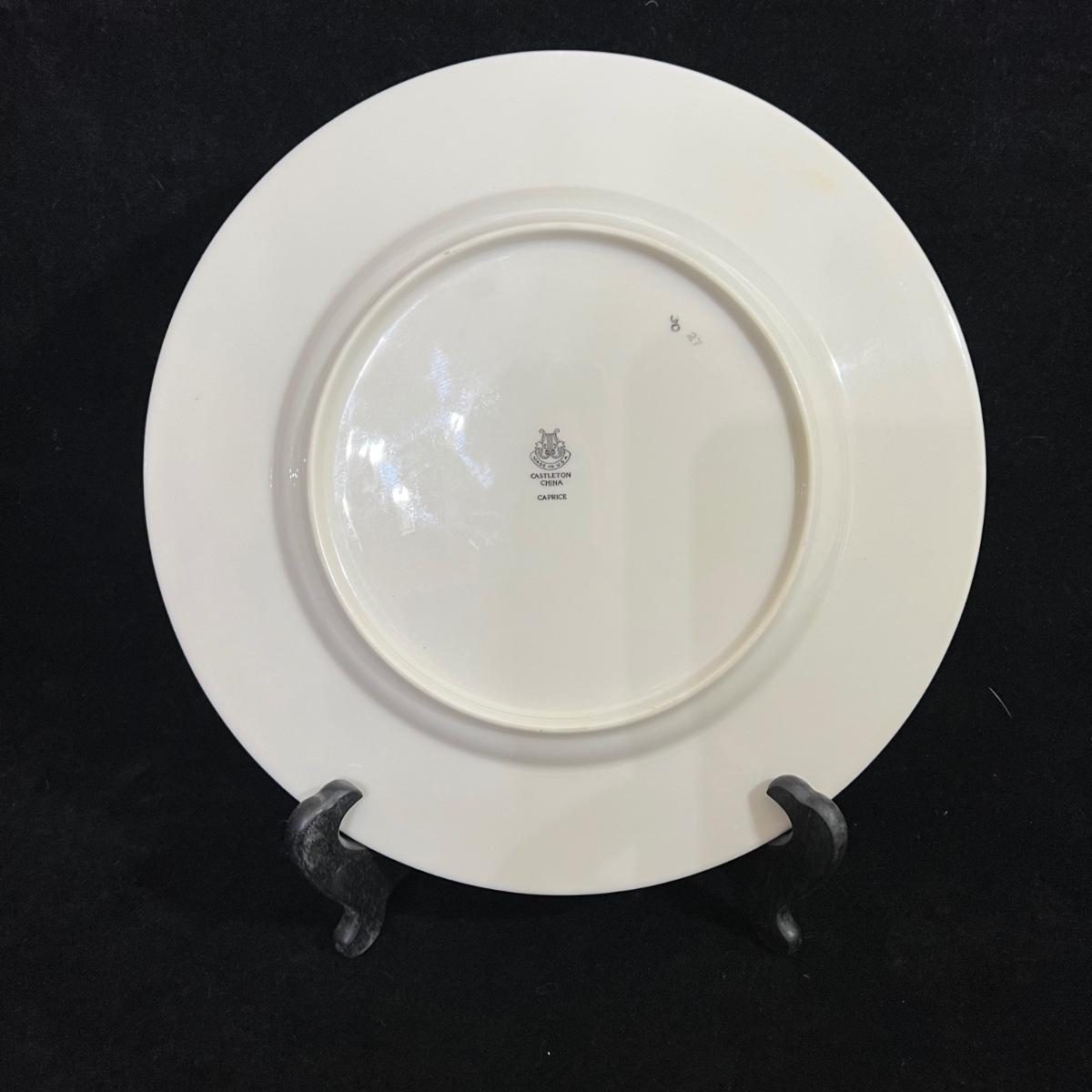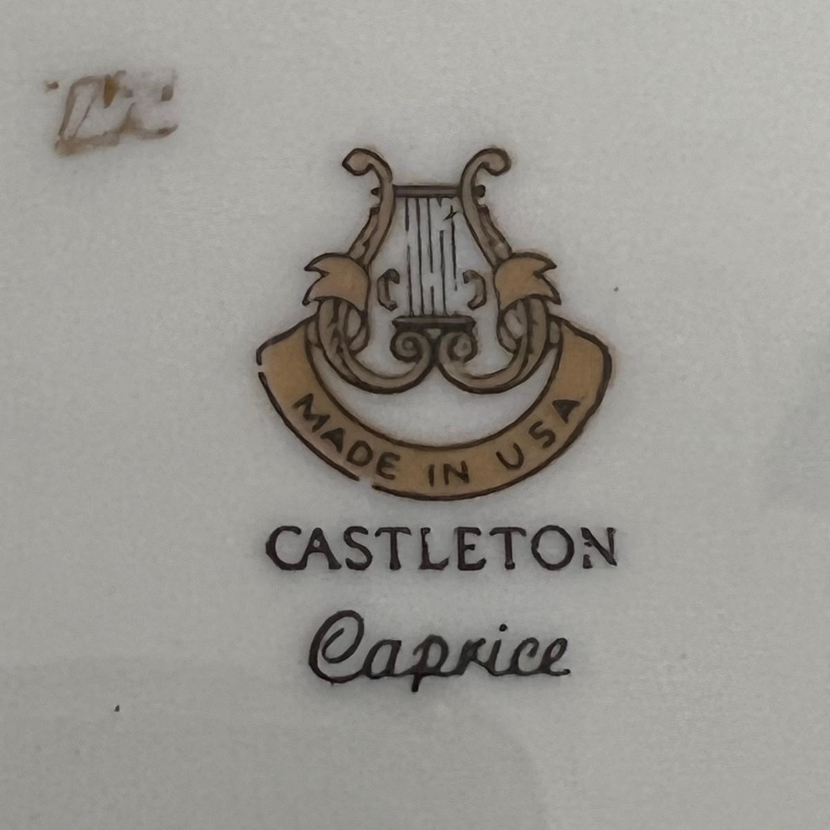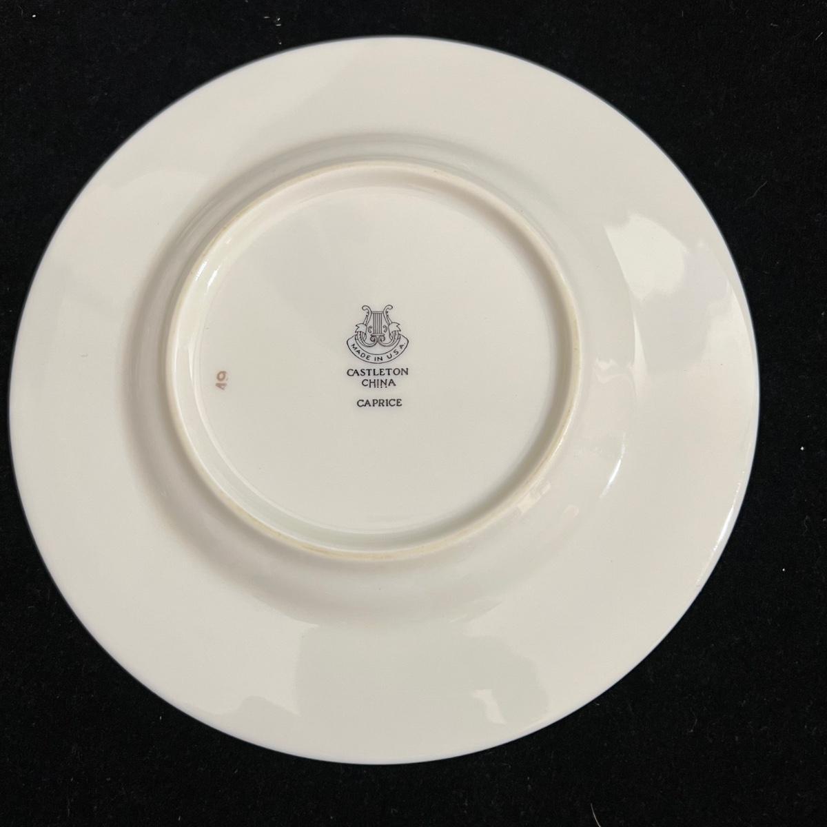 Castleton Caprice China dinner ware includes eight 10.75”D dinner plates, nine 6.25”D bread and butter plates, eight 6” tea saucers, eight 2.25” H x 4.25”D tea cups, and one 8.25”D salad plate. The set is an overall good condition with chips in one tea cup and one tea saucer (shown in the photographs). Plate stand not included. Shipping available.