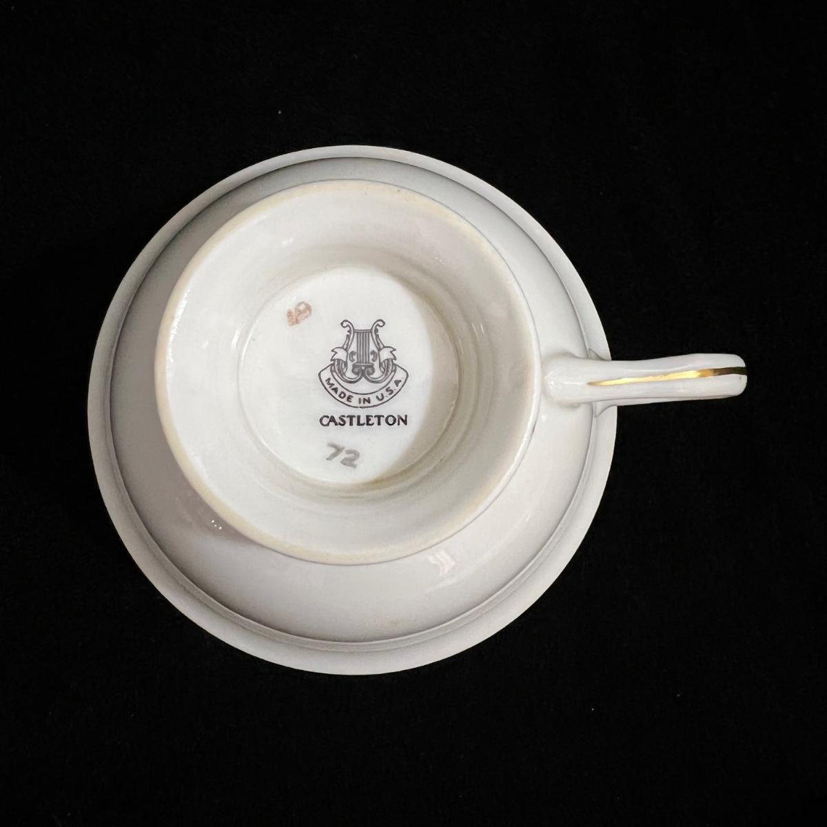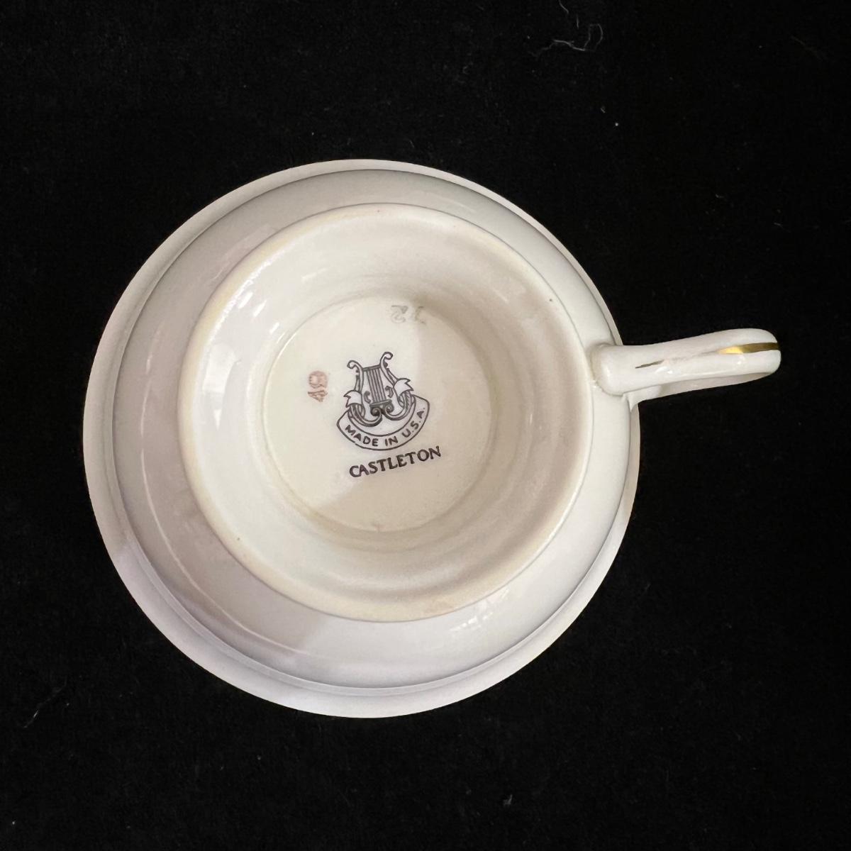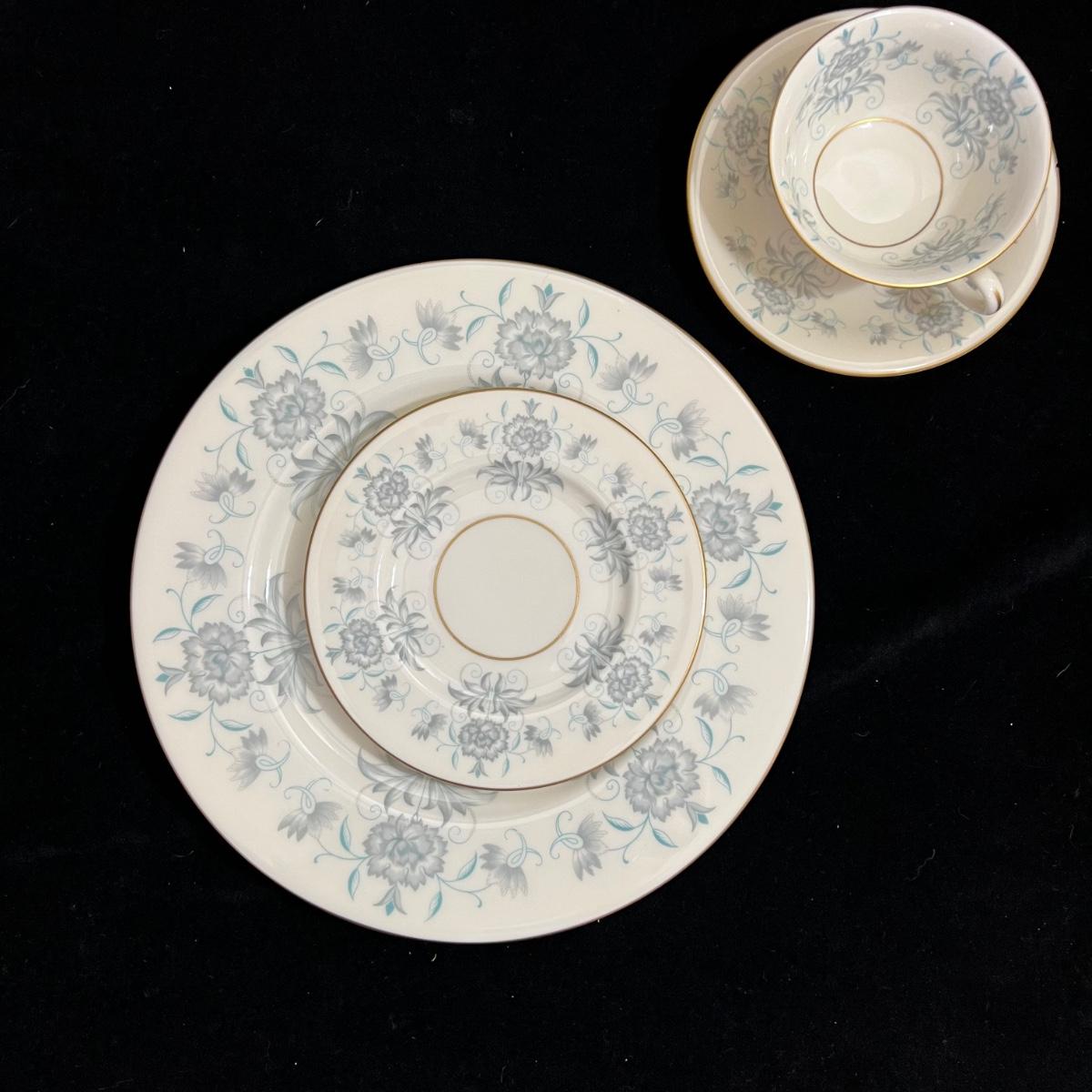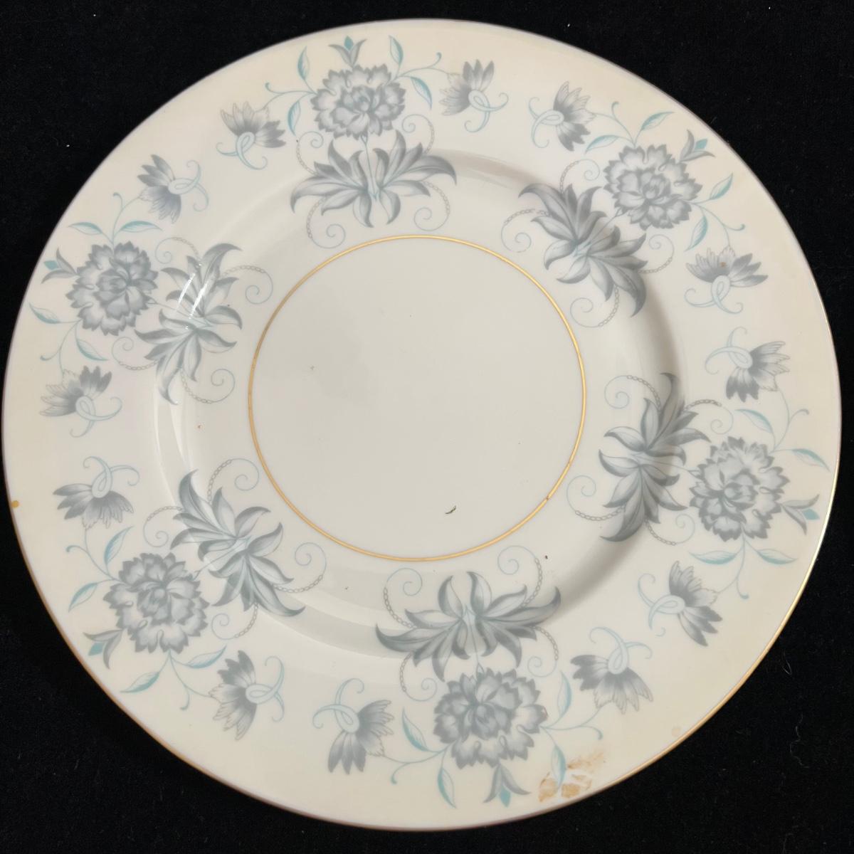 Castleton Caprice China dinner ware includes eight 10.75”D dinner plates, nine 6.25”D bread and butter plates, eight 6” tea saucers, eight 2.25” H x 4.25”D tea cups, and one 8.25”D salad plate. The set is an overall good condition with chips in one tea cup and one tea saucer (shown in the photographs). Plate stand not included. Shipping available.