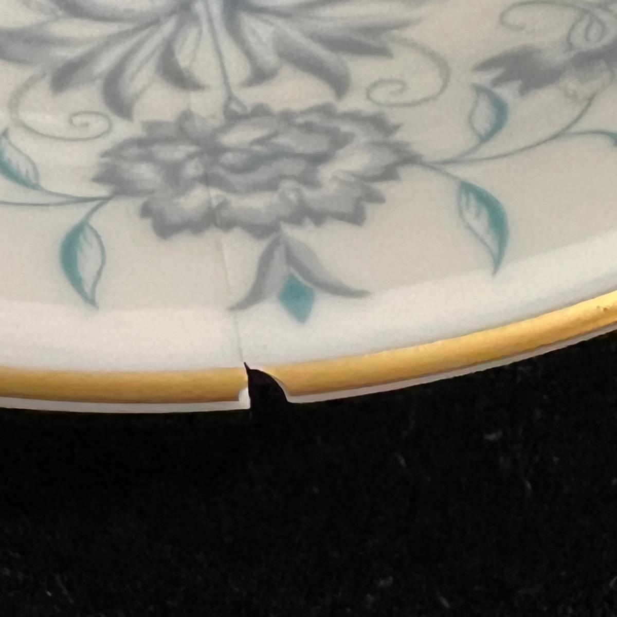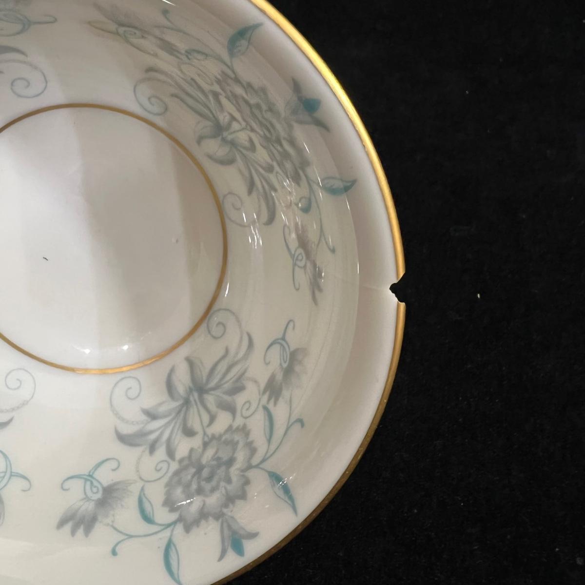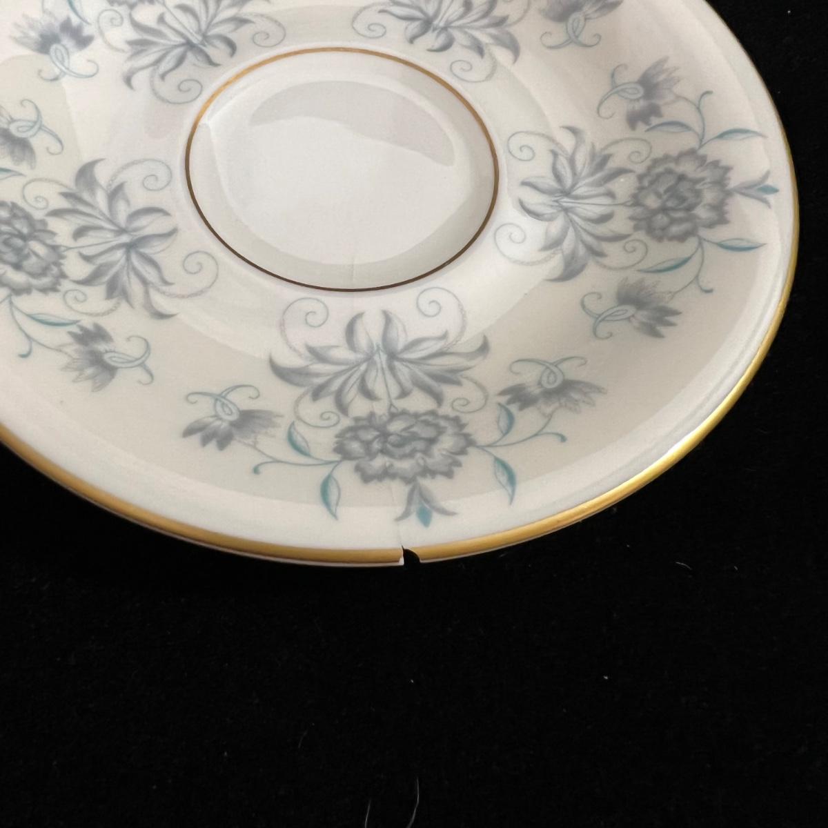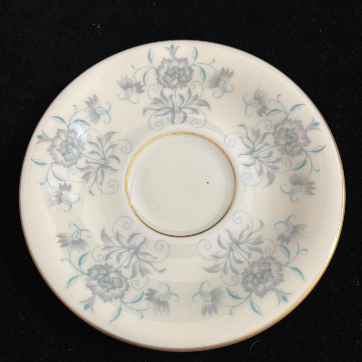 Castleton Caprice China dinner ware includes eight 10.75”D dinner plates, nine 6.25”D bread and butter plates, eight 6” tea saucers, eight 2.25” H x 4.25”D tea cups, and one 8.25”D salad plate. The set is an overall good condition with chips in one tea cup and one tea saucer (shown in the photographs). Plate stand not included. Shipping available.