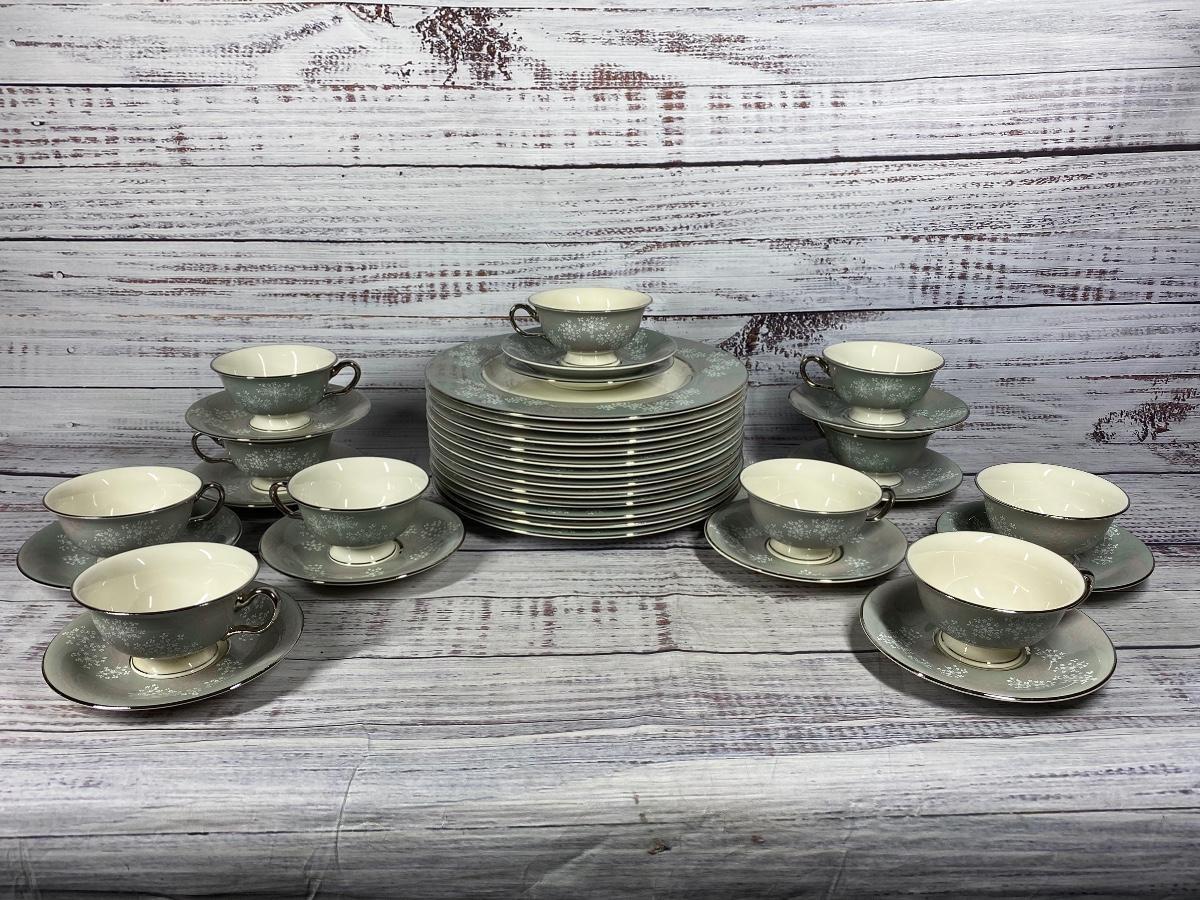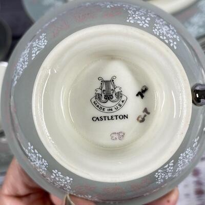 Castleton China "Lace" pattern china. 47 pieces, 11 cup and saucers, a saucer, and 12 dinner plates. Grey tone edge with pink and white floral design. There is a slight color variation to the grey amongst pieces, some darker then others, not sure why. No chipped pieces.
