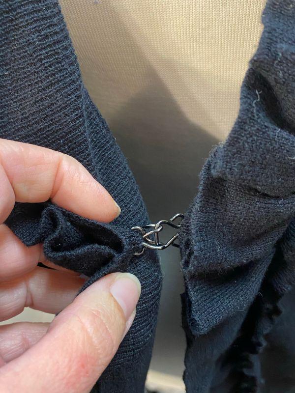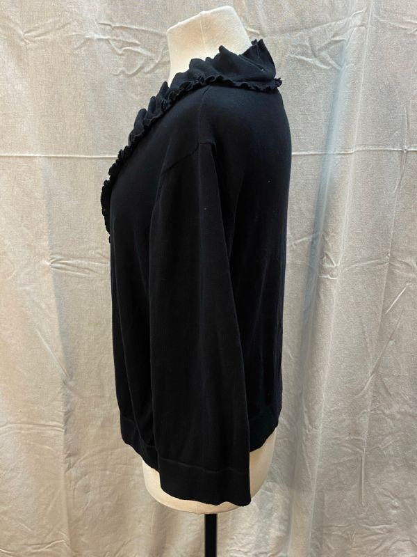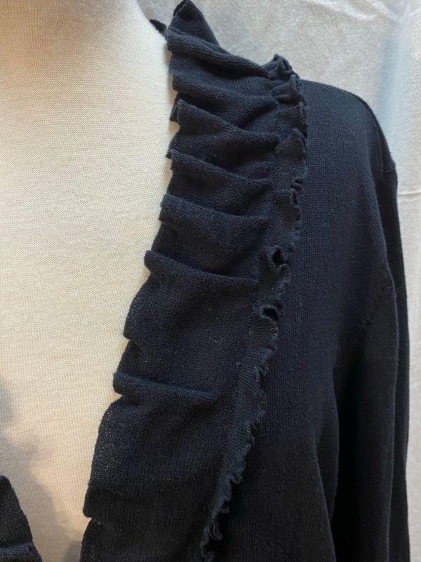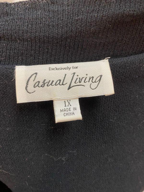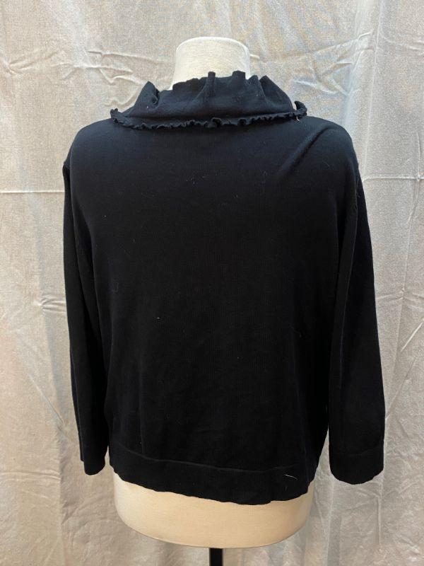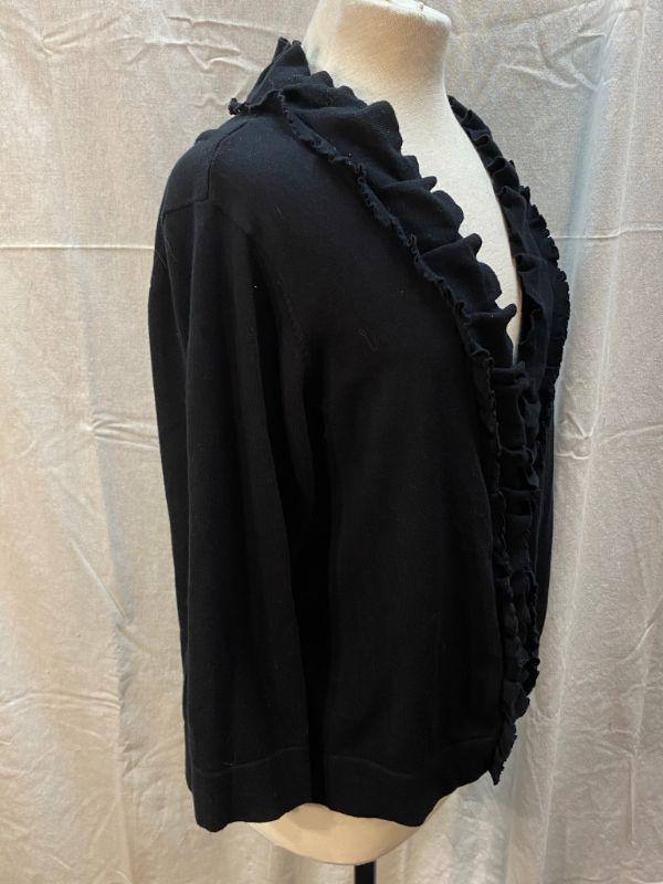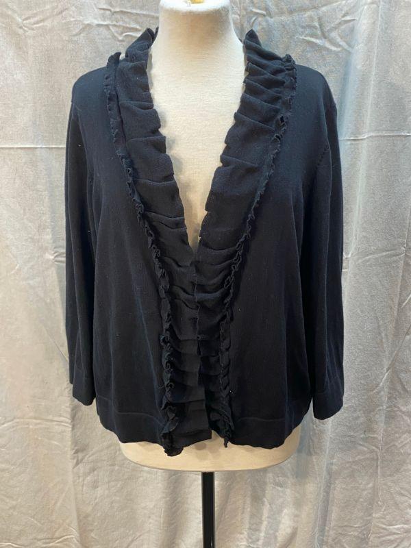 Casual Living black ruffle edge sweater. Hook and eye closure. Size 1X. Good condition.