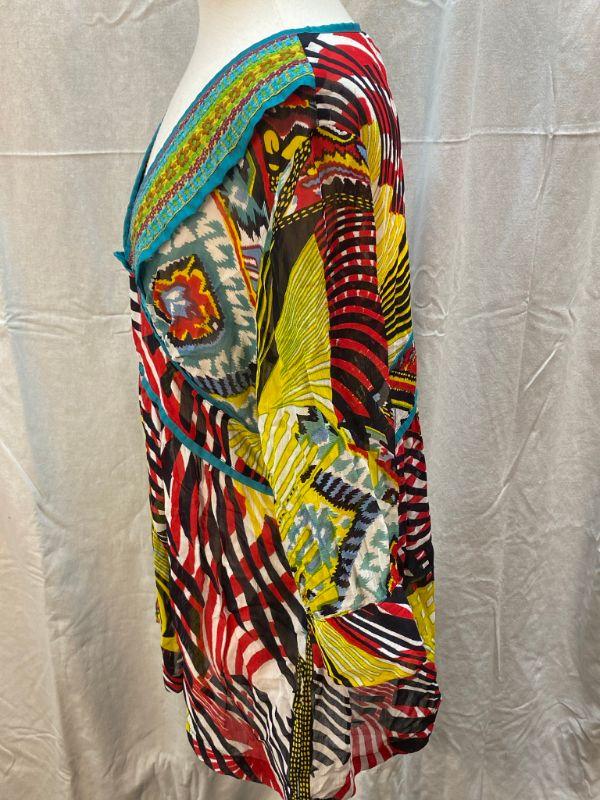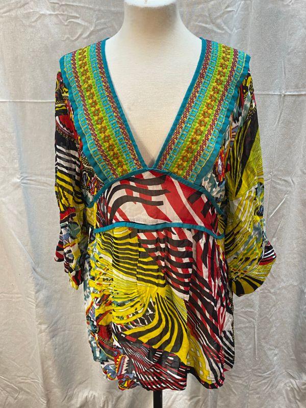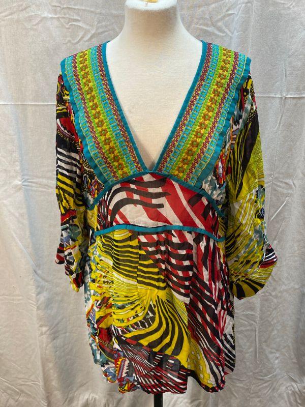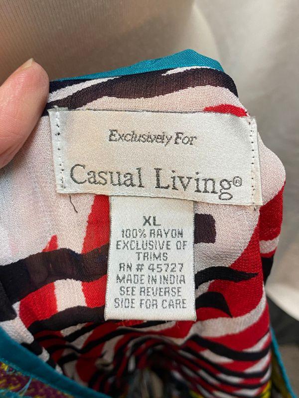 Casual Living brightly colored rayon blouse. Colorful print with embroidered neckline. Size XL. Good condition.