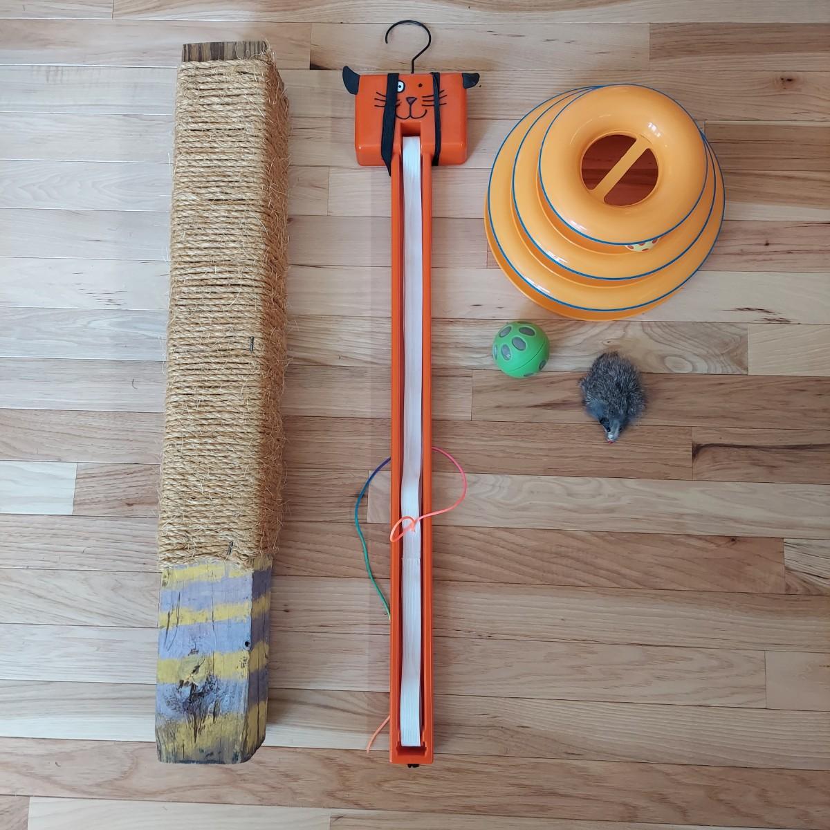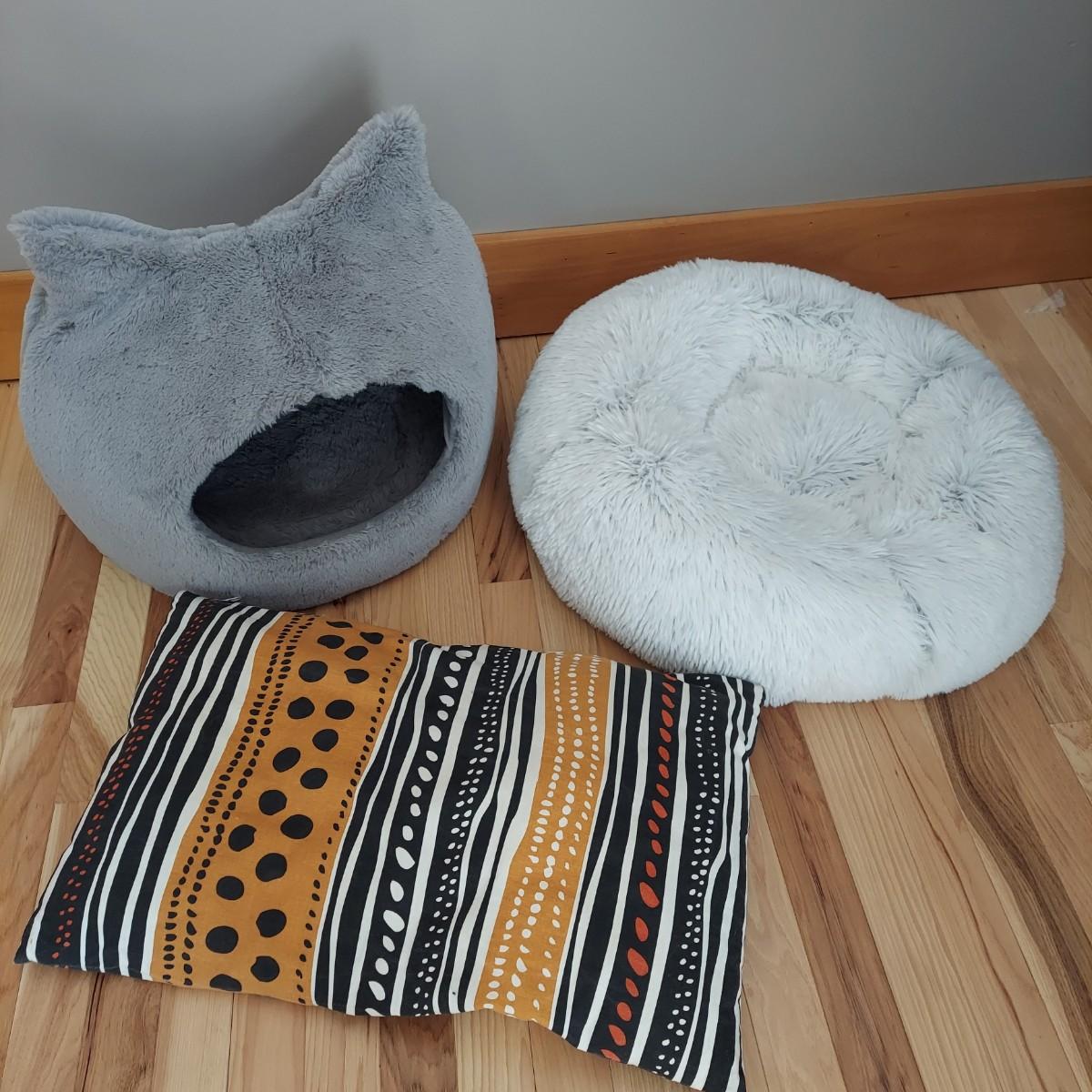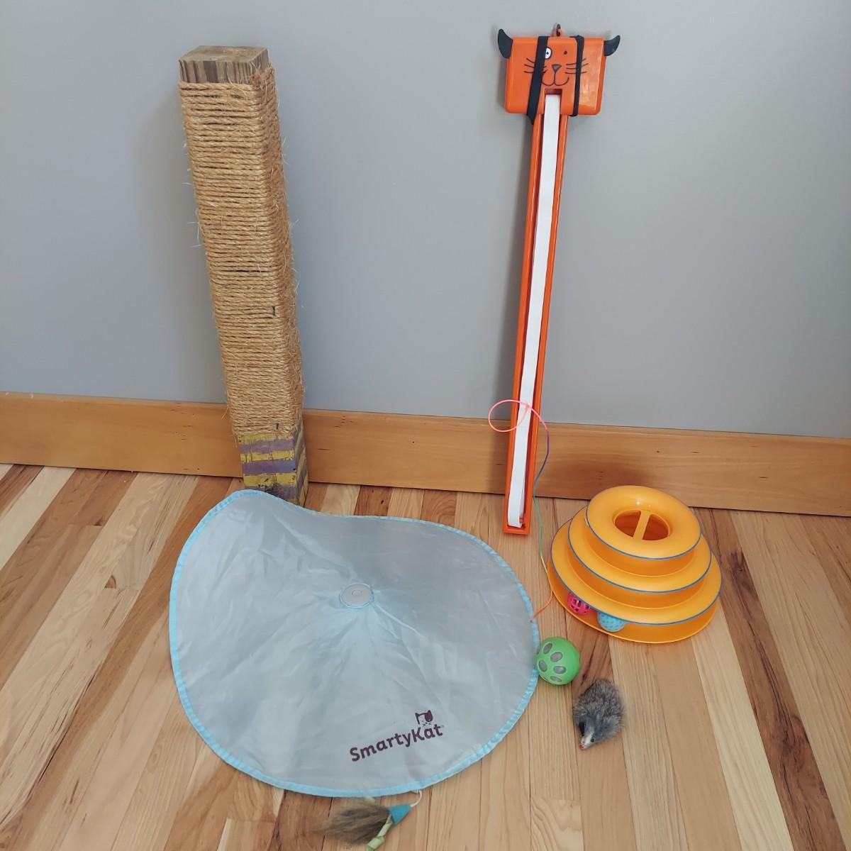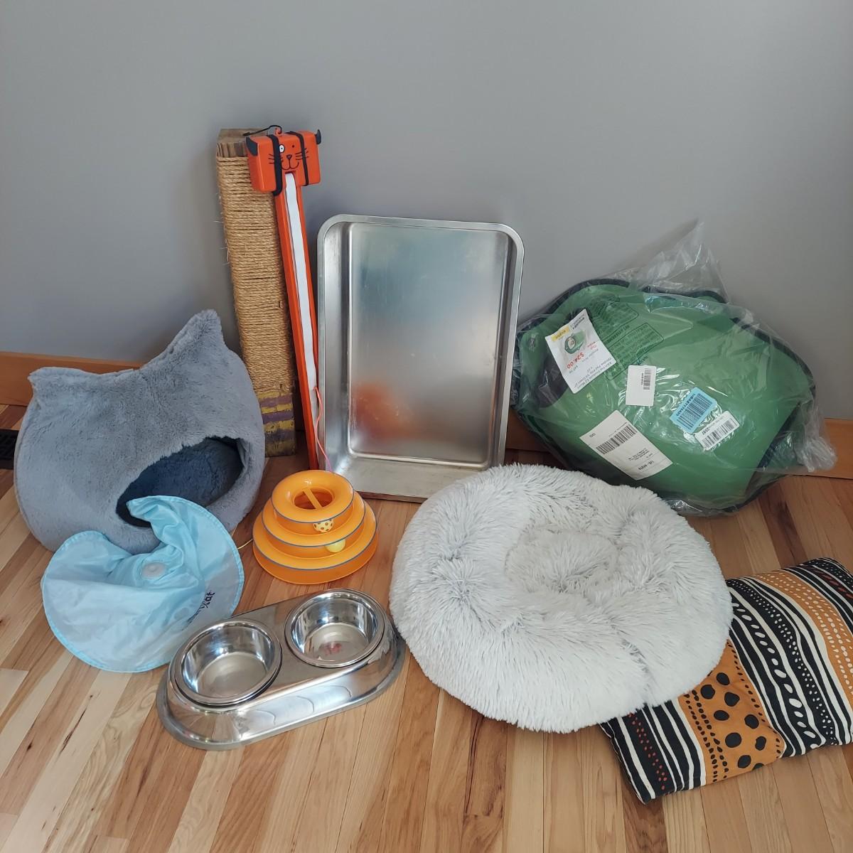 Cat lot with 10 pieces including fluffy bed, cat shaped nap spot, window mount pod, stainless steel litter pan and food dish. Other toys and scratchers also included. Most items are in used condition. Seller should be prepared to clean items. Smart Kitty toy is battery operated. It powers up.