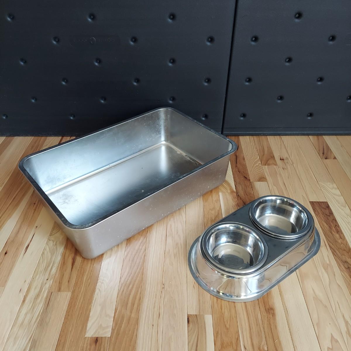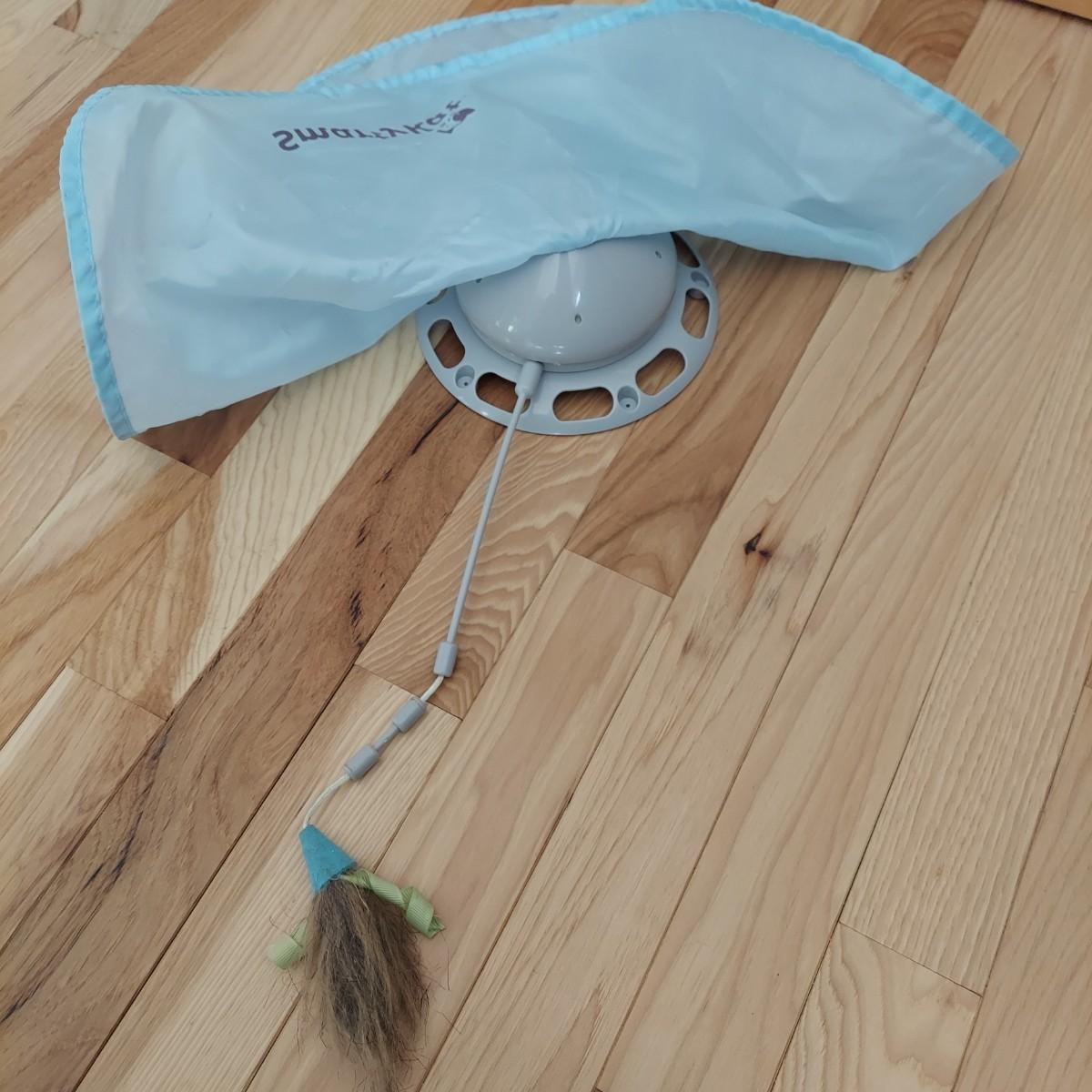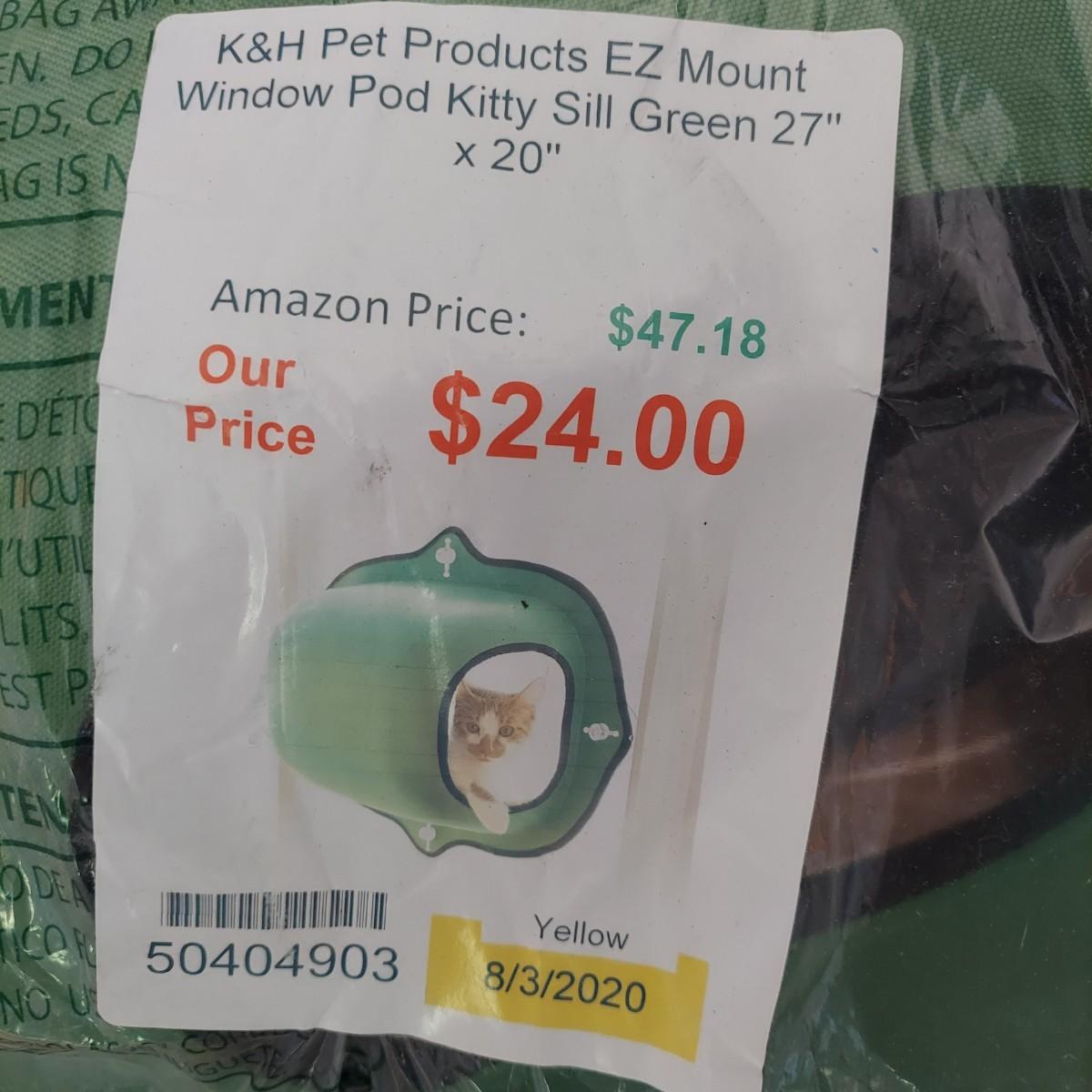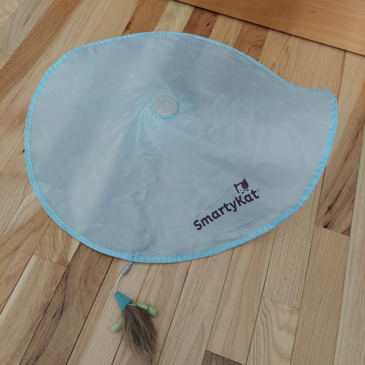 Cat lot with 10 pieces including fluffy bed, cat shaped nap spot, window mount pod, stainless steel litter pan and food dish. Other toys and scratchers also included. Most items are in used condition. Seller should be prepared to clean items. Smart Kitty toy is battery operated. It powers up.