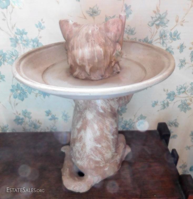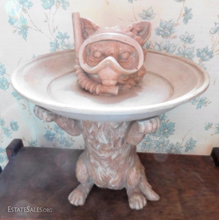 Heavy resin cat birdbath. Cat is in scuba gear holding the bath in its paws. Is nice for outside or indoor décor. No visible signs of breaks or cracks. Good to excellent condition. Wonderful piece for cat lovers!