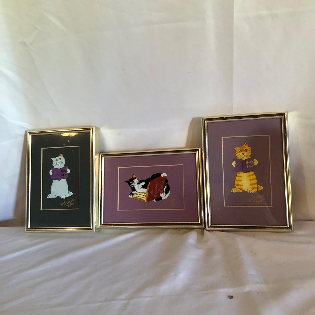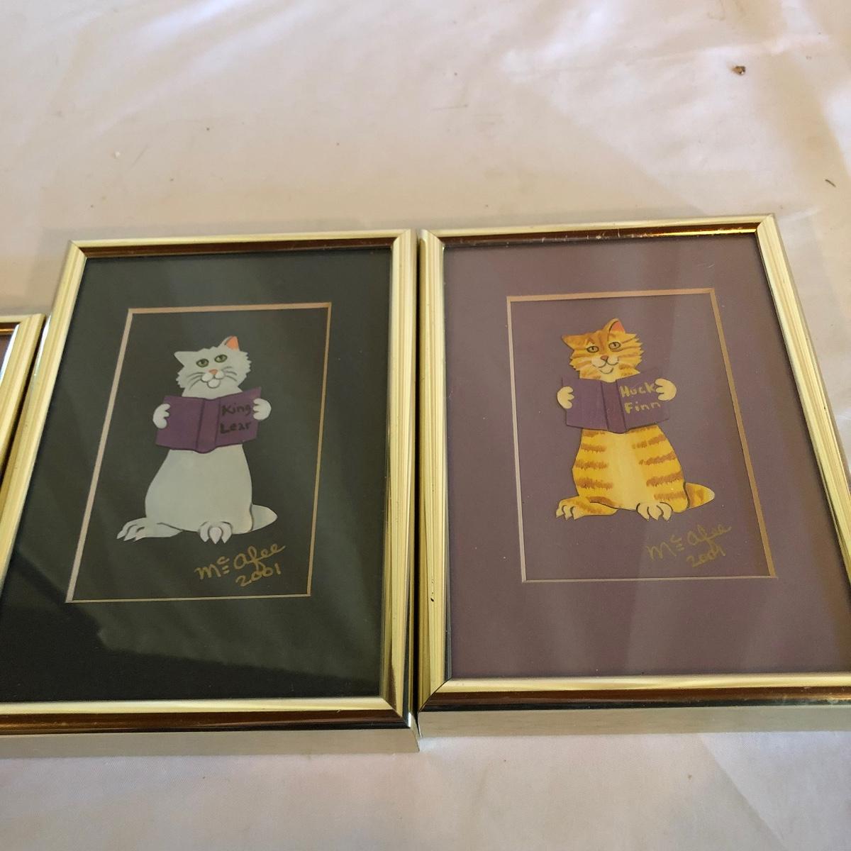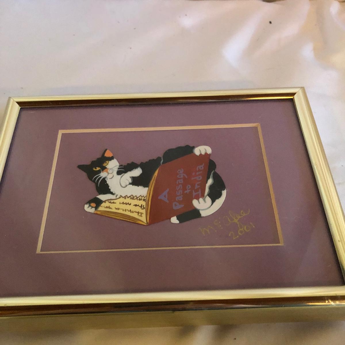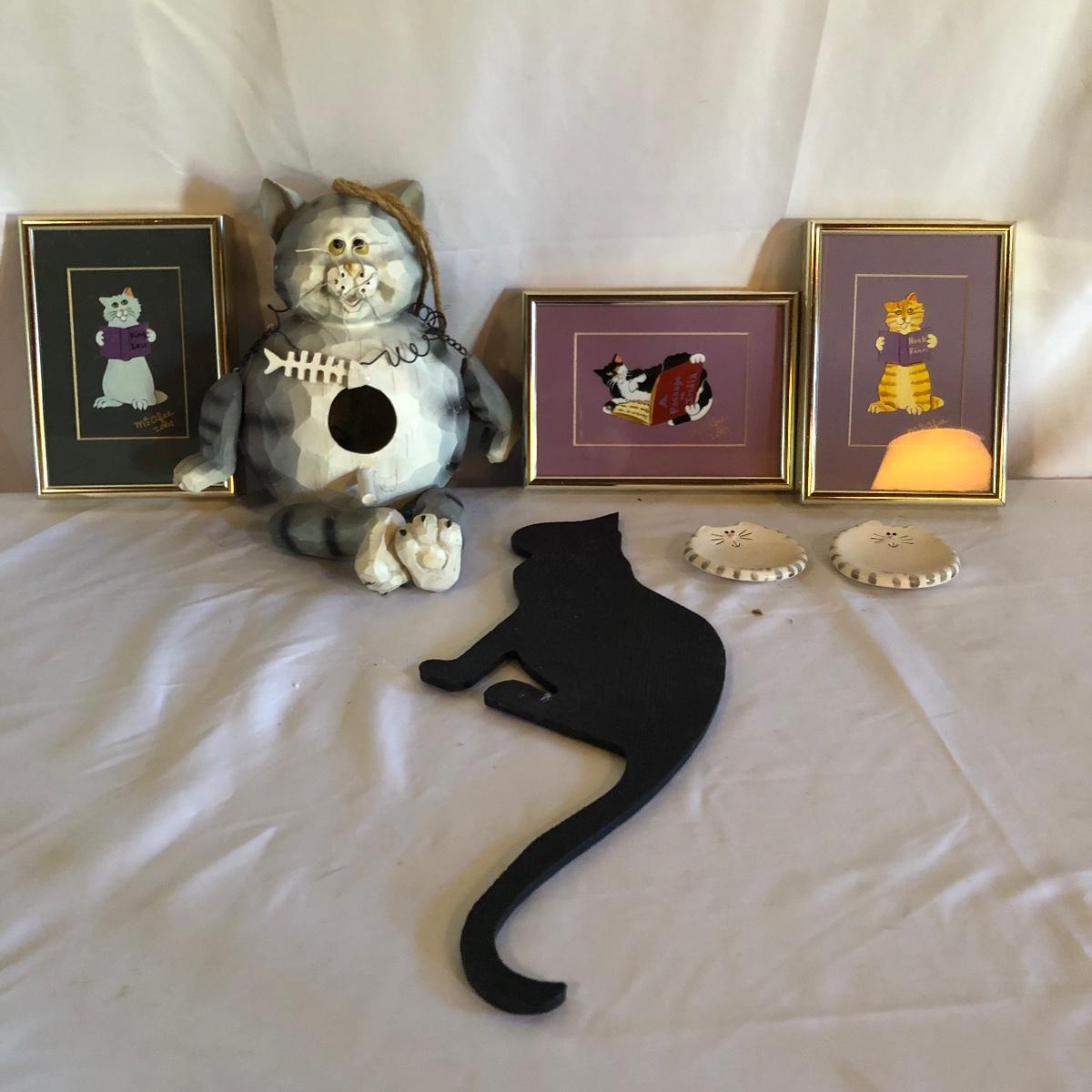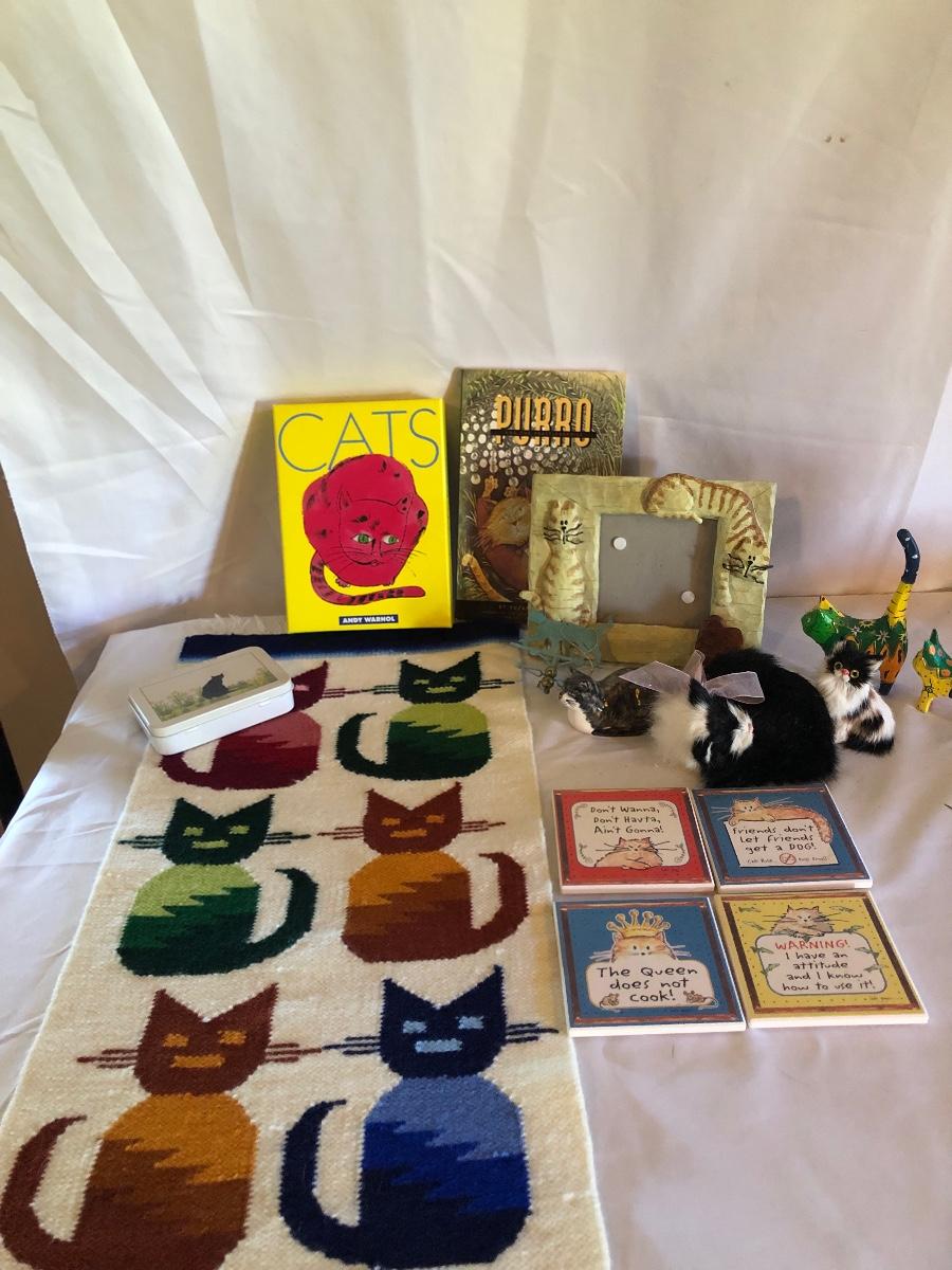Lot includes signed Purro book, four ceramic coasters picture frame, fabric wall hanging, two colorful wooden cats, two furry cats, Andy Warhol note cards and more. Also includes three signed and framed cat prints, cat birdhouse, silhouette and two ceramic cat mini dishes. Birdhouse measures 6.5” x 8” x 12”. Frame measures 6.5” x 7”.