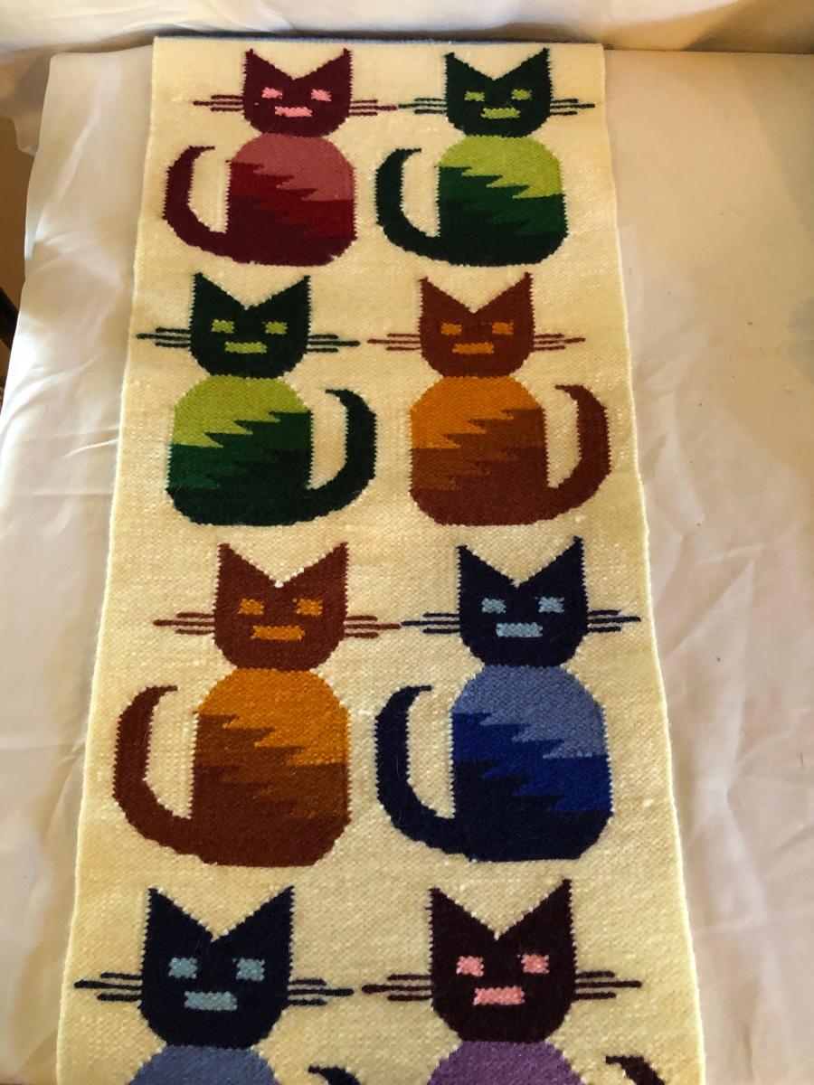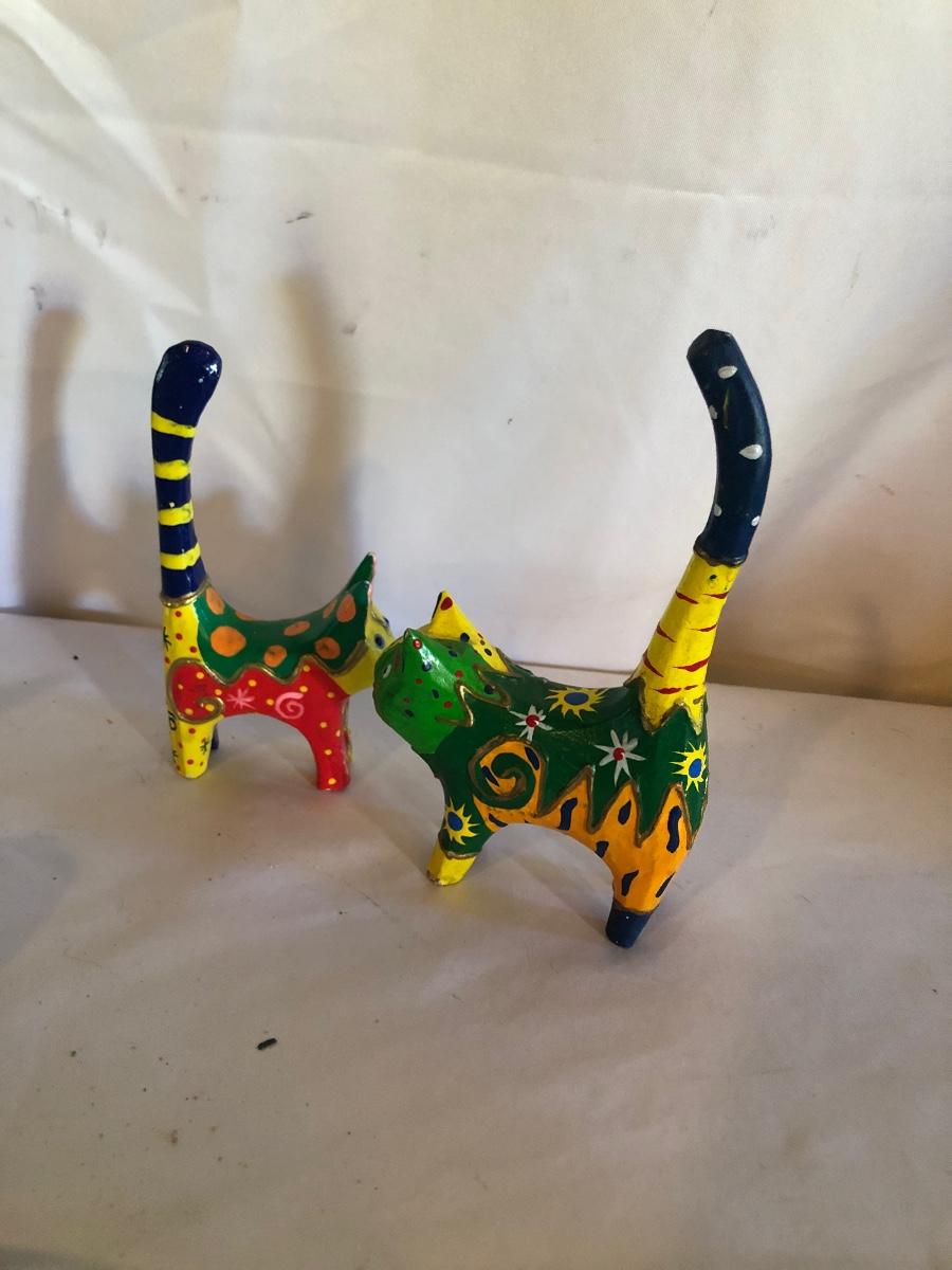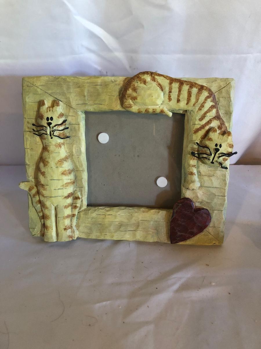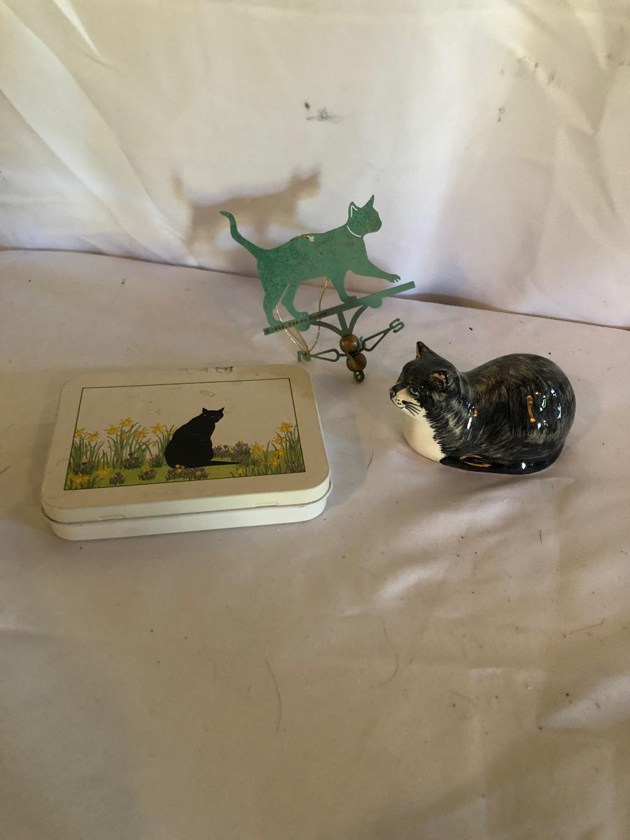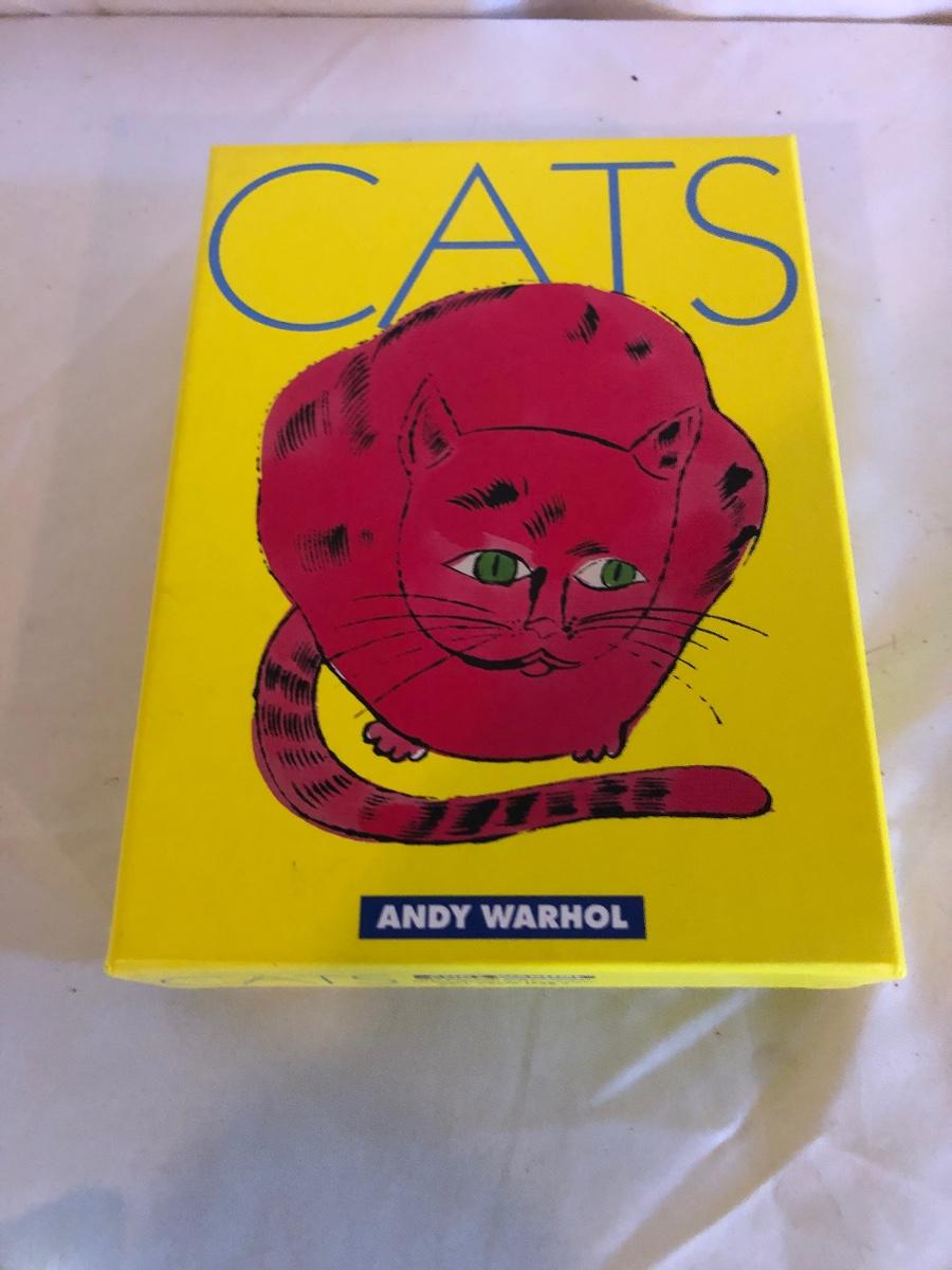 Lot includes signed Purro book, four ceramic coasters picture frame, fabric wall hanging, two colorful wooden cats, two furry cats, Andy Warhol note cards and more. Also includes three signed and framed cat prints, cat birdhouse, silhouette and two ceramic cat mini dishes. Birdhouse measures 6.5” x 8” x 12”. Frame measures 6.5” x 7”.