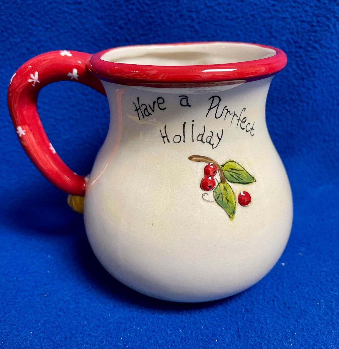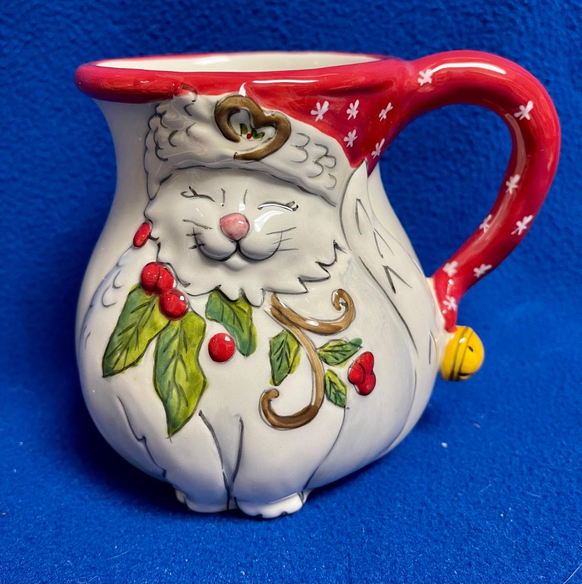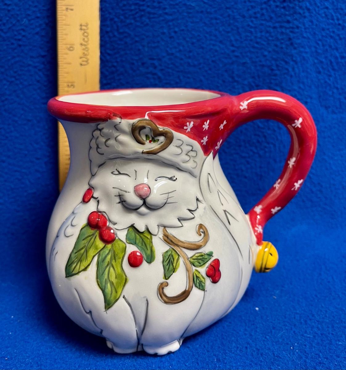 White Cat Cup Mug Heather Goldmine Blue Sky Ceramic Co. Pitcher 2013 Christmas Holiday Decor