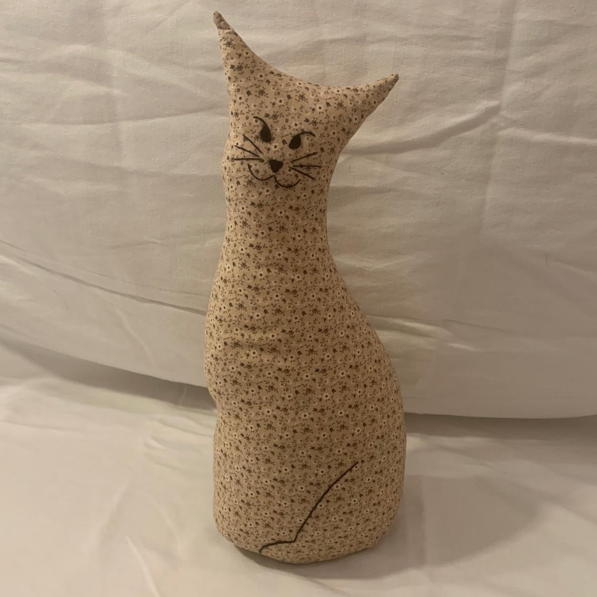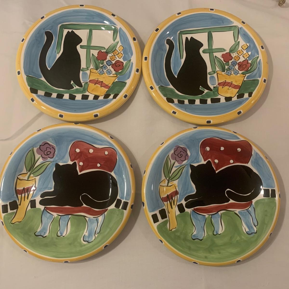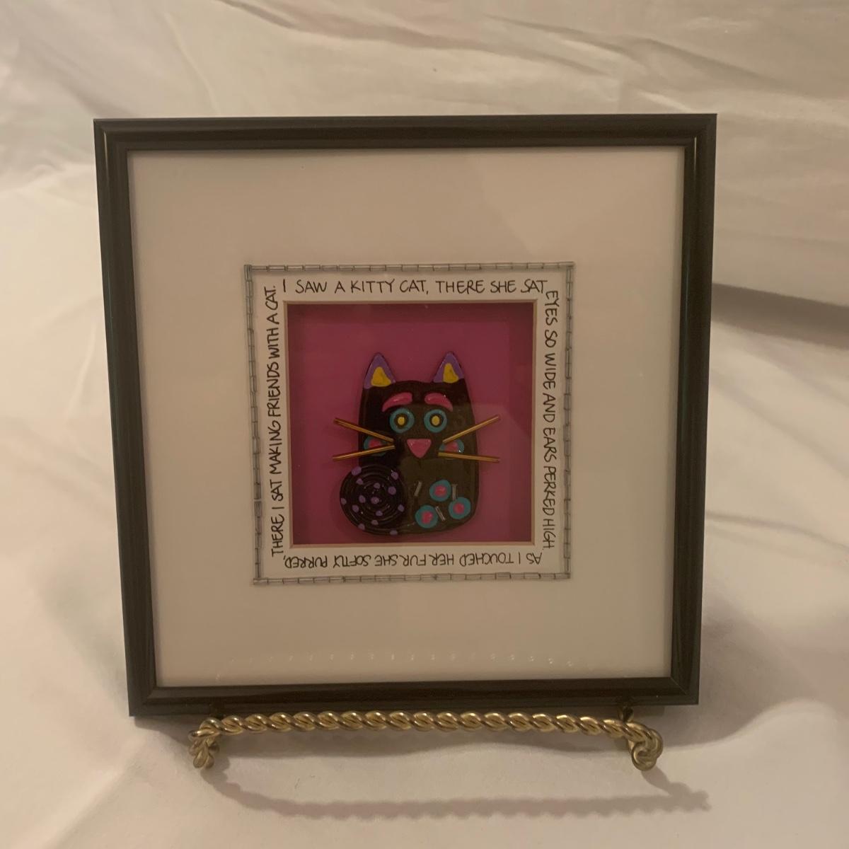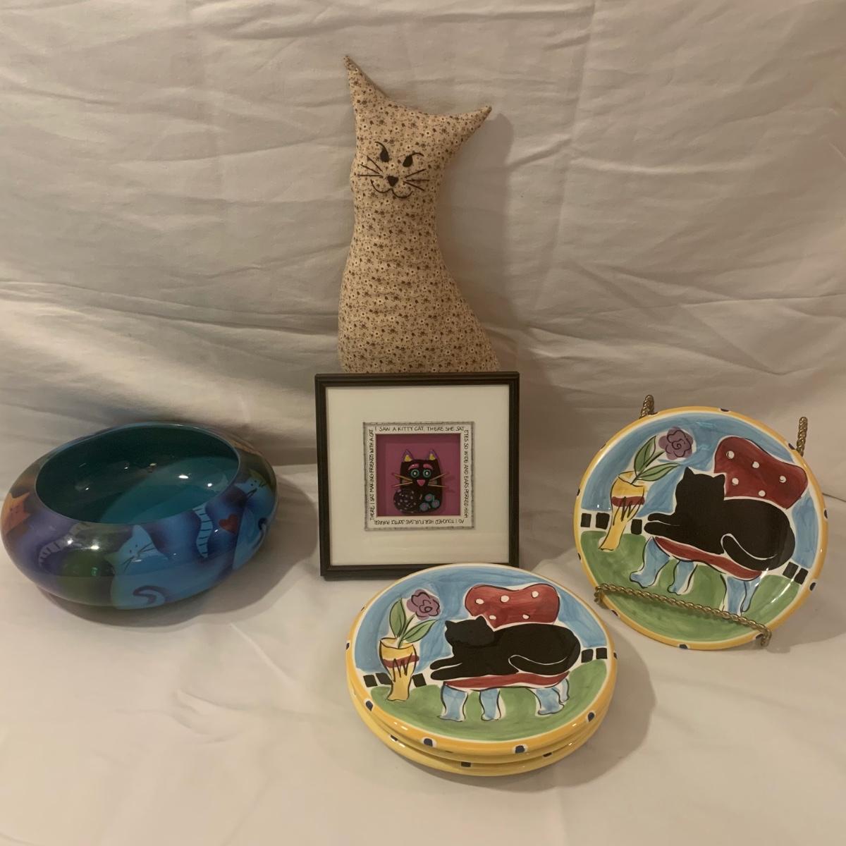 This lot includes four painted cat saucers, fabric cat doorstop with weighted base, glass framed Bright Star Design Cat art, and colorful painted cat serving bowl. Serving bowl is signed, “Stiles”. Largest item, the fabric cat, measures, 6” x 4” x 17”H.