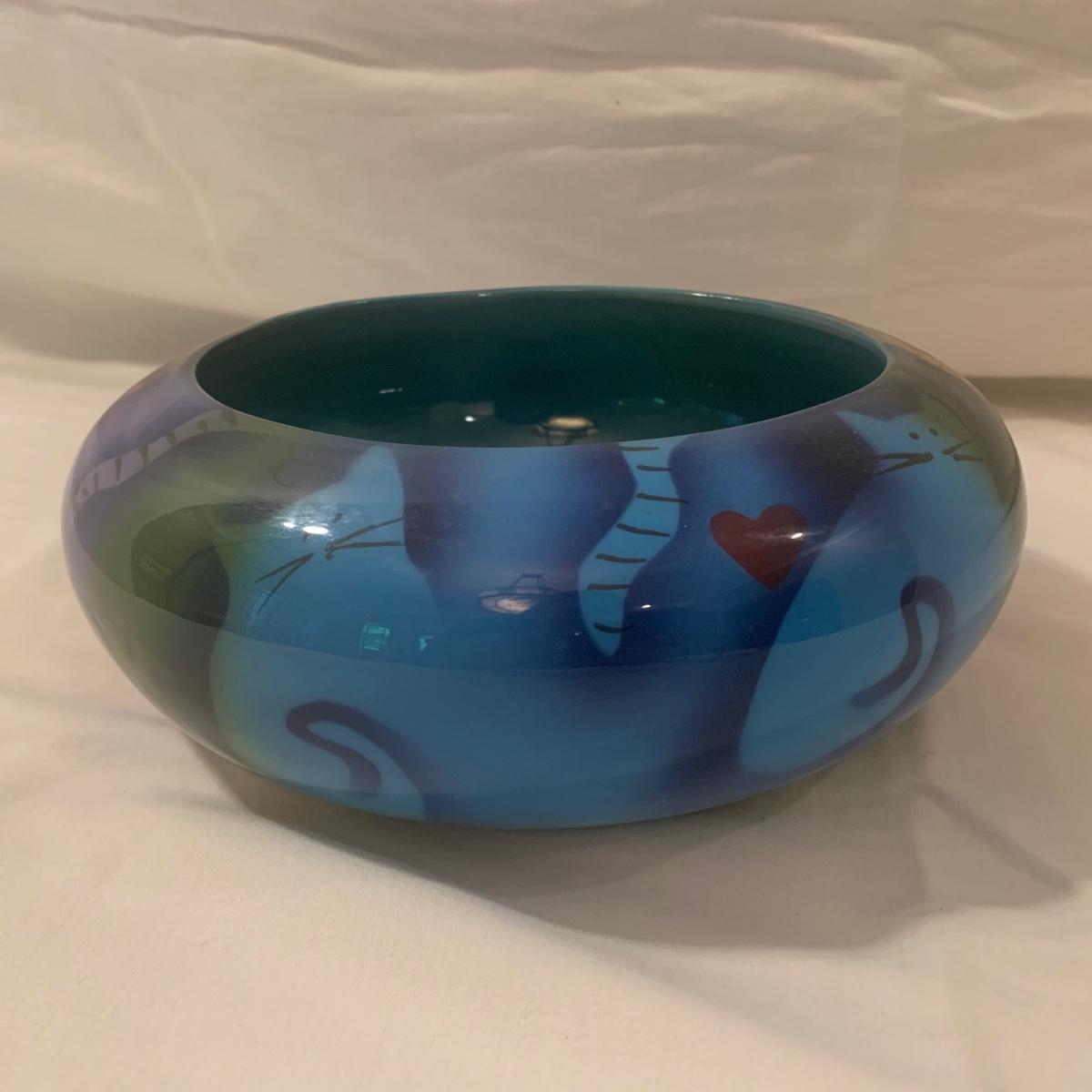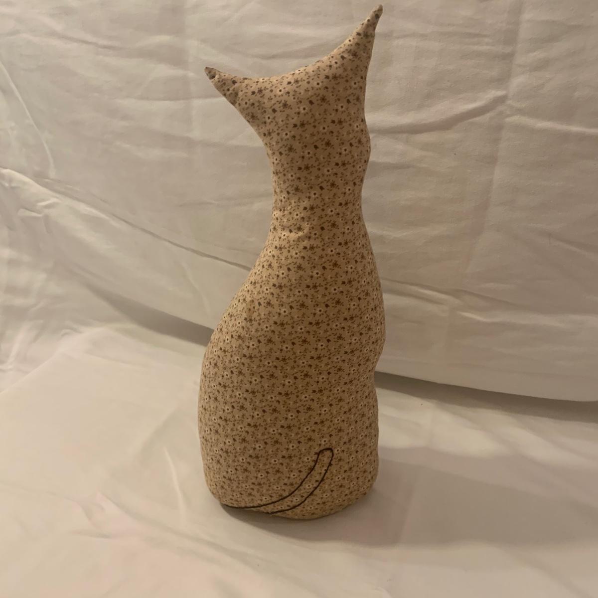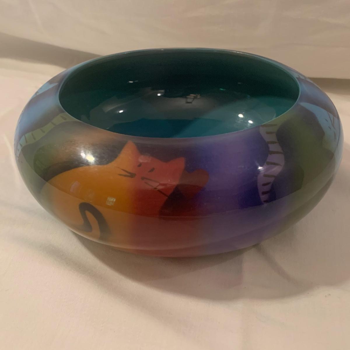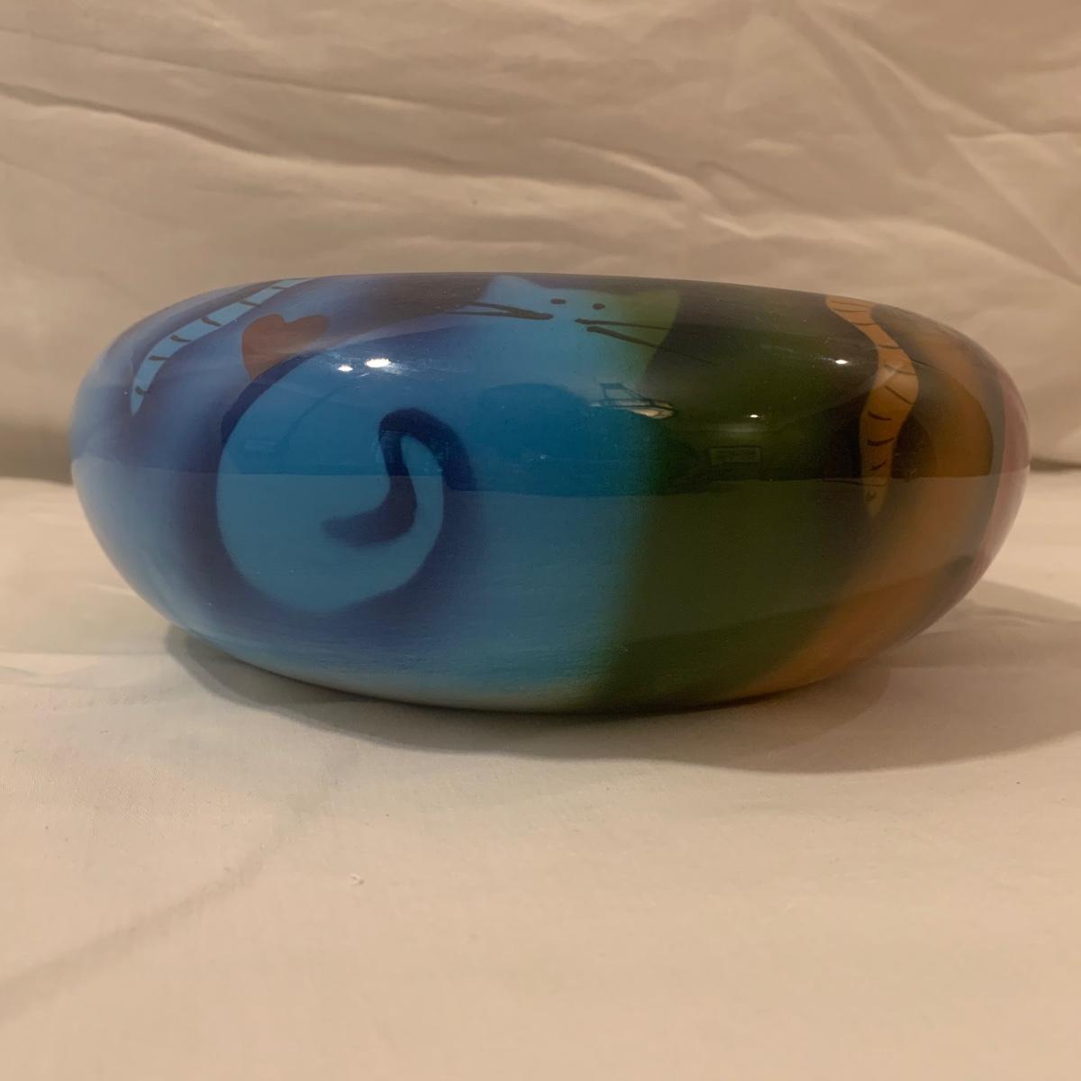 This lot includes four painted cat saucers, fabric cat doorstop with weighted base, glass framed Bright Star Design Cat art, and colorful painted cat serving bowl. Serving bowl is signed, “Stiles”. Largest item, the fabric cat, measures, 6” x 4” x 17”H.