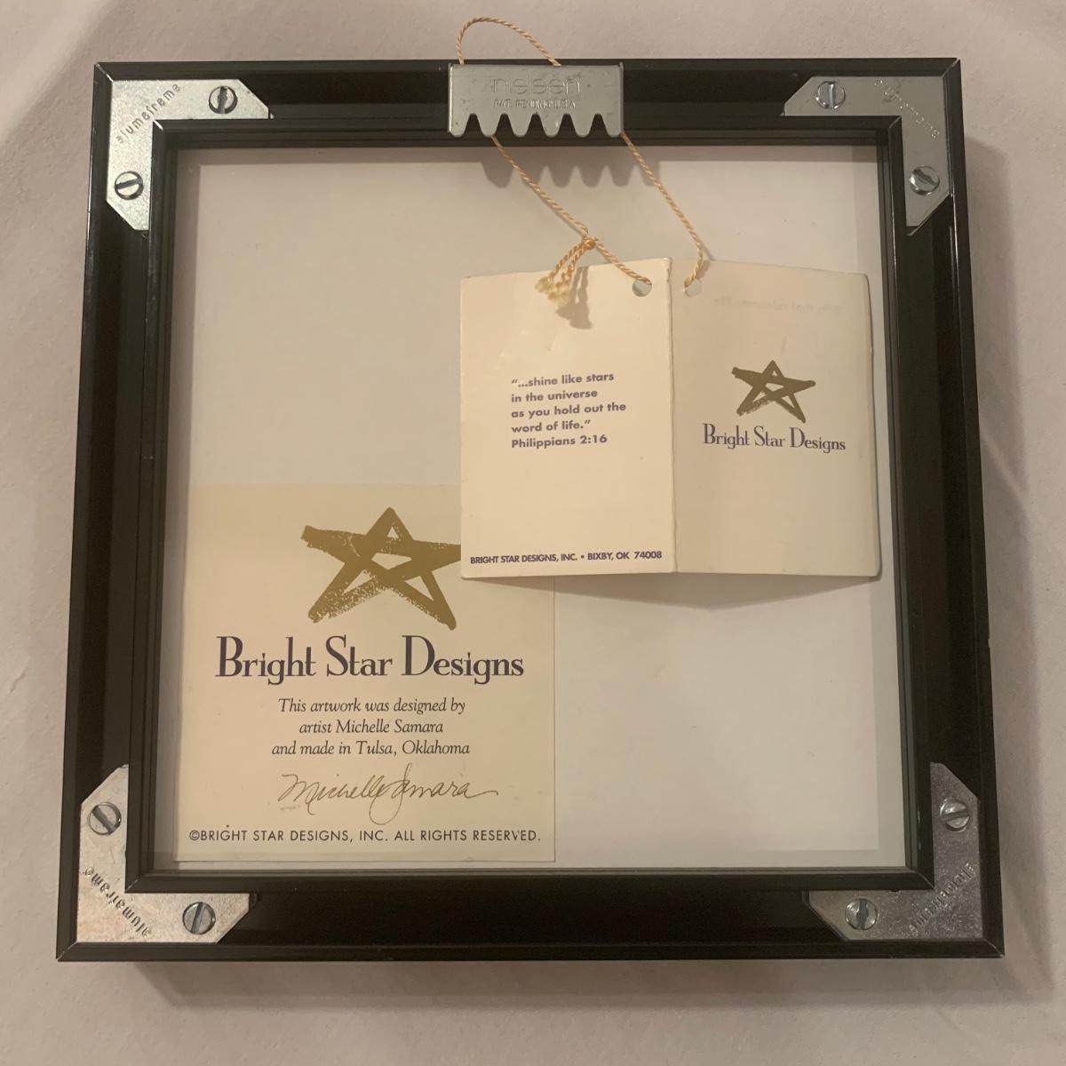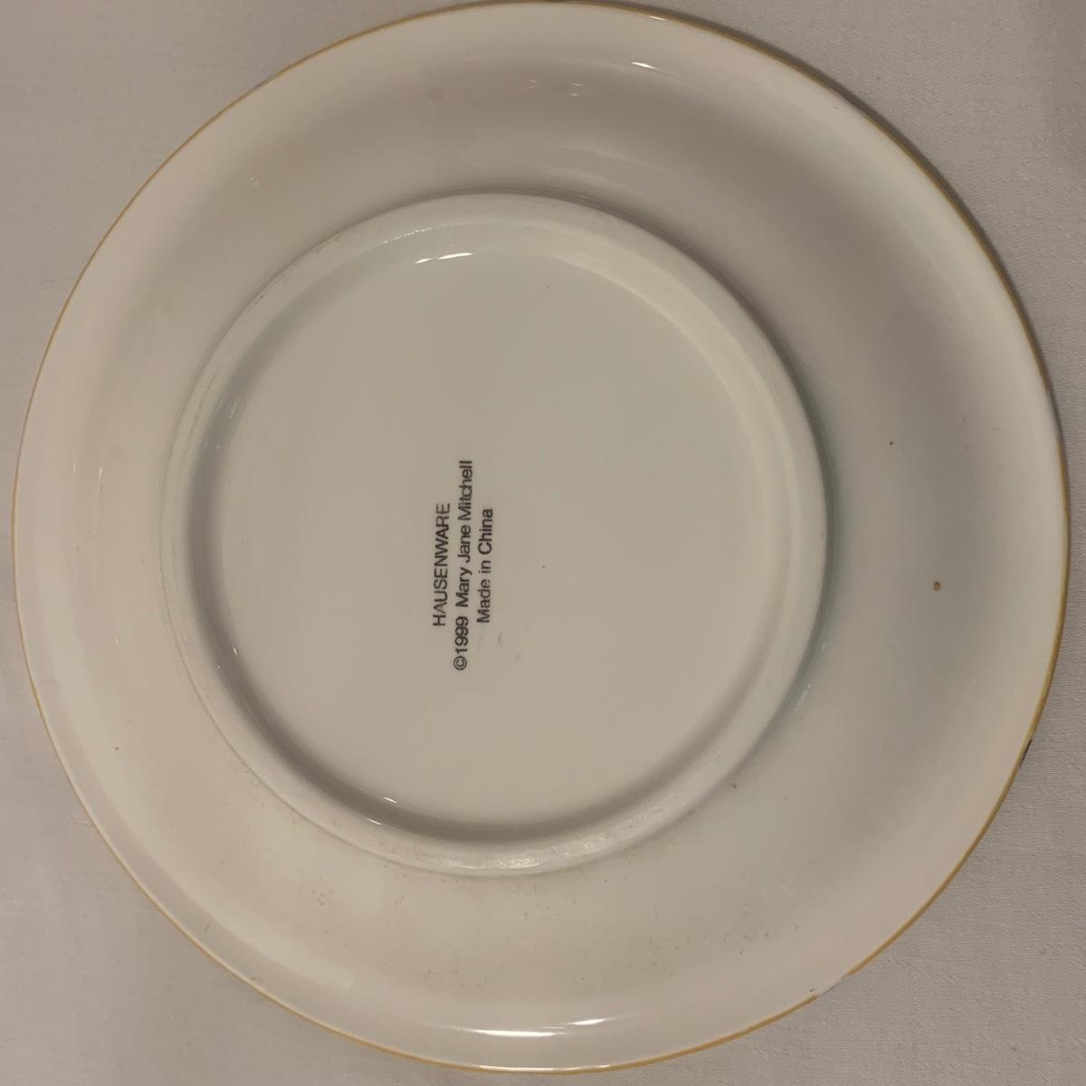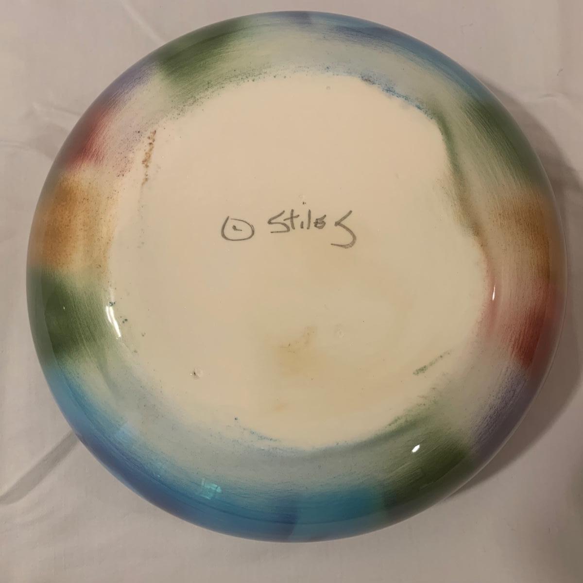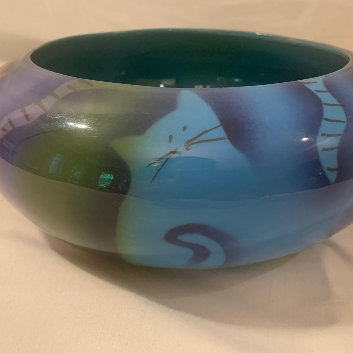 This lot includes four painted cat saucers, fabric cat doorstop with weighted base, glass framed Bright Star Design Cat art, and colorful painted cat serving bowl. Serving bowl is signed, “Stiles”. Largest item, the fabric cat, measures, 6” x 4” x 17”H.