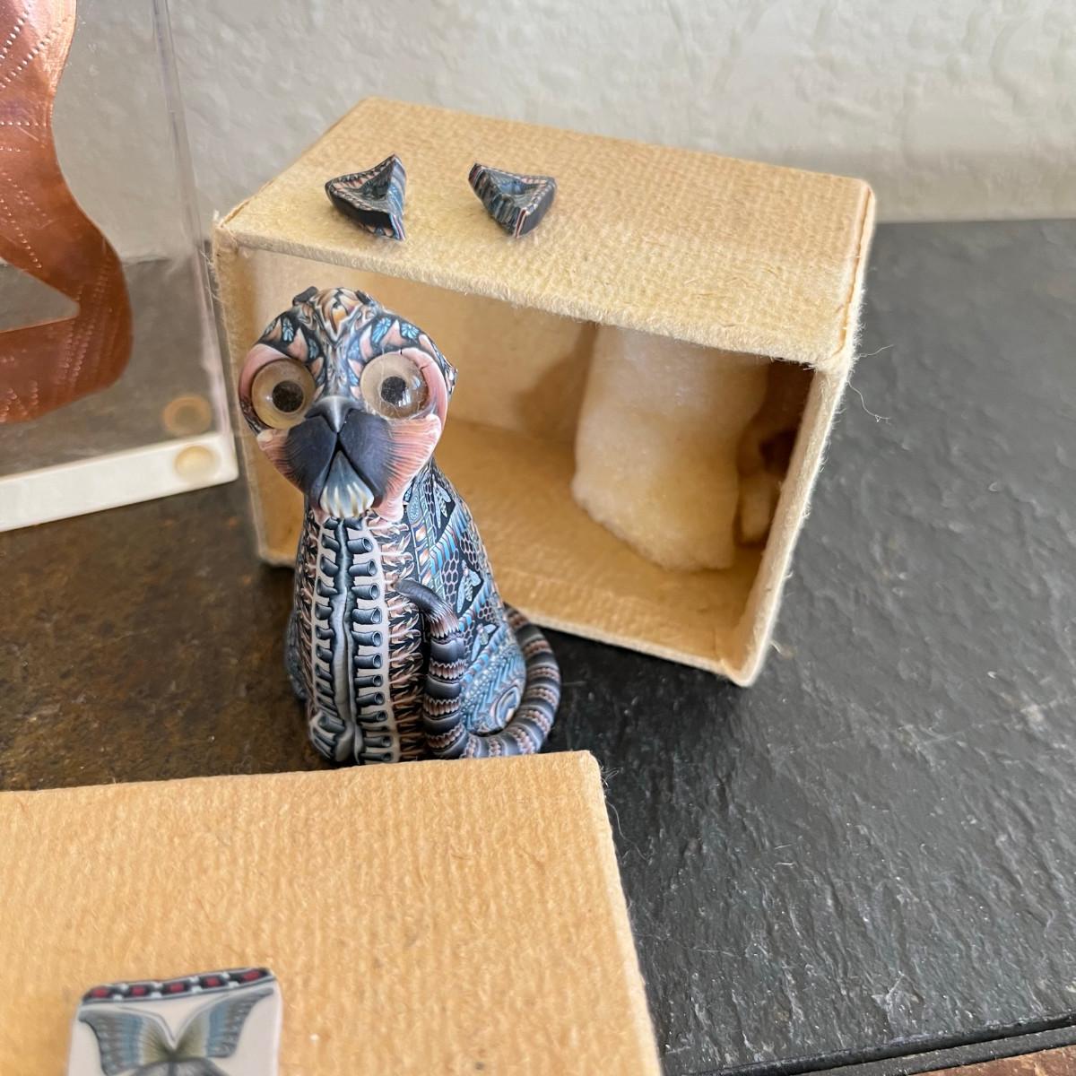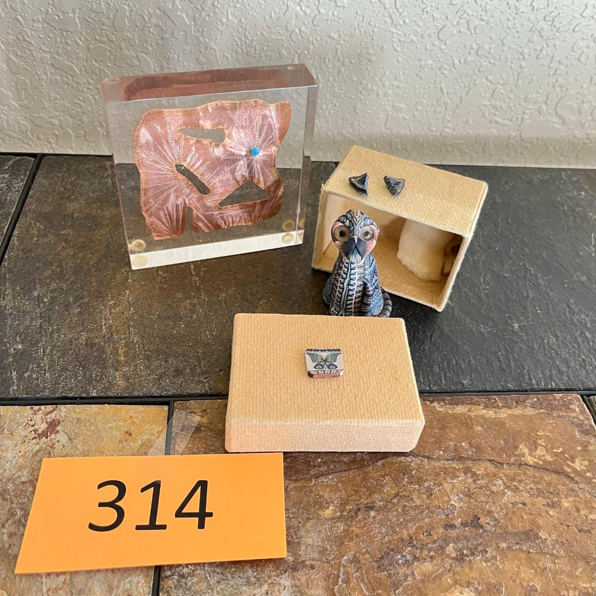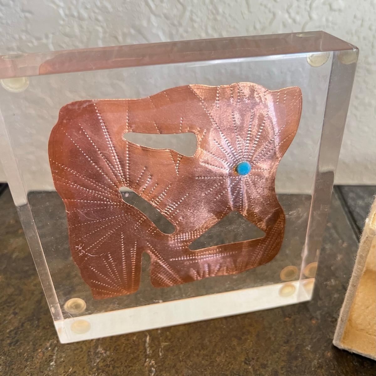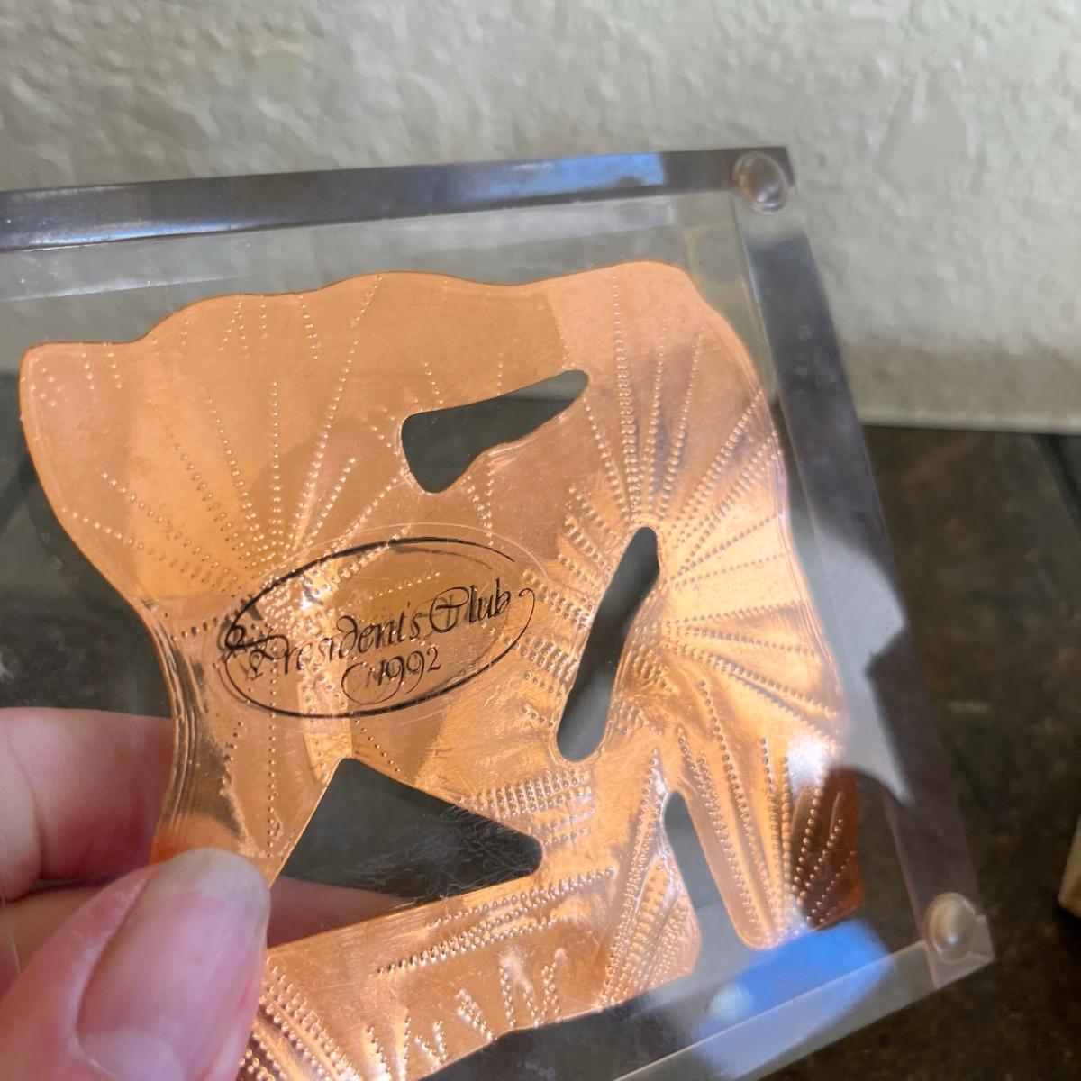 The glass cat had both ears needing re-glued. In original box. Copper paperweight is different.