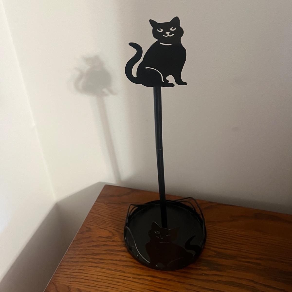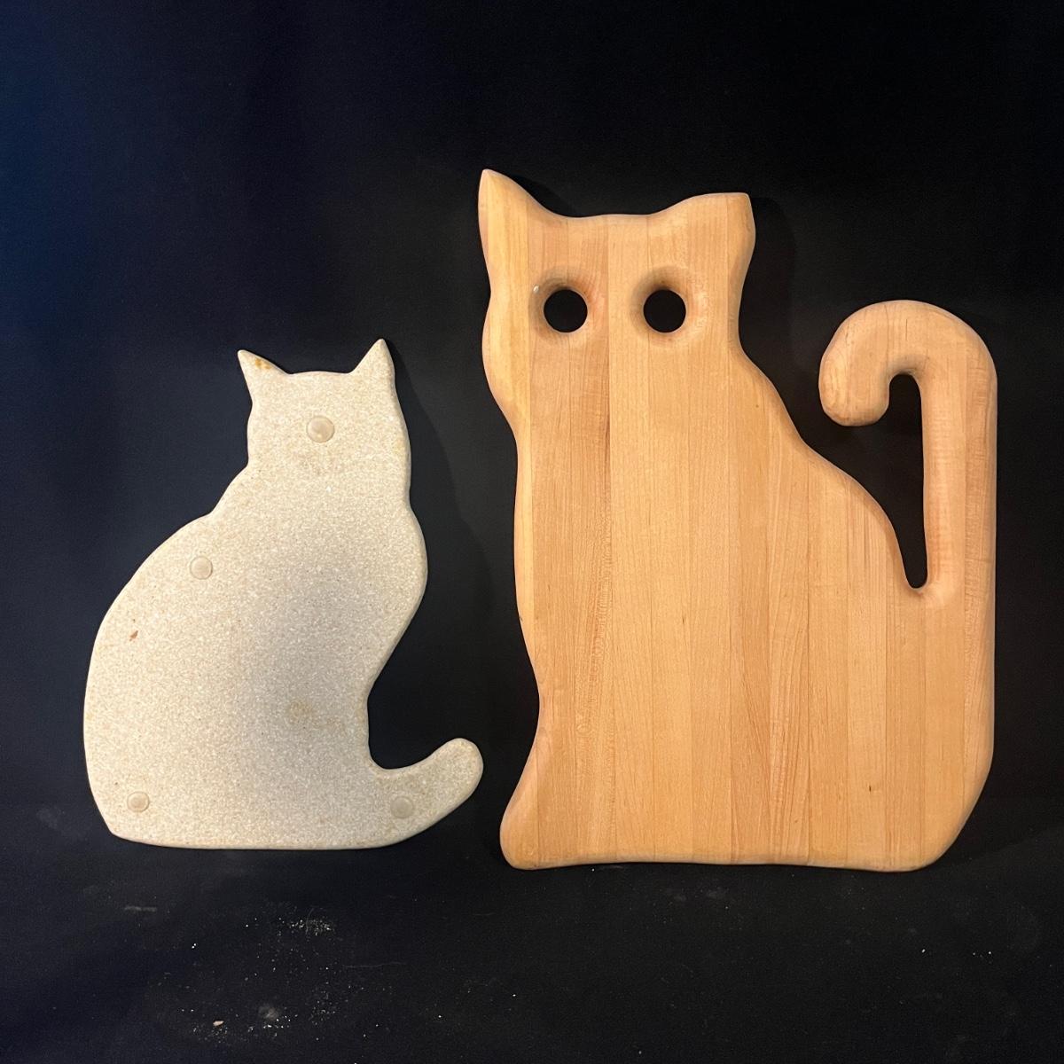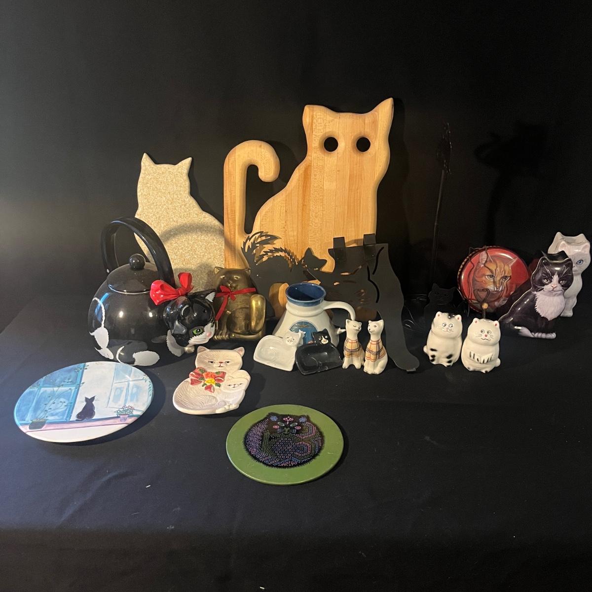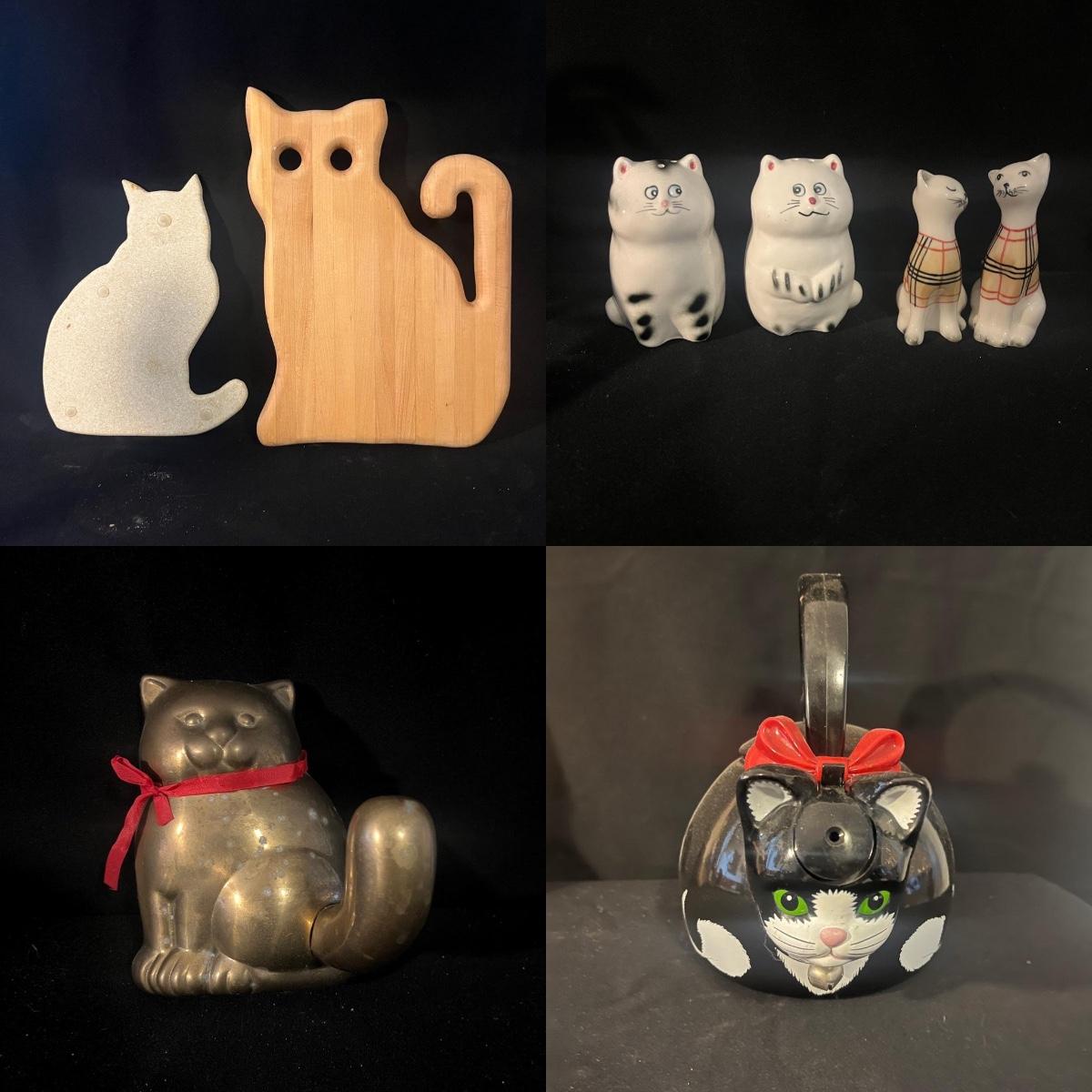 Lot contains a selection of cat kitchen decor that includes wooden and resin cutting boards, kettle, metal cat wall hooks and paper towel holder, two pairs of china salt and paper shakers (one pair being Lefton), brass cat hook and more.