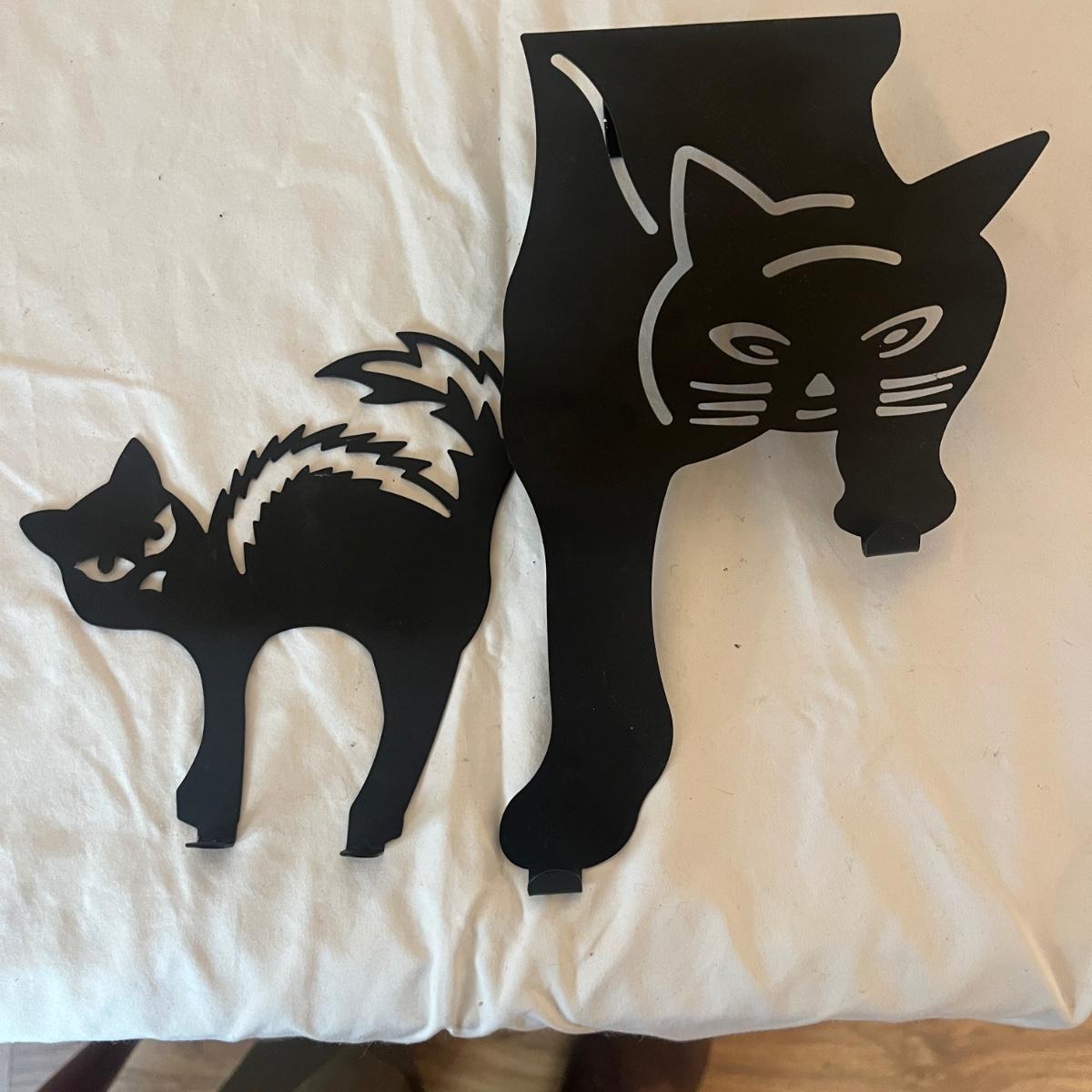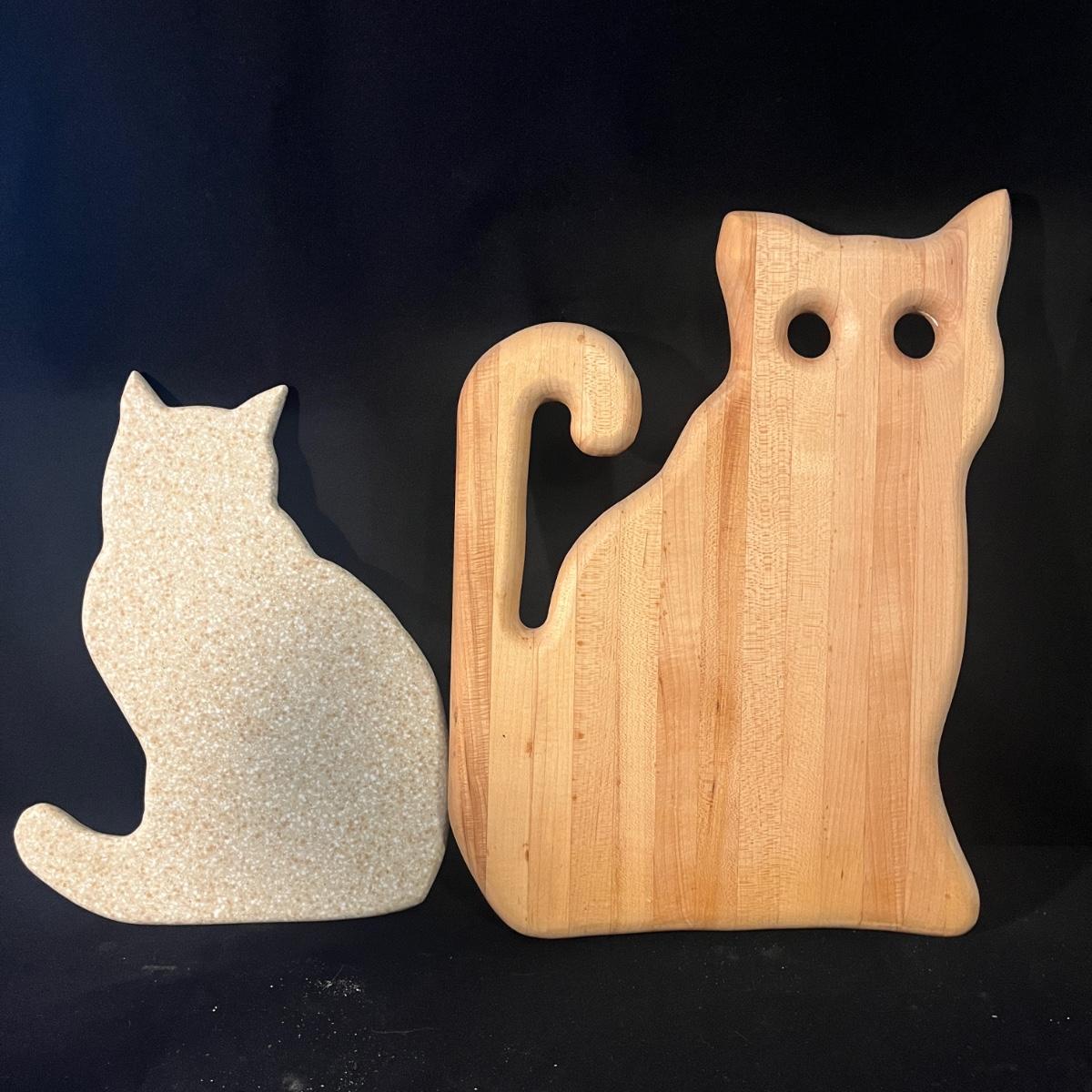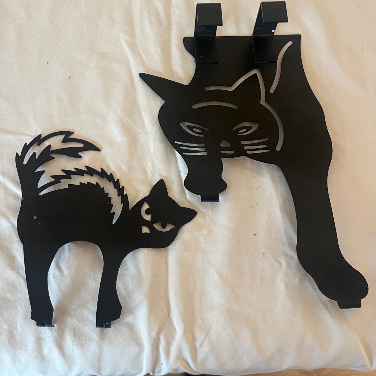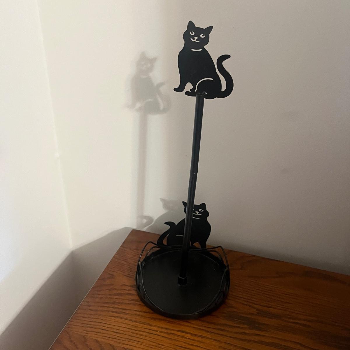 Lot contains a selection of cat kitchen decor that includes wooden and resin cutting boards, kettle, metal cat wall hooks and paper towel holder, two pairs of china salt and paper shakers (one pair being Lefton), brass cat hook and more.