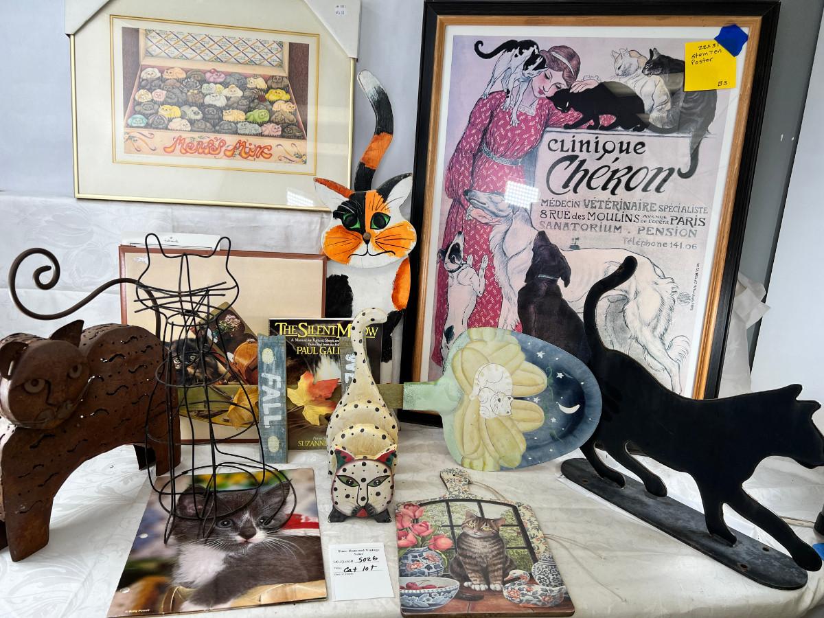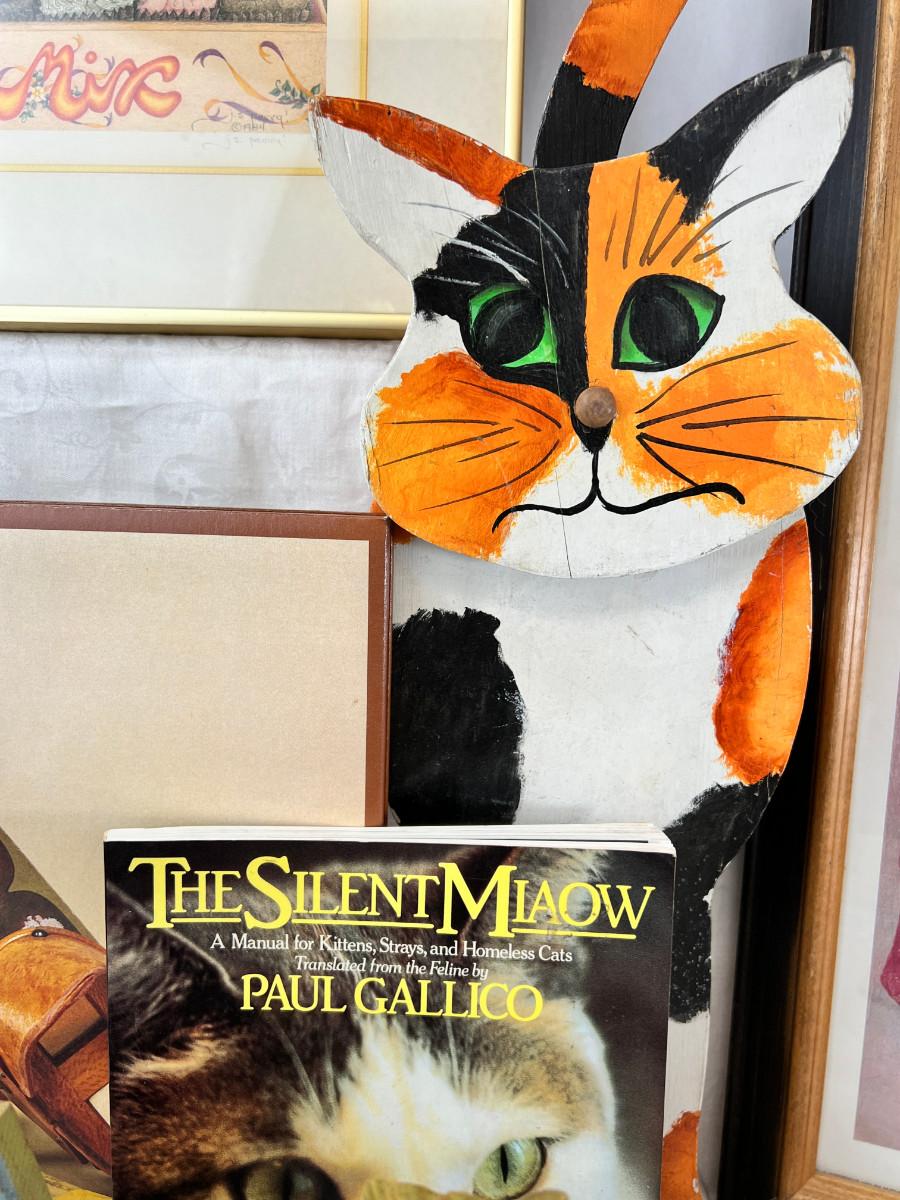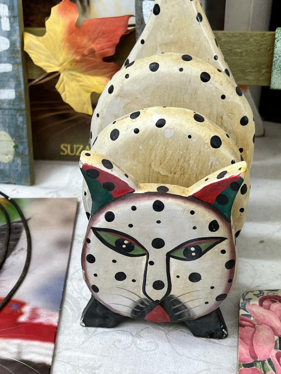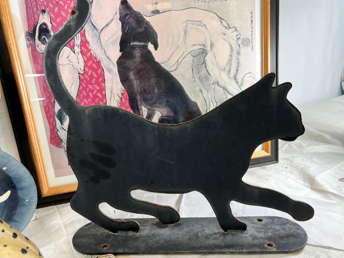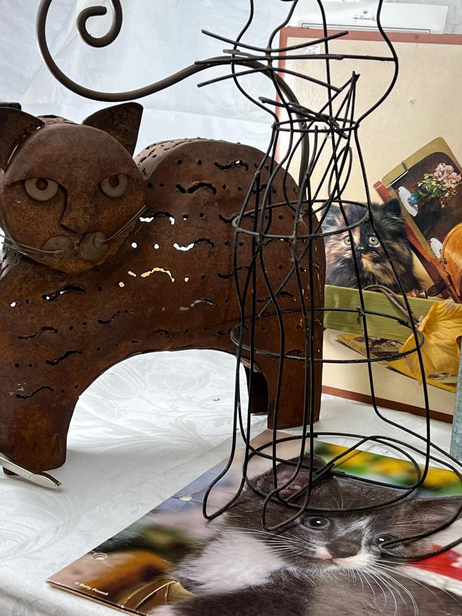 Cat decor, rusted metal candle cat, Jamie Perry Meow Mix print, Wire cat with mouse Cat metal door stop, Fall cat shovel, Wooden cats, Framed cat poster .