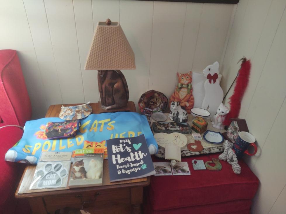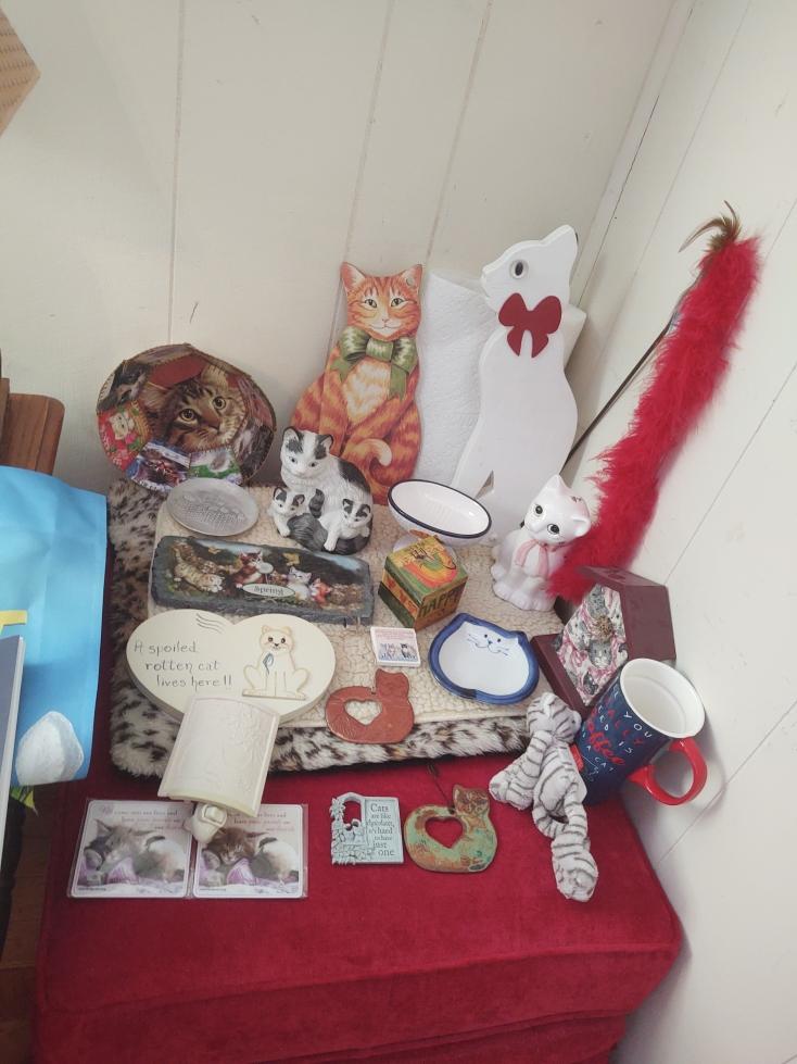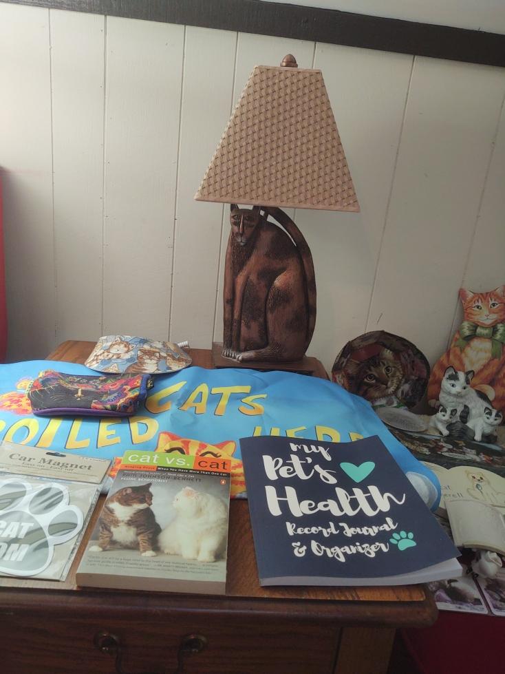 Cat themed lot has books, wooden figurines, and a nice cat lamp.