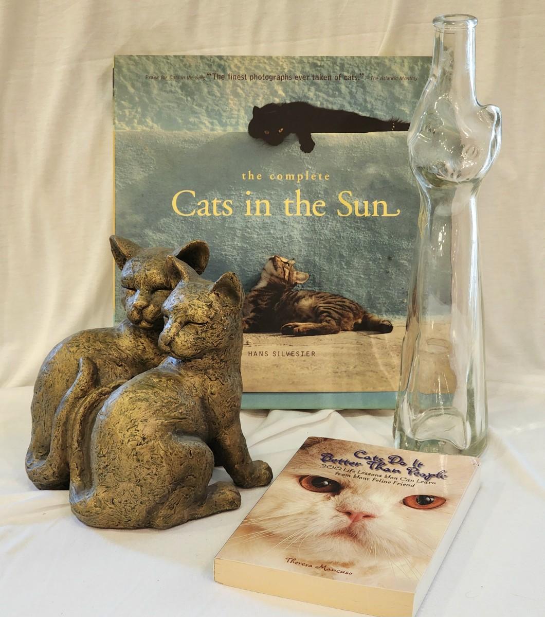 Cat Lover's Gift Lot: Cats in the Sun Coffee Table Book, Cat shaped clear bottle, Loving cats figurine, Cats do it better paperback