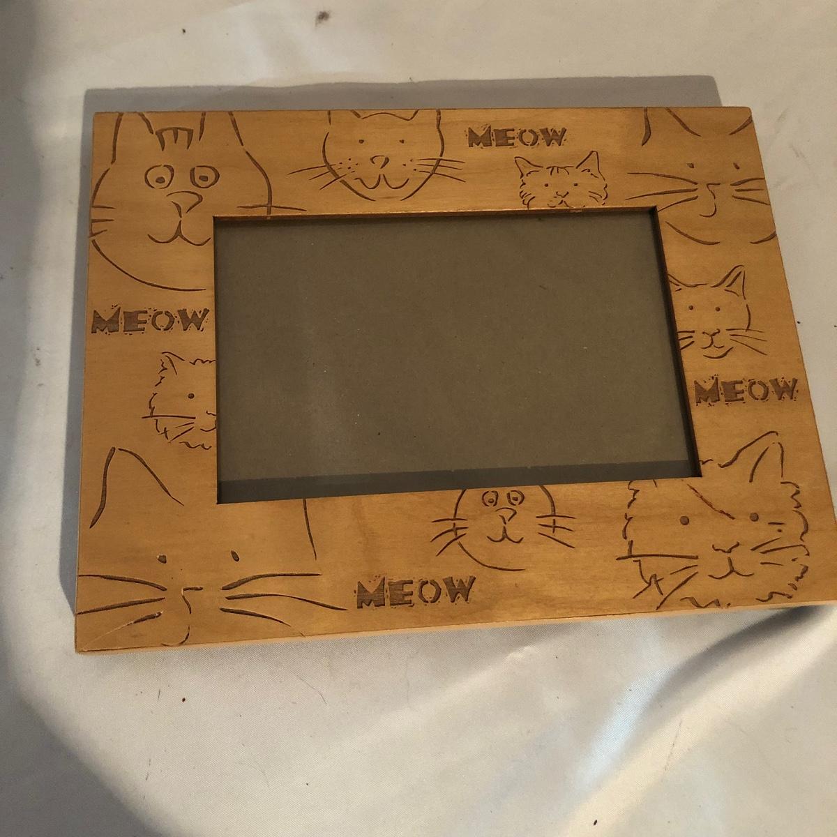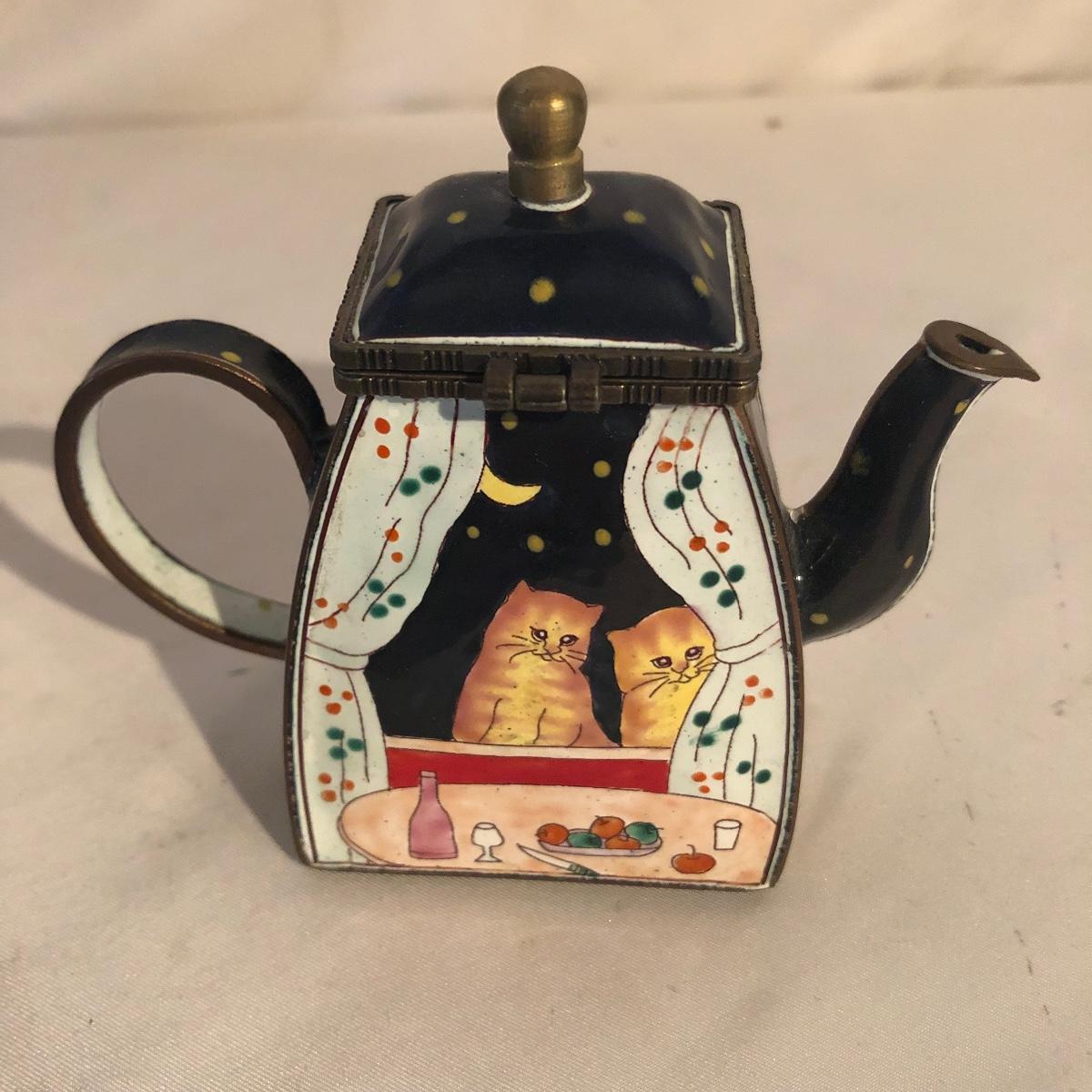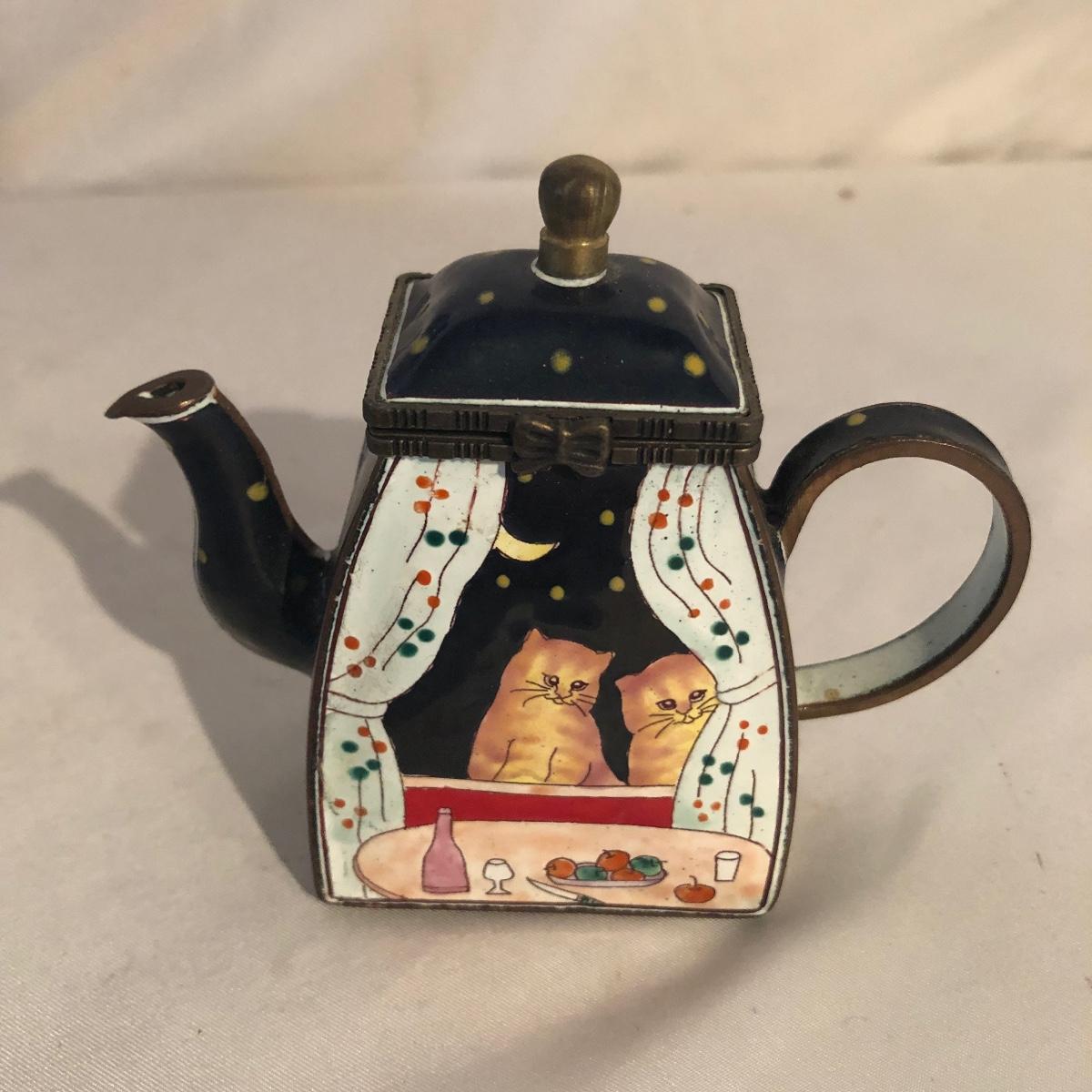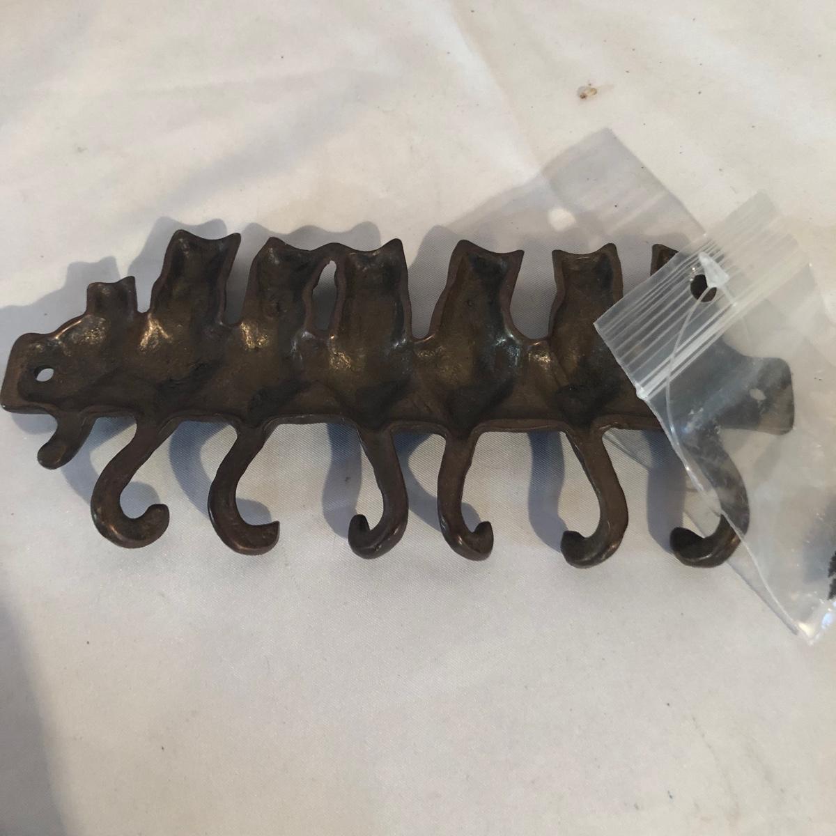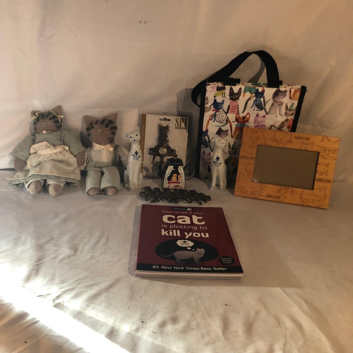 Lot includes a Kelvin Chen enameled teapot, two unmarked cat figurines, brass cat doorbell, metal cat hook, wooden frame, bag, two cat dolls and the book “ How to Tell if Your Cat is Plotting to Kill You”. Frame measures 6.5” x 8.5”.