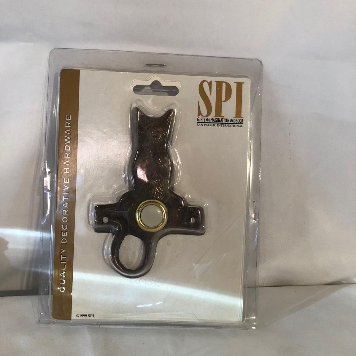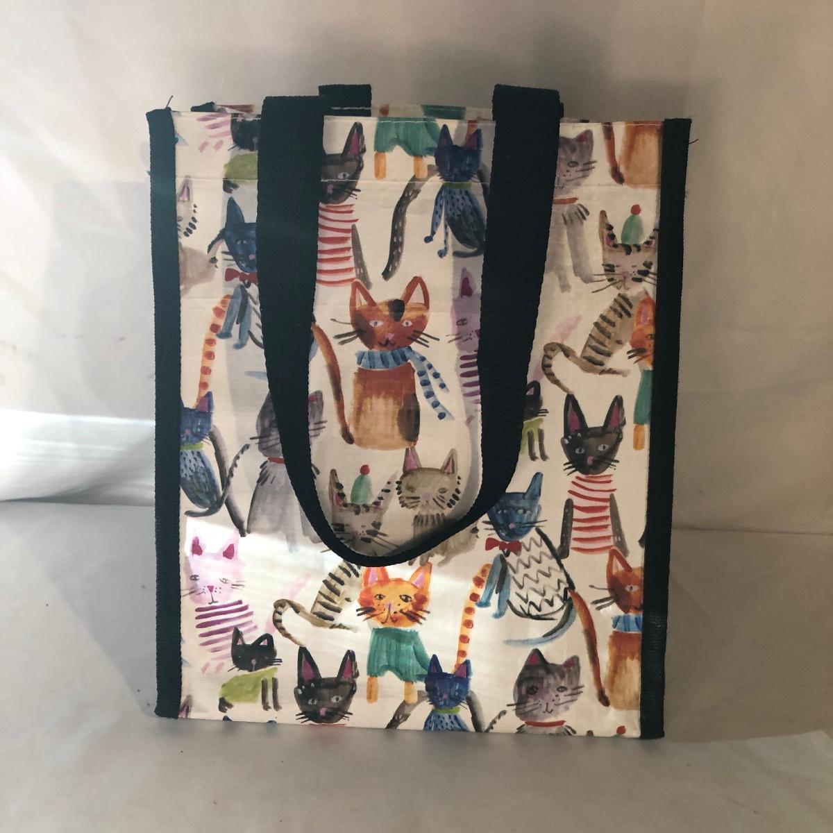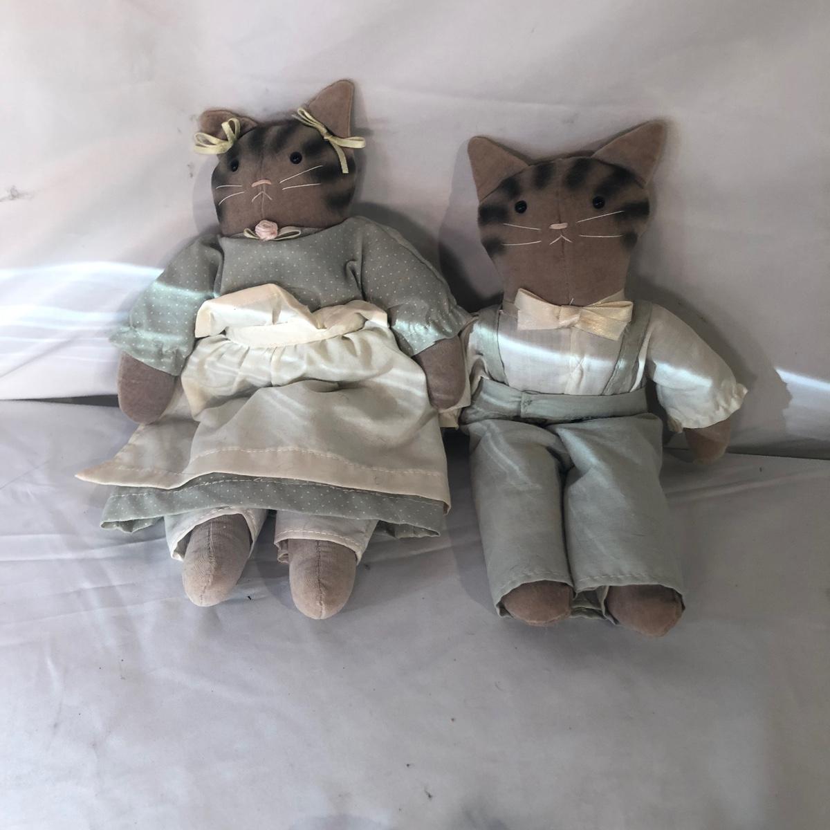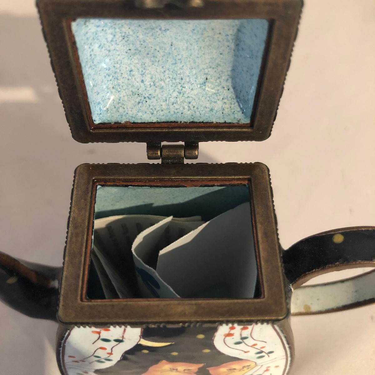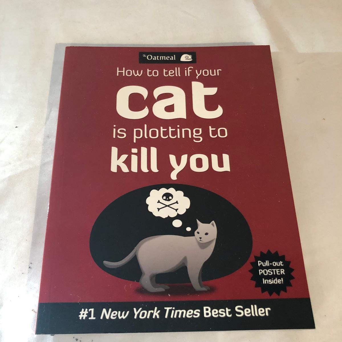 Lot includes a Kelvin Chen enameled teapot, two unmarked cat figurines, brass cat doorbell, metal cat hook, wooden frame, bag, two cat dolls and the book “ How to Tell if Your Cat is Plotting to Kill You”. Frame measures 6.5” x 8.5”.