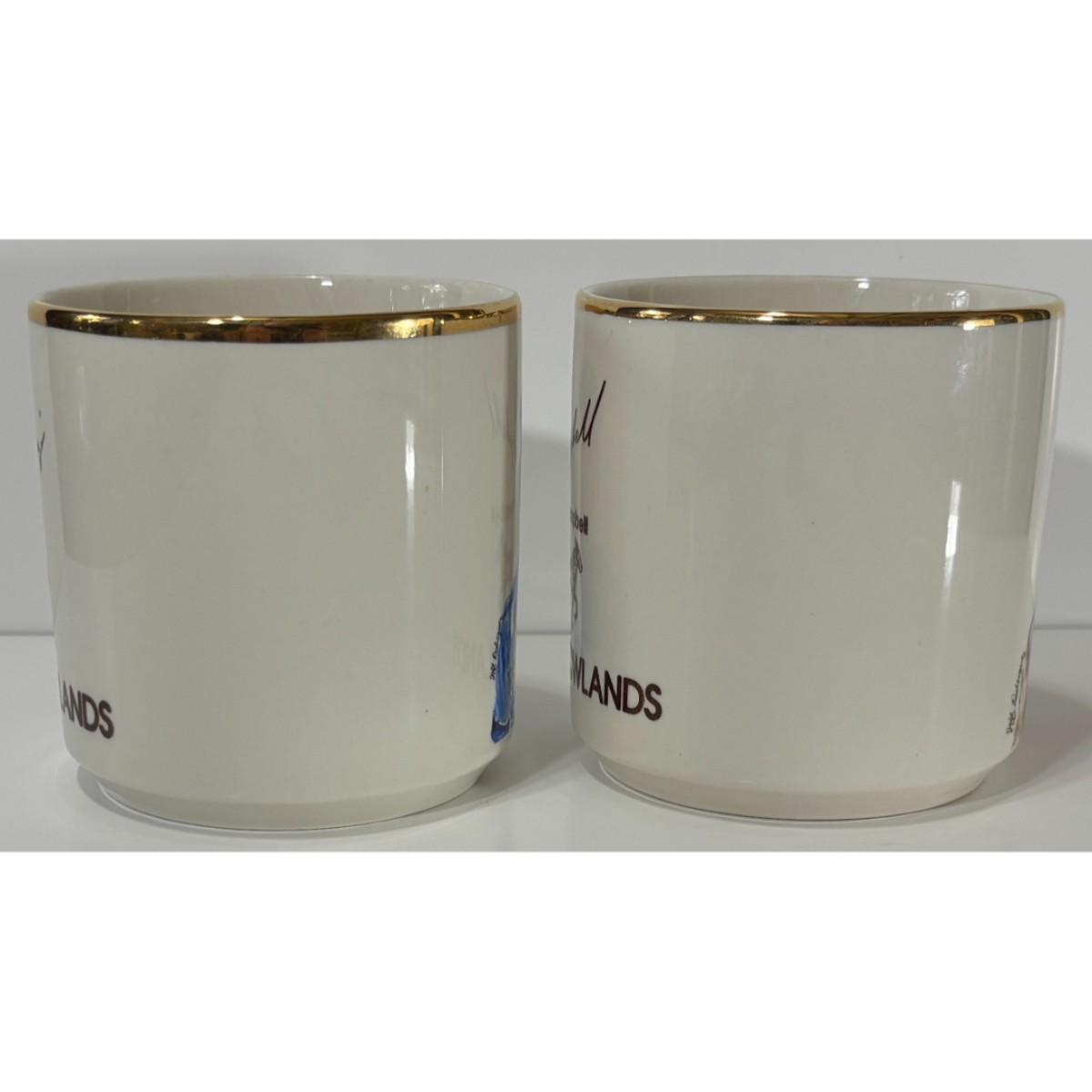 You get two mugs that are in good condition with minor surface wear. Each mug stands approximately 3 3/8" tall and has a roughly 3.25" diameter. Please see all pictures. Thank you for looking. As a reminder, if this is a lot, we do not break up lots. Also, all items are prepacked, so each item is sent individually. Any item that qualifies for media mail and weighs over one pound will be shipped via media mail. Otherwise, the item will be shipped USPS ground advantage, or UPS ground. Shipping for this item is $11.00. Items ship within two days after payment is received. Item SKU is MUG316.